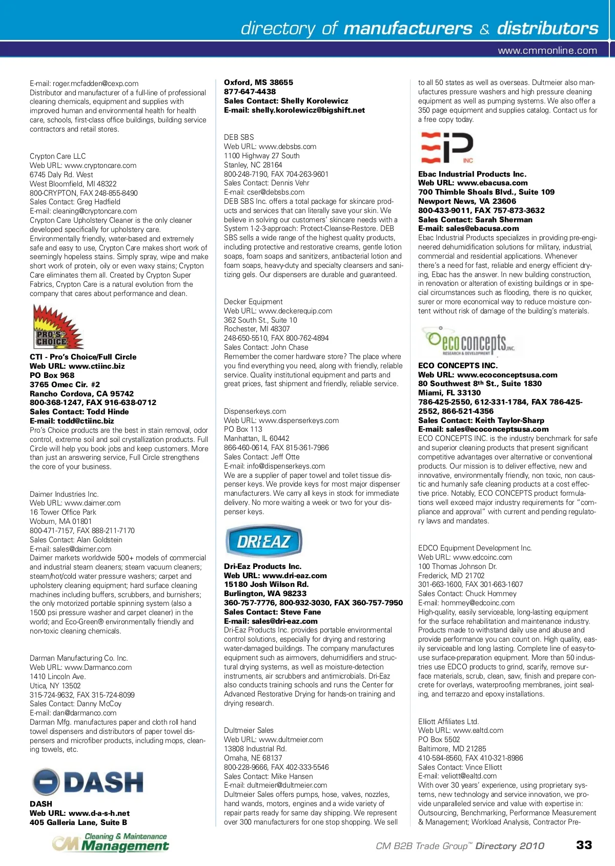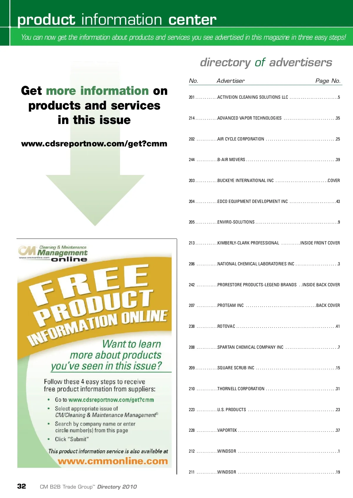 product information center You can now get the information about products and services you see advertised in this magazine in three easy steps! directory of advertisers No. Advertiser Page No. Get more information on products and services in this issue www.cdsreportnow.com/get?cmm 201 . . . . . . . . . . . .ACTIVEION CLEANING SOLUTIONS LLC . . . . . . . . . . . . . . . . . . . . . . . . . .5 214 . . . . . . . . . . . .ADVANCED VAPOR TECHNOLOGIES . . . . . . . . . . . . . . . . . . . . . . . . . . .35 202 . . . . . . . . . . .AIR CYCLE CORPORATION . . . . . . . . . . . . . . . . . . . . . . . . . . . . . . . . . . . .25 244 . . . . . . . . . . .B-AIR MOVERS . . . . . . . . . . . . . . . . . . . . . . . . . . . . . . . . . . . . . . . . . . . . . .39 203 . . . . . . . . . . . .BUCKEYE INTERNATIONAL INC . . . . . . . . . . . . . . . . . . . . . . . . . . . .COVER 204 . . . . . . . . . . . .EDCO EQUIPMENT DEVELOPMENT INC . . . . . . . . . . . . . . . . . . . . . . . . .43 205 . . . . . . . . . . . .ENVIRO-SOLUTIONS . . . . . . . . . . . . . . . . . . . . . . . . . . . . . . . . . . . . . . . . . . . .9 213 . . . . . . . . . . . .KIMBERLY-CLARK PROFESSIONAL . . . . . . . . . .INSIDE FRONT COVER 206 . . . . . . . . . . .NATIONAL CHEMICAL LABORATORIES INC . . . . . . . . . . . . . . . . . . . . . .3 242 . . . . . . . . . . .PRORESTORE PRODUCTS-LEGEND BRANDS . .INSIDE BACK COVER 207 . . . . . . . . . . .PROTEAM INC . . . . . . . . . . . . . . . . . . . . . . . . . . . . . . . . . . . .BACK COVER 238 . . . . . . . . . . .ROTOVAC . . . . . . . . . . . . . . . . . . . . . . . . . . . . . . . . . . . . . . . . . . . . . . . . . . .41 208 . . . . . . . . . . .SPARTAN CHEMICAL COMPANY INC . . . . . . . . . . . . . . . . . . . . . . . . . . .7 209 . . . . . . . . . . . .SQUARE SCRUB INC . . . . . . . . . . . . . . . . . . . . . . . . . . . . . . . . . . . . . . . . .15 210 . . . . . . . . . . .THORNELL CORPORATION . . . . . . . . . . . . . . . . . . . . . . . . . . . . . . . . . . . .31 223 . . . . . . . . . . .U.S. PRODUCTS . . . . . . . . . . . . . . . . . . . . . . . . . . . . . . . . . . . . . . . . . . . . .23 228 . . . . . . . . . . .VAPORTEK . . . . . . . . . . . . . . . . . . . . . . . . . . . . . . . . . . . . . . . . . . . . . . . . . .37 212 . . . . . . . . . . .WINDSOR . . . . . . . . . . . . . . . . . . . . . . . . . . . . . . . . . . . . . . . . . . . . . . . . . . .1 211 . . . . . . . . . . .WINDSOR . . . . . . . . . . . . . . . . . . . . . . . . . . . . . . . . . . . . . . . . . . . . . . . . . .19 32 CM B2B Trade Group ™ Directory 2010