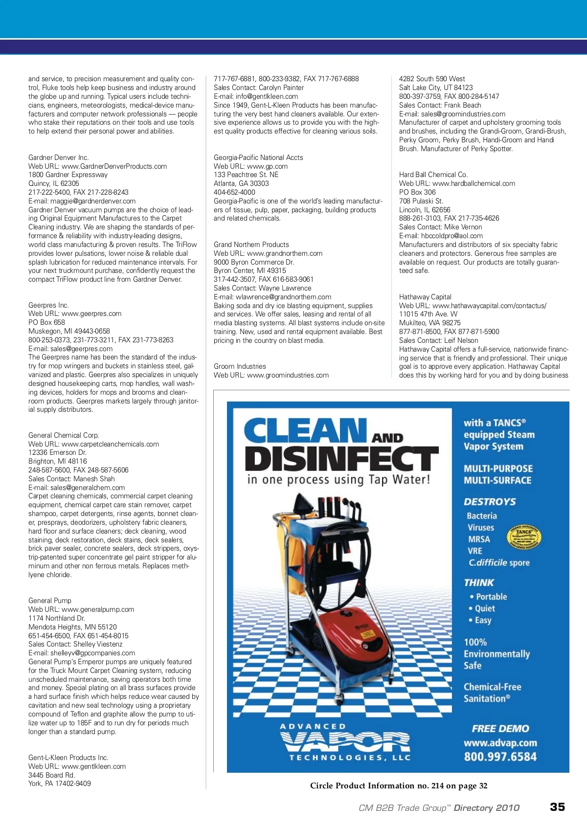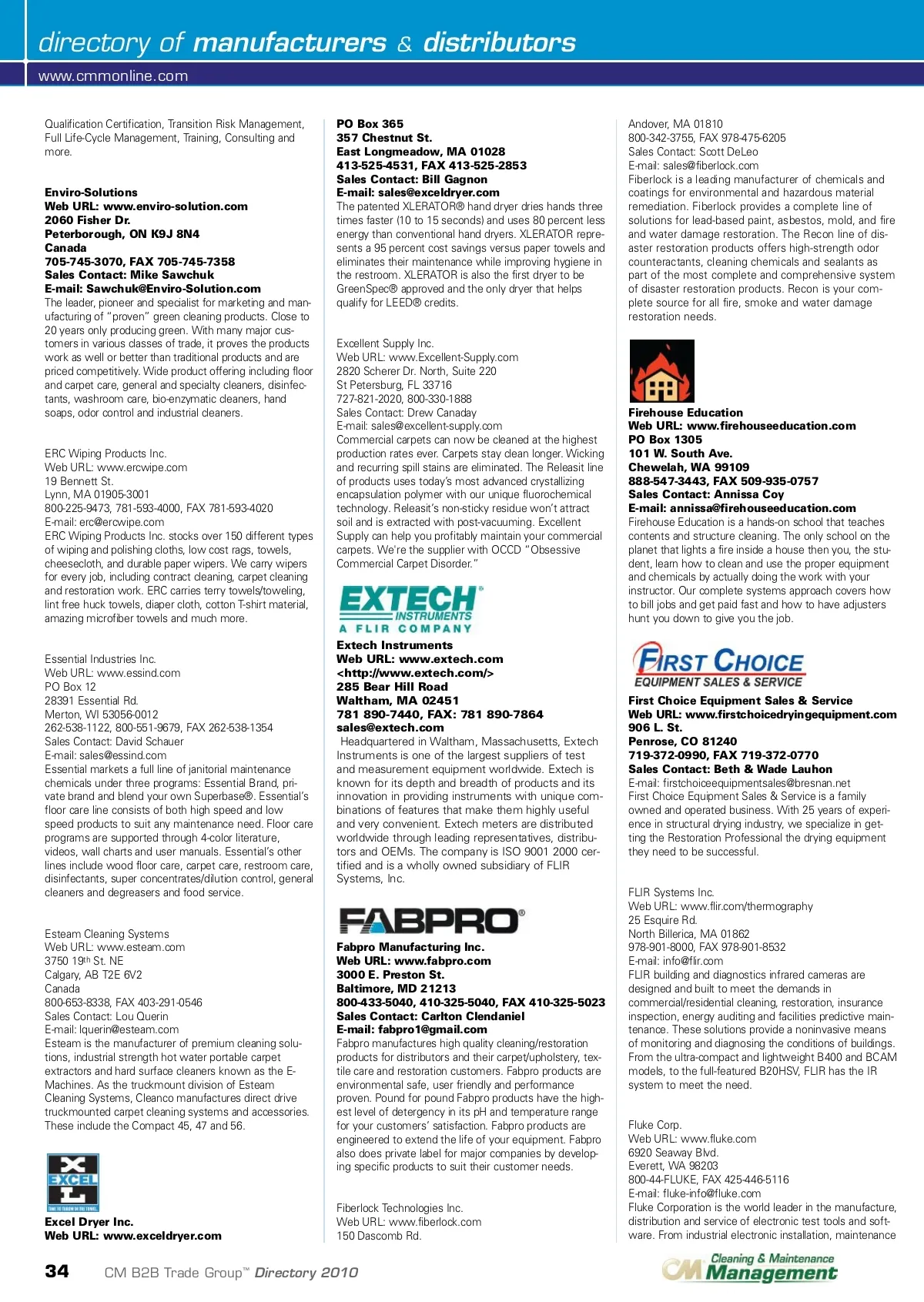 directory of manufacturers www.cmmonline.com Qualification Certification, Transition Risk Management, Full Life-Cycle Management, Training, Consulting and more. & distributors Andover, MA 01810 800-342-3755, FAX 978-475-6205 Sales Contact: Scott DeLeo E-mail: [email protected] Fiberlock is a leading manufacturer of chemicals and coatings for environmental and hazardous material remediation. Fiberlock provides a complete line of solutions for lead-based paint, asbestos, mold, and fire and water damage restoration. The Recon line of dis-aster restoration products offers high-strength odor counteractants, cleaning chemicals and sealants as part of the most complete and comprehensive system of disaster restoration products. Recon is your com-plete source for all fire, smoke and water damage restoration needs. Enviro-Solutions Web URL: www.enviro-solution.com 2060 Fisher Dr. Peterborough, ON K9J 8N4 Canada 705-745-3070, FAX 705-745-7358 Sales Contact: Mike Sawchuk E-mail: [email protected] The leader, pioneer and specialist for marketing and man-ufacturing of “proven” green cleaning products. Close to 20 years only producing green. With many major cus-tomers in various classes of trade, it proves the products work as well or better than traditional products and are priced competitively. Wide product offering including floor and carpet care, general and specialty cleaners, disinfec-tants, washroom care, bio-enzymatic cleaners, hand soaps, odor control and industrial cleaners. PO Box 365 357 Chestnut St. East Longmeadow, MA 01028 413-525-4531, FAX 413-525-2853 Sales Contact: Bill Gagnon E-mail: [email protected] The patented XLERATOR® hand dryer dries hands three times faster (10 to 15 seconds) and uses 80 percent less energy than conventional hand dryers. XLERATOR repre-sents a 95 percent cost savings versus paper towels and eliminates their maintenance while improving hygiene in the restroom. XLERATOR is also the first dryer to be GreenSpec® approved and the only dryer that helps qualify for LEED® credits. ERC Wiping Products Inc. Web URL: www.ercwipe.com 19 Bennett St. Lynn, MA 01905-3001 800-225-9473, 781-593-4000, FAX 781-593-4020 E-mail: [email protected] ERC Wiping Products Inc. stocks over 150 different types of wiping and polishing cloths, low cost rags, towels, cheesecloth, and durable paper wipers. We carry wipers for every job, including contract cleaning, carpet cleaning and restoration work. ERC carries terry towels/toweling, lint free huck towels, diaper cloth, cotton T-shirt material, amazing microfiber towels and much more. Excellent Supply Inc. Web URL: www.Excellent-Supply.com 2820 Scherer Dr. North, Suite 220 St Petersburg, FL 33716 727-821-2020, 800-330-1888 Sales Contact: Drew Canaday E-mail: [email protected] Commercial carpets can now be cleaned at the highest production rates ever. Carpets stay clean longer. Wicking and recurring spill stains are eliminated. The Releasit line of products uses today’s most advanced crystallizing encapsulation polymer with our unique fluorochemical technology. Releasit’s non-sticky residue won’t attract soil and is extracted with post-vacuuming. Excellent Supply can help you profitably maintain your commercial carpets. We're the supplier with OCCD “Obsessive Commercial Carpet Disorder.” Firehouse Education Web URL: www.firehouseeducation.com PO Box 1305 101 W. South Ave. Chewelah, WA 99109 888-547-3443, FAX 509-935-0757 Sales Contact: Annissa Coy E-mail: [email protected] Firehouse Education is a hands-on school that teaches contents and structure cleaning. The only school on the planet that lights a fire inside a house then you, the stu-dent, learn how to clean and use the proper equipment and chemicals by actually doing the work with your instructor. Our complete systems approach covers how to bill jobs and get paid fast and how to have adjusters hunt you down to give you the job. Essential Industries Inc. Web URL: www.essind.com PO Box 12 28391 Essential Rd. Merton, WI 53056-0012 262-538-1122, 800-551-9679, FAX 262-538-1354 Sales Contact: David Schauer E-mail: [email protected] Essential markets a full line of janitorial maintenance chemicals under three programs: Essential Brand, pri-vate brand and blend your own Superbase®. Essential’s floor care line consists of both high speed and low speed products to suit any maintenance need. Floor care programs are supported through 4-color literature, videos, wall charts and user manuals. Essential’s other lines include wood floor care, carpet care, restroom care, disinfectants, super concentrates/dilution control, general cleaners and degreasers and food service. Extech Instruments Web URL: www.extech.com <http://www.extech.com/> 285 Bear Hill Road Waltham, MA 02451 781 890-7440, FAX: 781 890-7864 [email protected] Headquartered in Waltham, Massachusetts, Extech Instruments is one of the largest suppliers of test and measurement equipment worldwide. Extech is known for its depth and breadth of products and its innovation in providing instruments with unique com-binations of features that make them highly useful and very convenient. Extech meters are distributed worldwide through leading representatives, distribu-tors and OEMs. The company is ISO 9001 2000 cer-tified and is a wholly owned subsidiary of FLIR Systems, Inc. First Choice Equipment Sales & Service Web URL: www.firstchoicedryingequipment.com 906 L. St. Penrose, CO 81240 719-372-0990, FAX 719-372-0770 Sales Contact: Beth & Wade Lauhon E-mail: [email protected] First Choice Equipment Sales & Service is a family owned and operated business. With 25 years of experi-ence in structural drying industry, we specialize in get-ting the Restoration Professional the drying equipment they need to be successful. Esteam Cleaning Systems Web URL: www.esteam.com 3750 19 th St. NE Calgary, AB T2E 6V2 Canada 800-653-8338, FAX 403-291-0546 Sales Contact: Lou Querin E-mail: [email protected] Esteam is the manufacturer of premium cl