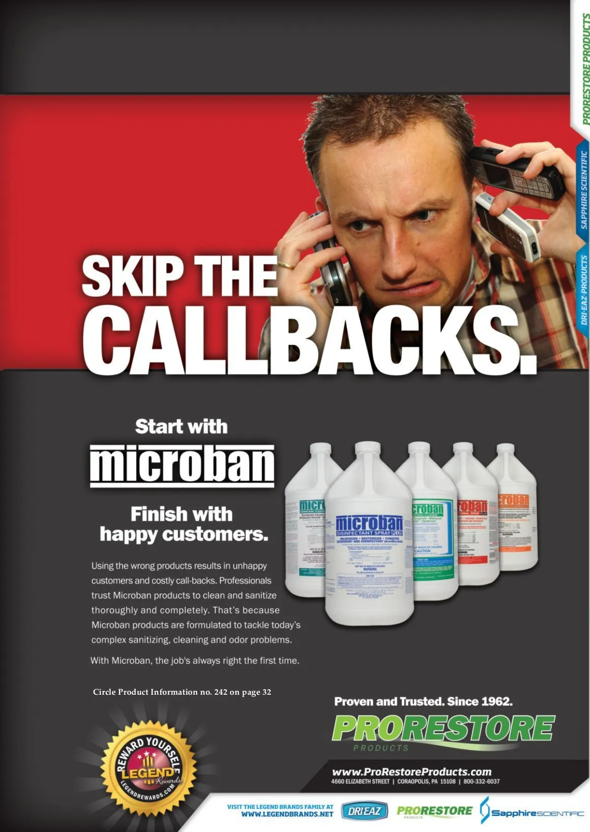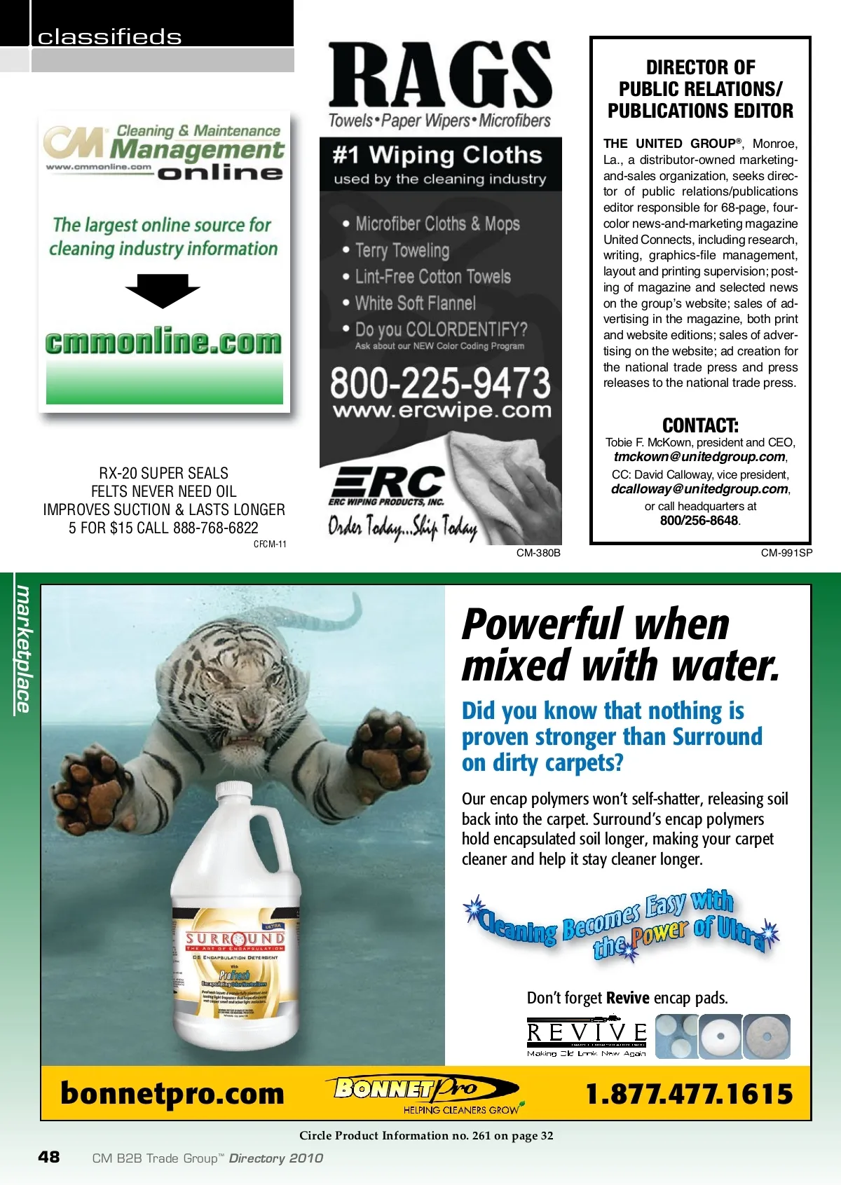 classifieds DIRECTOR OF PUBLIC RELATIONS/ PUBLICATIONS EDITOR THE UNITED GROUP ® , Monroe, La., a distributor-owned marketing-and-sales organization, seeks direc-tor of public relations/publications editor responsible for 68-page, four-color news-and-marketing magazine United Connects, including research, writing, graphics-file management, layout and printing supervision; post-ing of magazine and selected news onthe groupʼs website; sales of ad-vertising in the magazine, both print and website editions; sales of adver-tising on the website; ad creation for the national trade press and press releases to the national trade press. CONTACT: Tobie F. McKown, president and CEO, [email protected] , RX-20 SUPER SEALS FELTS NEVER NEED OIL IMPROVES SUCTION & LASTS LONGER 5 FOR $15 CALL 888-768-6822 CFCM-11 CC: David Calloway, vice president, [email protected] , or call headquarters at 800/256-8648 . CM-380B CM-991SP marketplace Powerful when mixed with water. Did you know that nothing is proven stronger than Surround on dirty carpets? Our encap polymers won’t self-shatter, releasing soil back into the carpet. Surround’s encap polymers hold encapsulated soil longer, making your carpet cleaner and help it stay cleaner longer. Don’t forget Revive encap pads. bonnetpro.com Circle Product Information no. 261 on page 32 1.877.477.1615 48 CM B2B Trade Group Directory 2010 ™