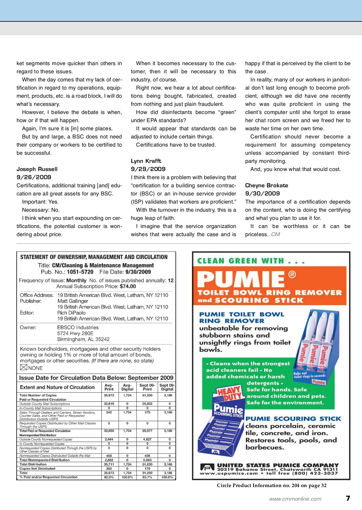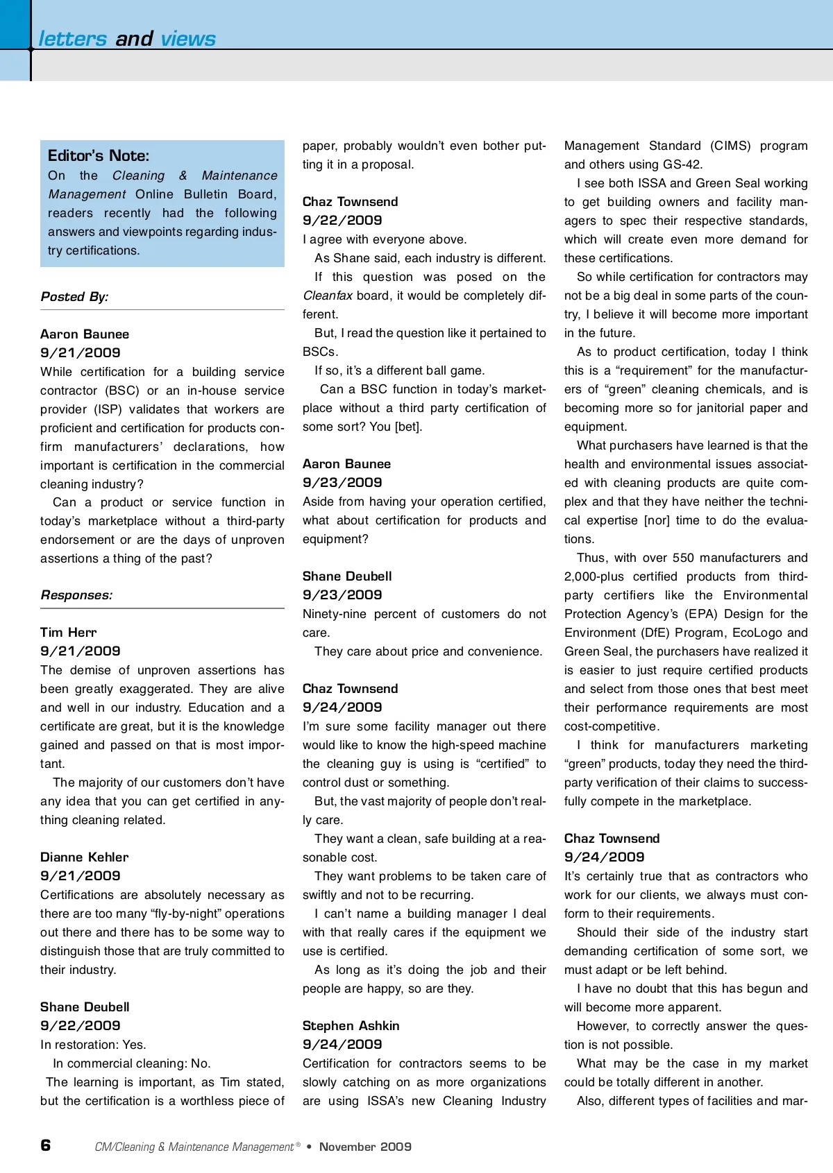 letters and views Editor’s Note: On the Cleaning & Maintenance Management Online Bulletin Board, readers recently had the following answers and viewpoints regarding indus-try certifications. paper, probably wouldnʼt even bother put-ting it in a proposal. Chaz Townsend 9/22/2009 I agree with everyone above. As Shane said, each industry is different. If this question was posed on the Cleanfax board, it would be completely dif-ferent. But, I read the question like it pertained to BSCs. If so, itʼs a different ball game. Can a BSC function in todayʼs market-place without a third party certification of some sort? You [bet]. Aaron Baunee 9/23/2009 Aside from having your operation certified, what about certification for products and equipment? Shane Deubell 9/23/2009 Ninety-nine percent of customers do not care. They care about price and convenience. Chaz Townsend 9/24/2009 Iʼm sure some facility manager out there would like to know the high-speed machine the cleaning guy is using is “certified” to control dust or something. But, the vast majority of people donʼt real-ly care. They want a clean, safe building at a rea-sonable cost. They want problems to be taken care of swiftly and not to be recurring. I canʼt name a building manager I deal with that really cares if the equipment we use is certified. As long as itʼs doing the job and their people are happy, so are they. Stephen Ashkin 9/24/2009 Certification for contractors seems to be slowly catching on as more organizations are using ISSAʼs new Cleaning Industry Posted By: Aaron Baunee 9/21/2009 While certification for a building service contractor (BSC) or an in-house service provider (ISP) validates that workers are proficient and certification for products con-firm manufacturersʼ declarations, how important is certification in the commercial cleaning industry? Can a product or service function in todayʼs marketplace without a third-party endorsement or are the days of unproven assertions a thing of the past? Responses: Tim Herr 9/21/2009 The demise of unproven assertions has been greatly exaggerated. They are alive and well in our industry. Education and a certificate are great, but it is the knowledge gained and passed on that is most impor-tant. The majority of our customers donʼt have any idea that you can get certified in any-thing cleaning related. Dianne Kehler 9/21/2009 Certifications are absolutely necessary as there are too many “fly-by-night” operations out there and there has to be some way to distinguish those that are truly committed to their industry. Shane Deubell 9/22/2009 In restoration: Yes. In commercial cleaning: No. The learning is important, as Tim stated, but the certification is a worthless piece of Management Standard (CIMS) program and others using GS-42. I see both ISSA and Green Seal working to get building owners and facility man-agers to spec their respective standards, which will create even more demand for these certifications. So while certification for contractors may not be a big deal in some parts of the coun-try, I believe it will become more important in the future. As to product certification, today I think this is a “requirement” for the manufactur-ers of “green” cleaning chemicals, and is becoming more so for janitorial paper and equipment. What purchasers have learned is that the health and environmental issues associat-ed with cleaning products are quite com-plex and that they have neither the techni-cal expertise [nor] time to do the evalua-tions. Thus, with over 550 manufacturers and 2,000-plus certified products from third-party certifiers like the Environmental Protection Agencyʼs (EPA) Design for the Environment (DfE) Program, EcoLogo and Green Seal, the purchasers have realized it is easier to just require certified products and select from those ones that best meet their performance requirements are most cost-competitive. I think for manufacturers marketing “green” products, today they need the third-party verification of their claims to success-fully compete in the marketplace. Chaz Townsend 9/24/2009 Itʼs certainly true that as contractors who work for our clients, we always must con-form to their requirements. Should their side of the industry start demanding certification of some sort, we must adapt or be left behind. I have no doubt that this has begun and will become more apparent. However, to correctly answer the ques-tion is not possible. What may be the case in my market could be totally different in another. Also, different types of facilities and mar-6 CM/Cleaning & Maintenance Management ® • November 2009
