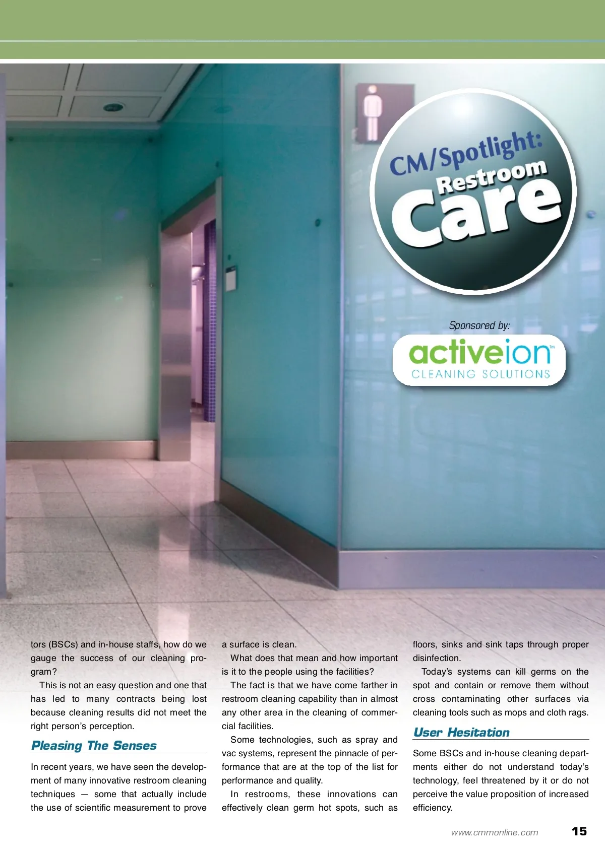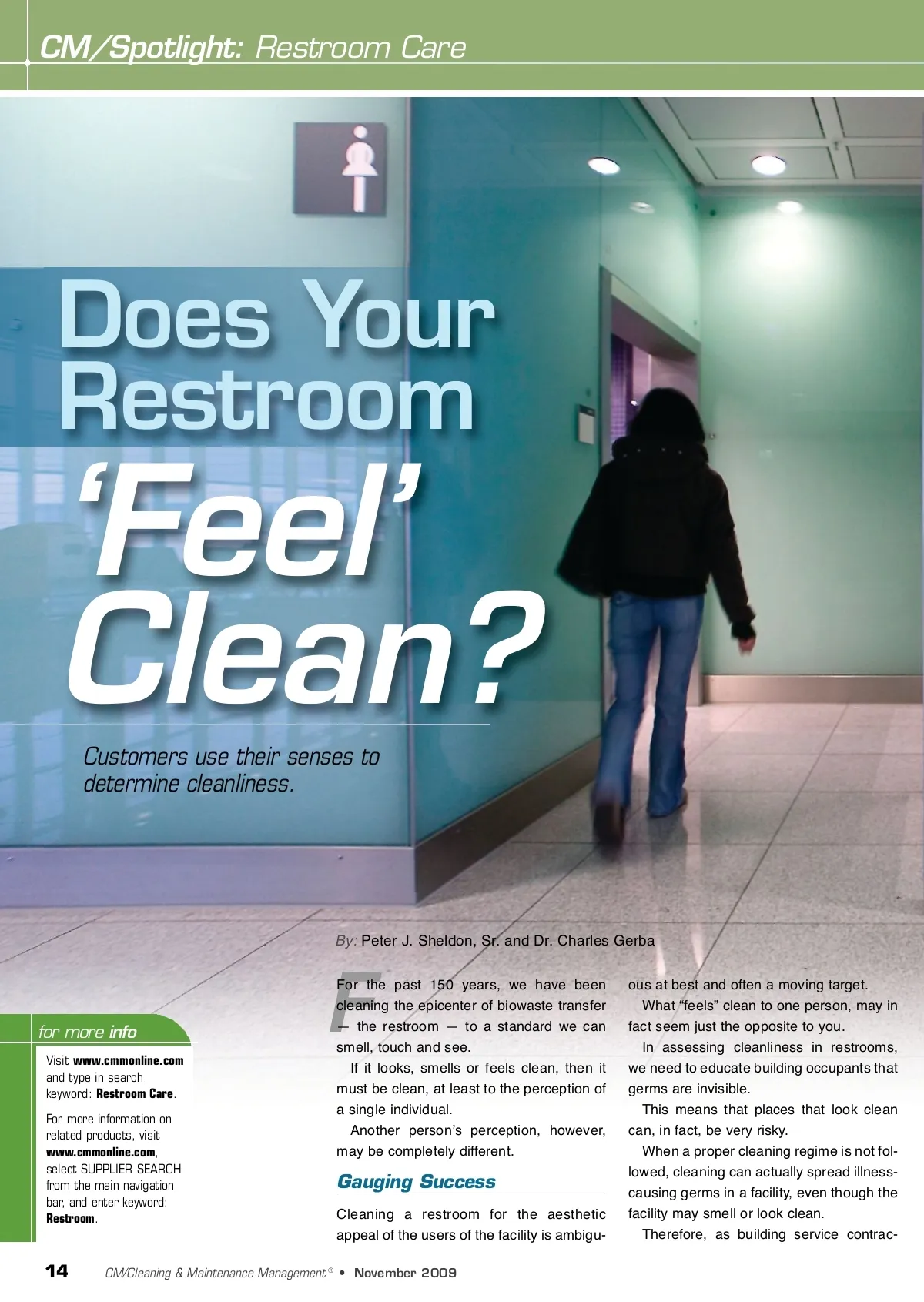 CM/Spotlight: Restroom Care Does Your Restroom ‘Feel’ Clean? Customers use their senses to determine cleanliness. By: Peter J. Sheldon, Sr. and Dr. Charles Gerba for more info Visit www.cmmonline.com and type in search keyword: Restroom Care . For more information on related products, visit www.cmmonline.com , select SUPPLIER SEARCH from the main navigation bar, and enter keyword: Restroom . F For the past 150 years, we have been cleaning the epicenter of biowaste transfer — the restroom — to a standard we can smell, touch and see. If it looks, smells or feels clean, then it must be clean, at least to the perception of a single individual. Another personʼs perception, however, may be completely different. Gauging Success Cleaning a restroom for the aesthetic appeal of the users of the facility is ambigu-ous at best and often a moving target. What “feels” clean to one person, may in fact seem just the opposite to you. In assessing cleanliness in restrooms, we need to educate building occupants that germs are invisible. This means that places that look clean can, in fact, be very risky. When a proper cleaning regime is not fol-lowed, cleaning can actually spread illness-causing germs in a facility, even though the facility may smell or look clean. Therefore, as building service contrac-14 CM/Cleaning & Maintenance Management ® • November 2009