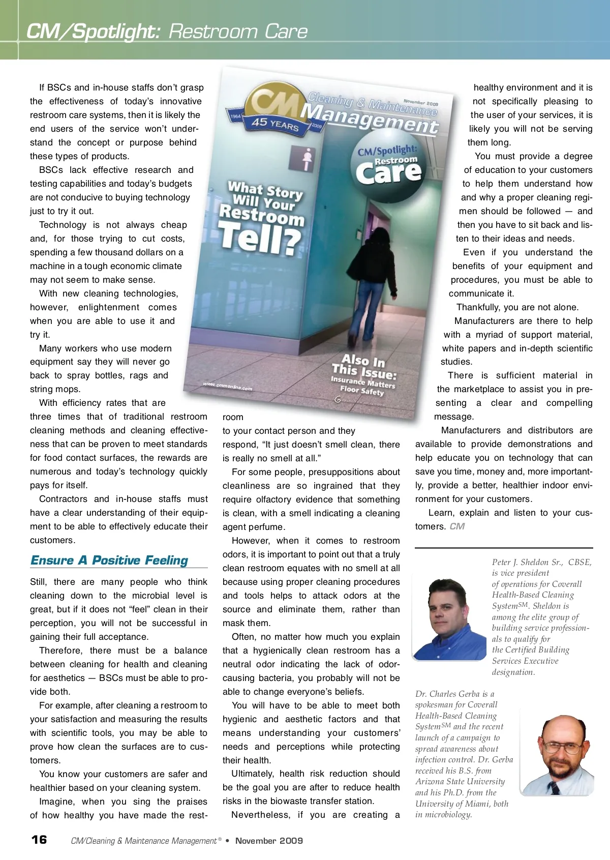 CM/Spotlight: Restroom Care If BSCs and in-house staffs donʼt grasp the effectiveness of todayʼs innovative restroom care systems, then it is likely the end users of the service wonʼt under-stand the concept or purpose behind these types of products. BSCs lack effective research and testing capabilities and todayʼs budgets are not conducive to buying technology just to try it out. Technology is not always cheap and, for those trying to cut costs, spending a few thousand dollars on a machine in a tough economic climate may not seem to make sense. With new cleaning technologies, however, enlightenment comes when you are able to use it and try it. Many workers who use modern equipment say they will never go back to spray bottles, rags and www.cm monline.co m string mops. V G With efficiency rates that are three times that of traditional restroom room cleaning methods and cleaning effective-to your contact person and they ness that can be proven to meet standards respond, “It just doesnʼt smell clean, there for food contact surfaces, the rewards are is really no smell at all.” numerous and todayʼs technology quickly For some people, presuppositions about pays for itself. cleanliness are so ingrained that they Contractors and in-house staffs must require olfactory evidence that something have a clear understanding of their equip-is clean, with a smell indicating a cleaning ment to be able to effectively educate their agent perfume. customers. However, when it comes to restroom odors, it is important to point out that a truly Ensure A Positive Feeling clean restroom equates with no smell at all because using proper cleaning procedures Still, there are many people who think and tools helps to attack odors at the cleaning down to the microbial level is source and eliminate them, rather than great, but if it does not “feel” clean in their mask them. perception, you will not be successful in Often, no matter how much you explain gaining their full acceptance. that a hygienically clean restroom has a Therefore, there must be a balance neutral odor indicating the lack of odor-between cleaning for health and cleaning causing bacteria, you probably will not be for aesthetics — BSCs must be able to pro-able to change everyoneʼs beliefs. vide both. You will have to be able to meet both For example, after cleaning a restroom to hygienic and aesthetic factors and that your satisfaction and measuring the results means understanding your customersʼ with scientific tools, you may be able to needs and perceptions while protecting prove how clean the surfaces are to cus-their health. tomers. Ultimately, health risk reduction should You know your customers are safer and be the goal you are after to reduce health healthier based on your cleaning system. risks in the biowaste transfer station. Imagine, when you sing the praises Nevertheless, if you are creating a of how healthy you have made the rest-GRAND VIEW M EDIA GROUP November 2009 healthy environment and it is not specifically pleasing to the user of your services, it is likely you will not be serving them long. You must provide a degree of education to your customers to help them understand how and why a proper cleaning regi-men should be followed — and then you have to sit back and lis-ten to their ideas and needs. Even if you understand the benefits of your equipment and procedures, you must be able to communicate it. Thankfully, you are not alone. Manufacturers are there to help with a myriad of support material, white papers and in-depth scientific studies. There is sufficient material in the marketplace to assist you in pre-senting a clear and compelling message. Manufacturers and distributors are available to provide demonstrations and help educate you on technology that can save you time, money and, more important-ly, provide a better, healthier indoor envi-ronment for your customers. Learn, explain and listen to your cus-tomers. CM Peter J. Sheldon Sr., CBSE, is vice president of operations for Coverall Health-Based Cleaning System SM . Sheldon is among the elite group of building service profession-als to qualify for the Certified Building Services Executive designation. Dr. Charles Gerba is a spokesman for Coverall Health-Based Cleaning System SM and the recent launch of a campaign to spread awareness about infection control. Dr. Gerba received his B.S. from Arizona State University and his Ph.D. from the University of Miami, both in microbiology. 16 CM/Cleaning & Maintenance Management ® • November 2009
