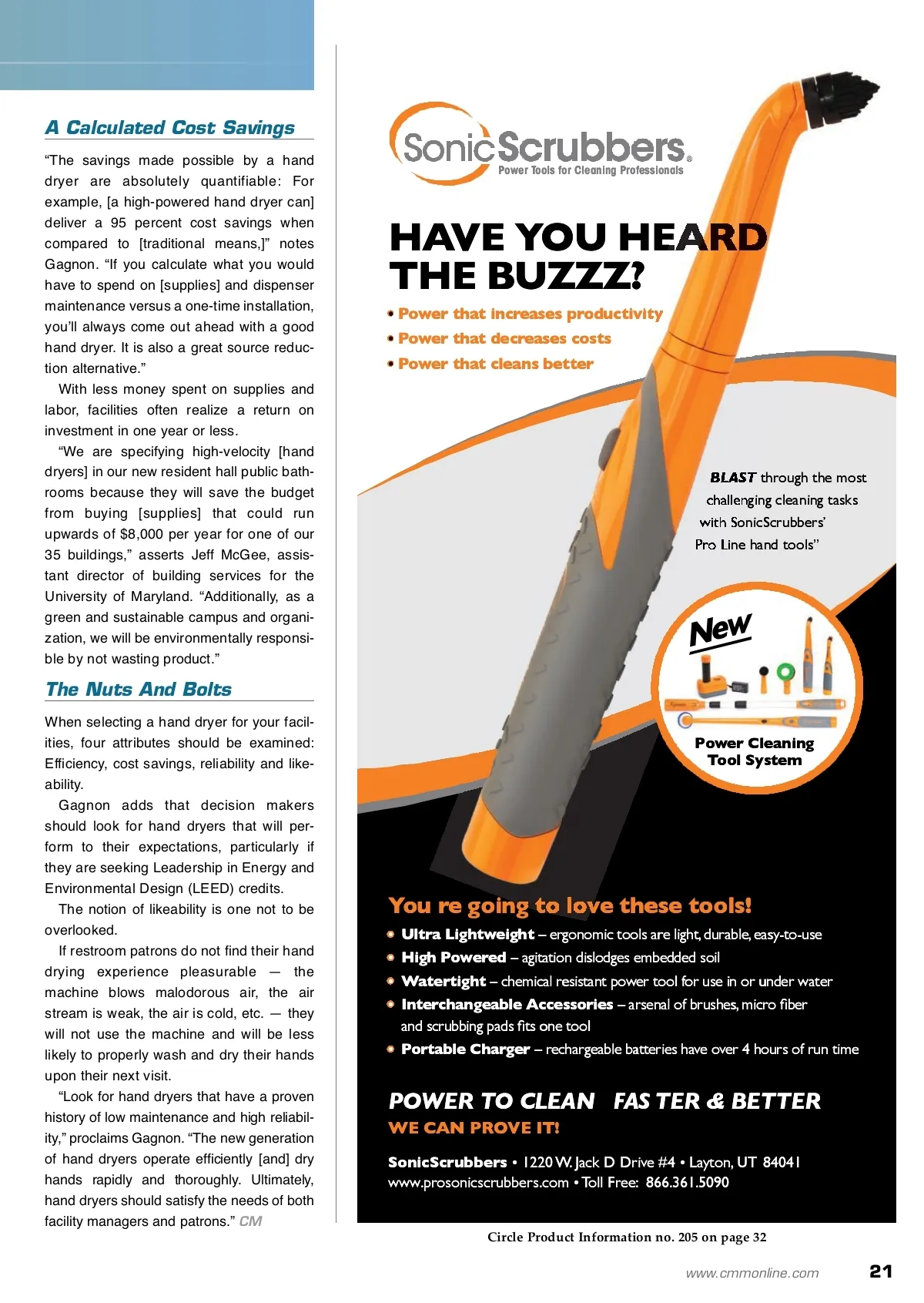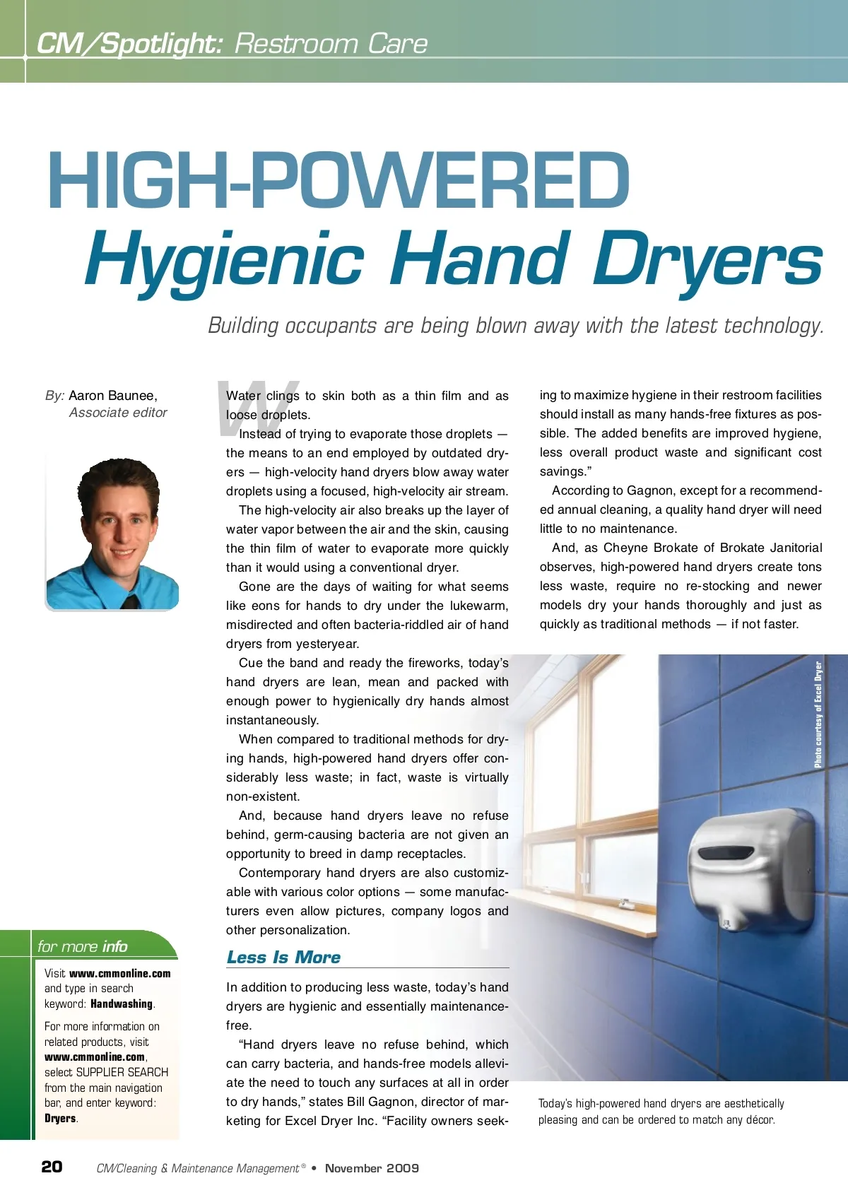 CM/Spotlight: Restroom Care HIGH-POWERED Hygienic Hand Dryers Building occupants are being blown away with the latest technology. By: Aaron Baunee, Associate editor W Water clings to skin both as a thin film and as loose droplets. Instead of trying to evaporate those droplets — the means to an end employed by outdated dry-ers — high-velocity hand dryers blow away water droplets using a focused, high-velocity air stream. The high-velocity air also breaks up the layer of water vapor between the air and the skin, causing the thin film of water to evaporate more quickly than it would using a conventional dryer. Gone are the days of waiting for what seems like eons for hands to dry under the lukewarm, misdirected and often bacteria-riddled air of hand dryers from yesteryear. Cue the band and ready the fireworks, todayʼs hand dryers are lean, mean and packed with enough power to hygienically dry hands almost instantaneously. When compared to traditional methods for dry-ing hands, high-powered hand dryers offer con-siderably less waste; in fact, waste is virtually non-existent. And, because hand dryers leave no refuse behind, germ-causing bacteria are not given an opportunity to breed in damp receptacles. Contemporary hand dryers are also customiz-able with various color options — some manufac-turers even allow pictures, company logos and other personalization. ing to maximize hygiene in their restroom facilities should install as many hands-free fixtures as pos-sible. The added benefits are improved hygiene, less overall product waste and significant cost savings.” According to Gagnon, except for a recommend-ed annual cleaning, a quality hand dryer will need little to no maintenance. And, as Cheyne Brokate of Brokate Janitorial observes, high-powered hand dryers create tons less waste, require no re-stocking and newer models dry your hands thoroughly and just as quickly as traditional methods — if not faster. Photo courtesy of Excel Dryer for more info Visit www.cmmonline.com and type in search keyword: Handwashing . For more information on related products, visit www.cmmonline.com , select SUPPLIER SEARCH from the main navigation bar, and enter keyword: Dryers . Less Is More In addition to producing less waste, todayʼs hand dryers are hygienic and essentially maintenance-free. “Hand dryers leave no refuse behind, which can carry bacteria, and hands-free models allevi-ate the need to touch any surfaces at all in order to dry hands,” states Bill Gagnon, director of mar-keting for Excel Dryer Inc. “Facility owners seek-Today’s high-powered hand dryers are aesthetically pleasing and can be ordered to match any décor. 20 CM/Cleaning & Maintenance Management ® • November 2009