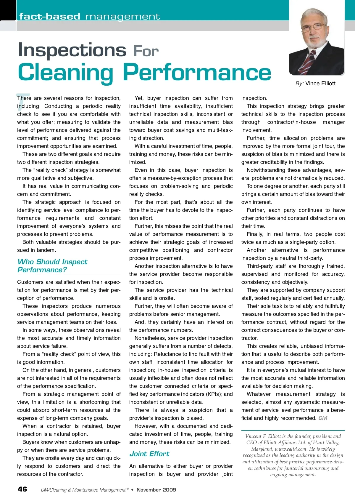 fact-based management Inspections There are several reasons for inspection, including: Conducting a periodic reality check to see if you are comfortable with what you offer; measuring to validate the level of performance delivered against the commitment; and ensuring that process improvement opportunities are examined. These are two different goals and require two different inspection strategies. The “reality check” strategy is somewhat more qualitative and subjective. It has real value in communicating con-cern and commitment. The strategic approach is focused on identifying service level compliance to per-formance requirements and constant improvement of everyoneʼs systems and processes to prevent problems. Both valuable strategies should be pur-sued in tandem. For By: Vince Elliott Yet, buyer inspection can suffer from insufficient time availability, insufficient technical inspection skills, inconsistent or unreliable data and measurement bias toward buyer cost savings and multi-task-ing distraction. With a careful investment of time, people, training and money, these risks can be min-imized. Even in this case, buyer inspection is often a measure-by-exception process that focuses on problem-solving and periodic reality checks. For the most part, thatʼs about all the time the buyer has to devote to the inspec-tion effort. Further, this misses the point that the real value of performance measurement is to achieve their strategic goals of increased competitive positioning and contractor process improvement. Another inspection alternative is to have the service provider become responsible for inspection. The service provider has the technical skills and is onsite. Further, they will often become aware of problems before senior management. And, they certainly have an interest on the performance numbers. Nonetheless, service provider inspection generally suffers from a number of defects, including: Reluctance to find fault with their own staff; inconsistent time allocation for inspection; in-house inspection criteria is usually inflexible and often does not reflect the customer connected criteria or speci-fied key performance indicators (KPIs); and inconsistent or unreliable data. There is always a suspicion that a providerʼs inspection is biased. However, with a documented and dedi-cated investment of time, people, training and money, these risks can be minimized. inspection. This inspection strategy brings greater technical skills to the inspection process through contractor/in-house manager involvement. Further, time allocation problems are improved by the more formal joint tour, the suspicion of bias is minimized and there is greater creditability in the findings. Notwithstanding these advantages, sev-eral problems are not dramatically reduced. To one degree or another, each party still brings a certain amount of bias toward their own interest. Further, each party continues to have other priorities and constant distractions on their time. Finally, in real terms, two people cost twice as much as a single-party option. Another alternative is performance inspection by a neutral third-party. Third-party staff are thoroughly trained, supervised and monitored for accuracy, consistency and objectively. They are supported by company support staff, tested regularly and certified annually. Their sole task is to reliably and faithfully measure the outcomes specified in the per-formance contract, without regard for the contract consequences to the buyer or con-tractor. This creates reliable, unbiased informa-tion that is useful to describe both perform-ance and process improvement. It is in everyoneʼs mutual interest to have the most accurate and reliable information available for decision making. Whatever measurement strategy is selected, almost any systematic measure-ment of service level performance is bene-ficial and highly recommended. CM Vincent F. Elliott is the founder, president and CEO of Elliott Affiliates Ltd. of Hunt Valley, Maryland, www.ealtd.com. He is widely recognized as the leading authority in the design and utilization of best practice performance-driv-en techniques for janitorial outsourcing and ongoing management. Cleaning Performance T Who Should Inspect Performance? Customers are satisfied when their expec-tation for performance is met by their per-ception of performance. These inspectors produce numerous observations about performance, keeping service management teams on their toes. In some ways, these observations reveal the most accurate and timely information about service failure. From a “reality check” point of view, this is good information. On the other hand, in general, customers are not interested in all of the requirements of the performance specification. From a strategic management point of view, this limitation is a shortcoming that could absorb short-term resources at the expense of long-term company goals. When a contractor is retained, buyer inspection is a natural option. Buyers know when customers are unhap-py or when there are service problems. They are onsite every day and can quick-ly respond to customers and direct the resources of the contractor. Joint Effort An alternative to either buyer or provider inspection is buyer and provider joint 46 CM/Cleaning & Maintenance Management ® • November 2009