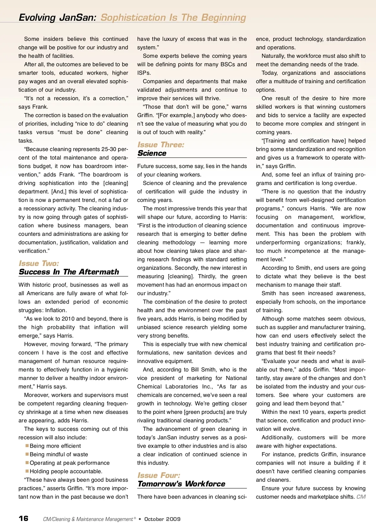 Evolving JanSan: Sophistication Is The Beginning Some insiders believe this continued change will be positive for our industry and the health of facilities. After all, the outcomes are believed to be smarter tools, educated workers, higher pay wages and an overall elevated sophis-tication of our industry. “Itʼs not a recession, itʼs a correction,” says Frank. The correction is based on the evaluation of priorities, including “nice to do” cleaning tasks versus “must be done” cleaning tasks. “Because cleaning represents 25-30 per-cent of the total maintenance and opera-tions budget, it now has boardroom inter-vention,” adds Frank. “The boardroom is driving sophistication into the [cleaning] department. [And,] this level of sophistica-tion is now a permanent trend, not a fad or a recessionary activity. The cleaning indus-try is now going through gates of sophisti-cation where business managers, bean counters and administrations are asking for documentation, justification, validation and verification.” have the luxury of excess that was in the system.” Some experts believe the coming years will be defining points for many BSCs and ISPs. Companies and departments that make validated adjustments and continue to improve their services will thrive. “Those that donʼt will be gone,” warns Griffin. “[For example,] anybody who does-nʼt see the value of measuring what you do is out of touch with reality.” ence, product technology, standardization and operations. Naturally, the workforce must also shift to meet the demanding needs of the trade. Today, organizations and associations offer a multitude of training and certification options. One result of the desire to hire more skilled workers is that winning customers and bids to service a facility are expected to become more complex and stringent in coming years. “[Training and certification have] helped bring some standardization and recognition and gives us a framework to operate with-in,” says Griffin. And, some feel an influx of training pro-grams and certification is long overdue. “There is no question that the industry will benefit from well-designed certification programs,” concurs Harris. “We are now focusing on management, workflow, documentation and continuous improve-ment. This has been the problem with underperforming organizations; frankly, too much incompetence at the manage-ment level.” According to Smith, end users are going to dictate what they believe is the best mechanism to manage their staff. Smith has seen increased awareness, especially from schools, on the importance of training. Although some matches seem obvious, such as supplier and manufacturer training, how can end users effectively select the best industry training and certification pro-grams that best fit their needs? “Evaluate your needs and what is avail-able out there,” adds Griffin. “Most impor-tantly, stay aware of the changes and donʼt be isolated from the industry and your cus-tomers. See where your customers are going and lead them beyond that.” Within the next 10 years, experts predict that science, certification and product inno-vation will evolve. Additionally, customers will be more aware with higher expectations. For instance, predicts Griffin, insurance companies will not insure a building if it doesnʼt have certified cleaning companies and cleaners. Ensure your future success by knowing customer needs and marketplace shifts. CM Issue Three: Science Future success, some say, lies in the hands of your cleaning workers. Science of cleaning and the prevalence of certification will guide the industry in coming years. The most impressive trends this year that will shape our future, according to Harris: “First is the introduction of cleaning science research that is emerging to better define cleaning methodology — learning more about how cleaning takes place and shar-ing research findings with standard setting organizations. Secondly, the new interest in measuring [cleaning]. Thirdly, the green movement has had an enormous impact on our industry.” The combination of the desire to protect health and the environment over the past five years, adds Harris, is being modified by unbiased science research yielding some very strong benefits. This is especially true with new chemical formulations, new sanitation devices and innovative equipment. And, according to Bill Smith, who is the vice president of marketing for National Chemical Laboratories Inc., “As far as chemicals are concerned, weʼve seen a real growth in technology. Weʼre getting closer to the point where [green products] are truly rivaling traditional cleaning products.” The advancement of green cleaning in todayʼs JanSan industry serves as a posi-tive example to other industries and is also a clear indication of continued science in this industry. Issue Two: Success In The Aftermath With historic proof, businesses as well as all Americans are fully aware of what fol-lows an extended period of economic struggles: Inflation. “As we look to 2010 and beyond, there is the high probability that inflation will emerge,” says Harris. However, moving forward, “The primary concern I have is the cost and effective management of human resource require-ments to effectively function in a hygienic manner to deliver a healthy indoor environ-ment,” Harris says. Moreover, workers and supervisors must be competent regarding cleaning frequen-cy shrinkage at a time when new diseases are appearing, adds Harris. The keys to success coming out of this recession will also include: Being more efficient Being mindful of waste Operating at peak performance Holding people accountable. “These have always been good business practices,” asserts Griffin. “Itʼs more impor-tant now than in the past because we donʼt Issue Four: Tomorrow’s Workforce There have been advances in cleaning sci-16 CM/Cleaning & Maintenance Management ® • October 2009