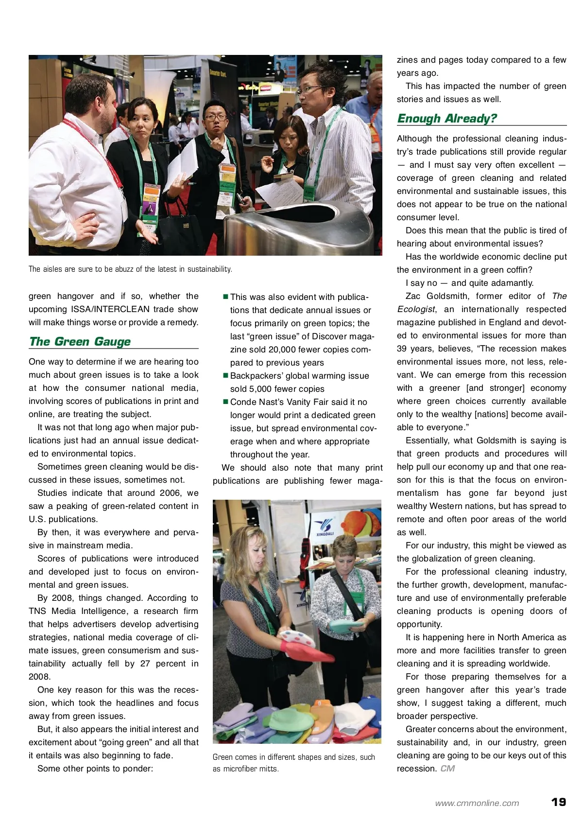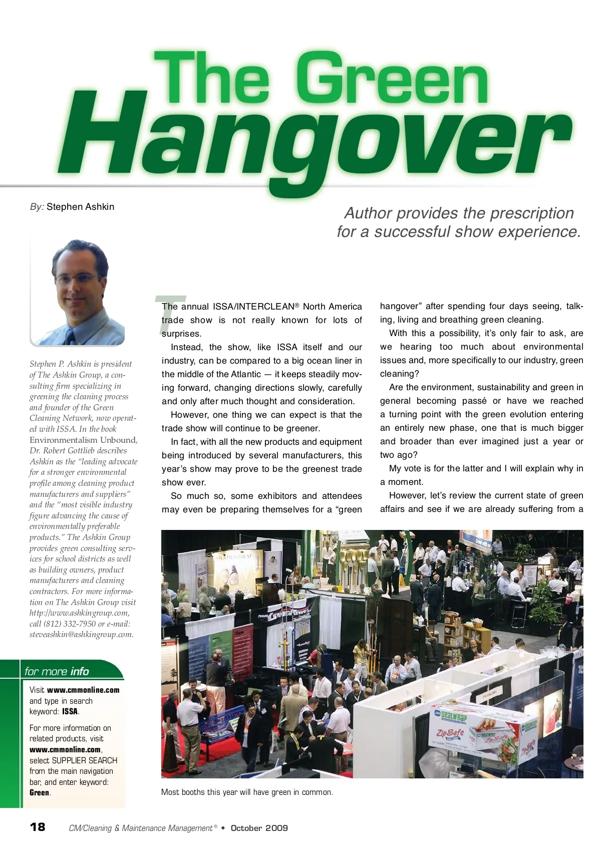 Hangover By: Stephen Ashkin The Green Author provides the prescription for a successful show experience. T Stephen P. Ashkin is president of The Ashkin Group, a con-sulting firm specializing in greening the cleaning process and founder of the Green Cleaning Network, now operat-ed with ISSA. In the book Environmentalism Unbound , Dr. Robert Gottlieb describes Ashkin as the “leading advocate for a stronger environmental profile among cleaning product manufacturers and suppliers” and the “most visible industry figure advancing the cause of environmentally preferable products.” The Ashkin Group provides green consulting serv-ices for school districts as well as building owners, product manufacturers and cleaning contractors. For more informa-tion on The Ashkin Group visit http://www.ashkingroup.com, call (812) 332-7950 or e-mail: [email protected]. The annual ISSA/INTERCLEAN ® North America trade show is not really known for lots of surprises. Instead, the show, like ISSA itself and our industry, can be compared to a big ocean liner in the middle of the Atlantic — it keeps steadily mov-ing forward, changing directions slowly, carefully and only after much thought and consideration. However, one thing we can expect is that the trade show will continue to be greener. In fact, with all the new products and equipment being introduced by several manufacturers, this yearʼs show may prove to be the greenest trade show ever. So much so, some exhibitors and attendees may even be preparing themselves for a “green hangover” after spending four days seeing, talk-ing, living and breathing green cleaning. With this a possibility, itʼs only fair to ask, are we hearing too much about environmental issues and, more specifically to our industry, green cleaning? Are the environment, sustainability and green in general becoming passé or have we reached a turning point with the green evolution entering an entirely new phase, one that is much bigger and broader than ever imagined just a year or two ago? My vote is for the latter and I will explain why in a moment. However, letʼs review the current state of green affairs and see if we are already suffering from a for more info Visit www.cmmonline.com and type in search keyword: ISSA . For more information on related products, visit www.cmmonline.com , select SUPPLIER SEARCH from the main navigation bar, and enter keyword: Green . Most booths this year will have green in common. 18 CM/Cleaning & Maintenance Management ® • October 2009