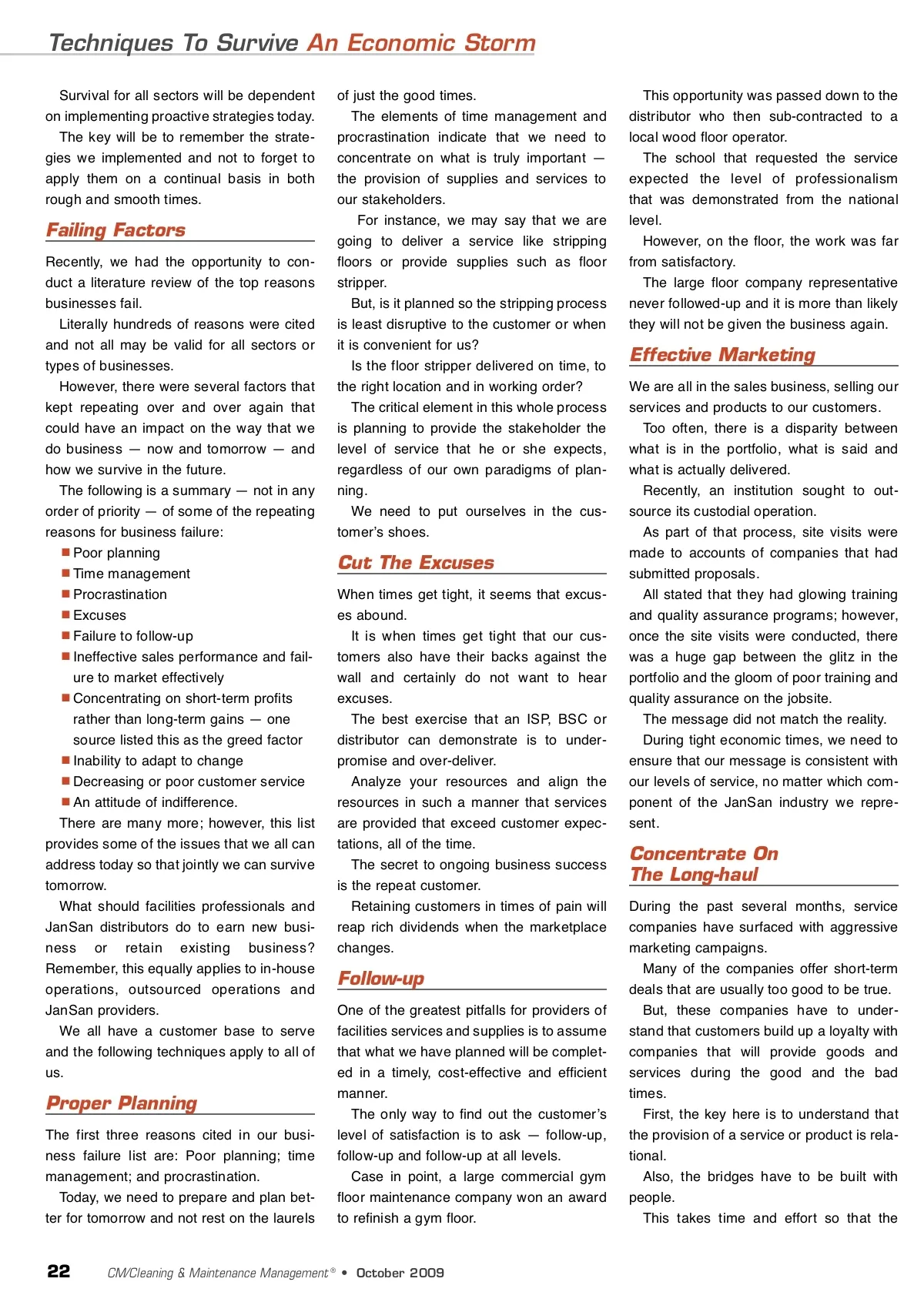 Techniques To Survive An Economic Storm Survival for all sectors will be dependent on implementing proactive strategies today. The key will be to remember the strate-gies we implemented and not to forget to apply them on a continual basis in both rough and smooth times. of just the good times. The elements of time management and procrastination indicate that we need to concentrate on what is truly important — the provision of supplies and services to our stakeholders. For instance, we may say that we are going to deliver a service like stripping floors or provide supplies such as floor stripper. But, is it planned so the stripping process is least disruptive to the customer or when it is convenient for us? Is the floor stripper delivered on time, to the right location and in working order? The critical element in this whole process is planning to provide the stakeholder the level of service that he or she expects, regardless of our own paradigms of plan-ning. We need to put ourselves in the cus-tomerʼs shoes. This opportunity was passed down to the distributor who then sub-contracted to a local wood floor operator. The school that requested the service expected the level of professionalism that was demonstrated from the national level. However, on the floor, the work was far from satisfactory. The large floor company representative never followed-up and it is more than likely they will not be given the business again. Failing Factors Recently, we had the opportunity to con-duct a literature review of the top reasons businesses fail. Literally hundreds of reasons were cited and not all may be valid for all sectors or types of businesses. However, there were several factors that kept repeating over and over again that could have an impact on the way that we do business — now and tomorrow — and how we survive in the future. The following is a summary — not in any order of priority — of some of the repeating reasons for business failure: Poor planning Time management Procrastination Excuses Failure to follow-up Ineffective sales performance and fail-ure to market effectively Concentrating on short-term profits rather than long-term gains — one source listed this as the greed factor Inability to adapt to change Decreasing or poor customer service An attitude of indifference. There are many more; however, this list provides some of the issues that we all can address today so that jointly we can survive tomorrow. What should facilities professionals and JanSan distributors do to earn new busi-ness or retain existing business? Remember, this equally applies to in-house operations, outsourced operations and JanSan providers. We all have a customer base to serve and the following techniques apply to all of us. Effective Marketing We are all in the sales business, selling our services and products to our customers. Too often, there is a disparity between what is in the portfolio, what is said and what is actually delivered. Recently, an institution sought to out-source its custodial operation. As part of that process, site visits were made to accounts of companies that had submitted proposals. All stated that they had glowing training and quality assurance programs; however, once the site visits were conducted, there was a huge gap between the glitz in the portfolio and the gloom of poor training and quality assurance on the jobsite. The message did not match the reality. During tight economic times, we need to ensure that our message is consistent with our levels of service, no matter which com-ponent of the JanSan industry we repre-sent. Cut The Excuses When times get tight, it seems that excus-es abound. It is when times get tight that our cus-tomers also have their backs against the wall and certainly do not want to hear excuses. The best exercise that an ISP, BSC or distributor can demonstrate is to under-promise and over-deliver. Analyze your resources and align the resources in such a manner that services are provided that exceed customer expec-tations, all of the time. The secret to ongoing business success is the repeat customer. Retaining customers in times of pain will reap rich dividends when the marketplace changes. Concentrate On The Long-haul During the past several months, service companies have surfaced with aggressive marketing campaigns. Many of the companies offer short-term deals that are usually too good to be true. But, these companies have to under-stand that customers build up a loyalty with companies that will provide goods and services during the good and the bad times. First, the key here is to understand that the provision of a service or product is rela-tional. Also, the bridges have to be built with people. This takes time and effort so that the Follow-up One of the greatest pitfalls for providers of facilities services and supplies is to assume that what we have planned will be complet-ed in a timely, cost-effective and efficient manner. The only way to find out the customerʼs level of satisfaction is to ask — follow-up, follow-up and follow-up at all levels. Case in point, a large commercial gym floor maintenance company won an award to refinish a gym floor. Proper Planning The first three reasons cited in our busi-ness failure list are: Poor planning; time management; and procrastination. Today, we need to prepare and plan bet-ter for tomorrow and not rest on the laurels 22 CM/Cleaning & Maintenance Management ® • October 2009