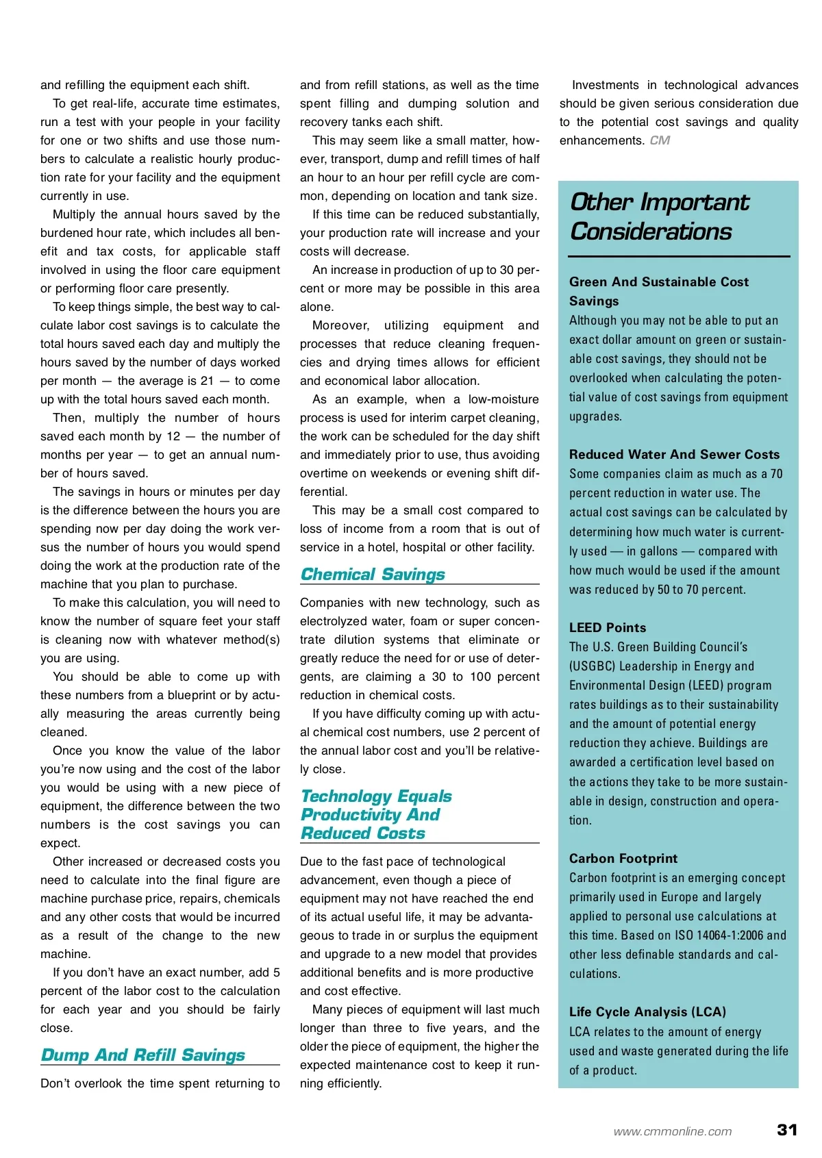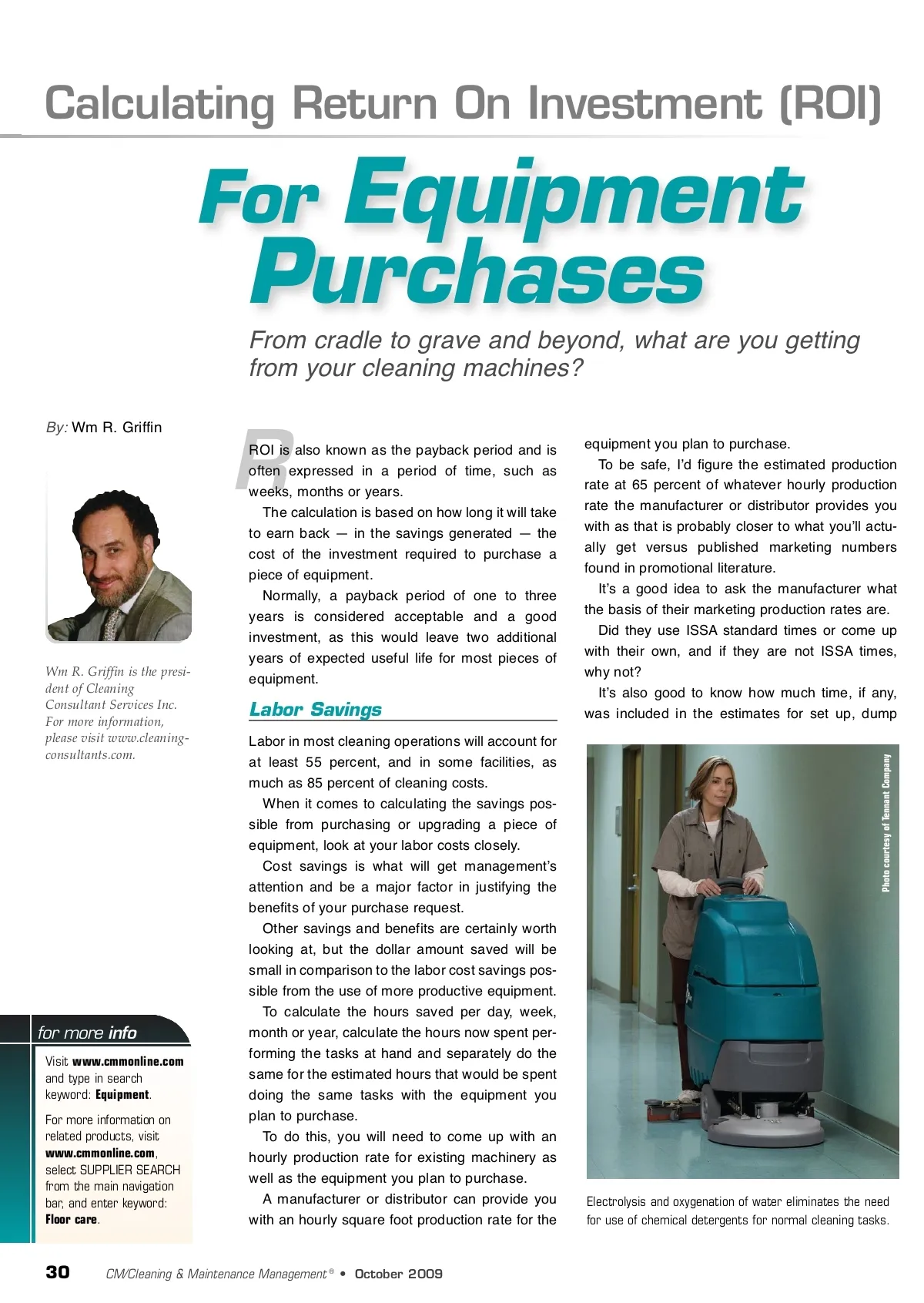 Calculating Return On Investment (ROI) For Equipment Purchases From cradle to grave and beyond, what are you getting from your cleaning machines? ROI is also known as the payback period and is often expressed in a period of time, such as weeks, months or years. The calculation is based on how long it will take to earn back — in the savings generated — the cost of the investment required to purchase a piece of equipment. Normally, a payback period of one to three years is considered acceptable and a good investment, as this would leave two additional years of expected useful life for most pieces of equipment. equipment you plan to purchase. To be safe, Iʼd figure the estimated production rate at 65 percent of whatever hourly production rate the manufacturer or distributor provides you with as that is probably closer to what youʼll actu-ally get versus published marketing numbers found in promotional literature. Itʼs a good idea to ask the manufacturer what the basis of their marketing production rates are. Did they use ISSA standard times or come up with their own, and if they are not ISSA times, why not? Itʼs also good to know how much time, if any, was included in the estimates for set up, dump Photo courtesy of Tennant Company By: Wm R. Griffin R Wm R. Griffin is the presi-dent of Cleaning Consultant Services Inc. For more information, please visit www.cleaning-consultants.com. Labor Savings Labor in most cleaning operations will account for at least 55 percent, and in some facilities, as much as 85 percent of cleaning costs. When it comes to calculating the savings pos-sible from purchasing or upgrading a piece of equipment, look at your labor costs closely. Cost savings is what will get managementʼs attention and be a major factor in justifying the benefits of your purchase request. Other savings and benefits are certainly worth looking at, but the dollar amount saved will be small in comparison to the labor cost savings pos-sible from the use of more productive equipment. To calculate the hours saved per day, week, month or year, calculate the hours now spent per-forming the tasks at hand and separately do the same for the estimated hours that would be spent doing the same tasks with the equipment you plan to purchase. To do this, you will need to come up with an hourly production rate for existing machinery as well as the equipment you plan to purchase. A manufacturer or distributor can provide you with an hourly square foot production rate for the for more info Visit www.cmmonline.com and type in search keyword: Equipment . For more information on related products, visit www.cmmonline.com , select SUPPLIER SEARCH from the main navigation bar, and enter keyword: Floor care . Electrolysis and oxygenation of water eliminates the need for use of chemical detergents for normal cleaning tasks. 30 CM/Cleaning & Maintenance Management ® • October 2009