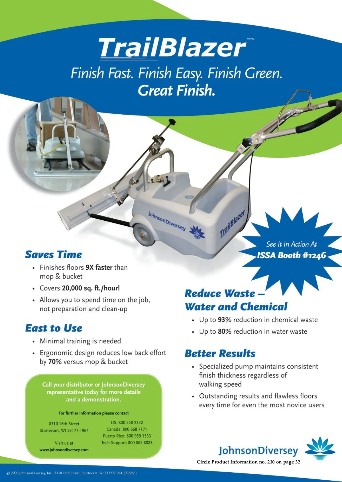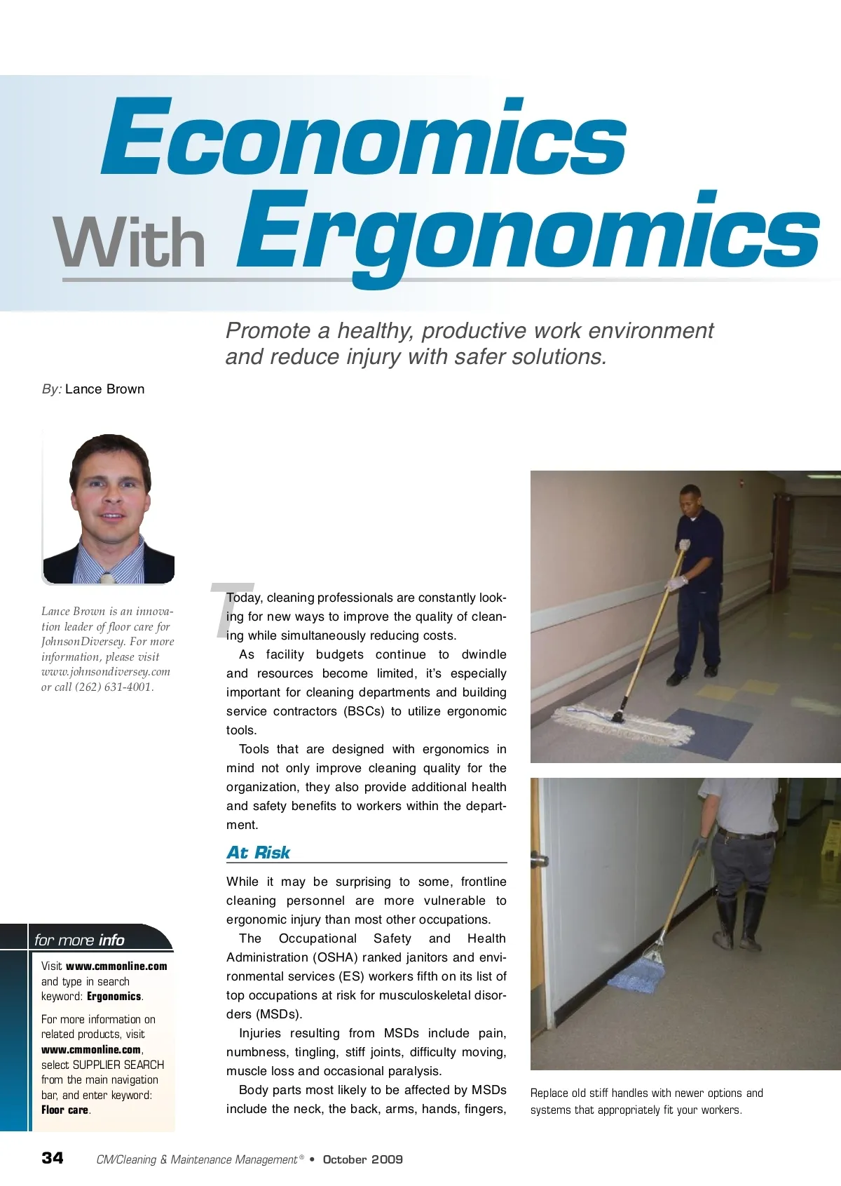 Economics With Ergonomics Promote a healthy, productive work environment and reduce injury with safer solutions. By: Lance Brown Lance Brown is an innova-tion leader of floor care for JohnsonDiversey. For more information, please visit www.johnsondiversey.com or call (262) 631-4001. T Today, cleaning professionals are constantly look-ing for new ways to improve the quality of clean-ing while simultaneously reducing costs. As facility budgets continue to dwindle and resources become limited, itʼs especially important for cleaning departments and building service contractors (BSCs) to utilize ergonomic tools. Tools that are designed with ergonomics in mind not only improve cleaning quality for the organization, they also provide additional health and safety benefits to workers within the depart-ment. At Risk While it may be surprising to some, frontline cleaning personnel are more vulnerable to ergonomic injury than most other occupations. The Occupational Safety and Health Administration (OSHA) ranked janitors and envi-ronmental services (ES) workers fifth on its list of top occupations at risk for musculoskeletal disor-ders (MSDs). Injuries resulting from MSDs include pain, numbness, tingling, stiff joints, difficulty moving, muscle loss and occasional paralysis. Body parts most likely to be affected by MSDs include the neck, the back, arms, hands, fingers, for more info Visit www.cmmonline.com and type in search keyword: Ergonomics . For more information on related products, visit www.cmmonline.com , select SUPPLIER SEARCH from the main navigation bar, and enter keyword: Floor care . Replace old stiff handles with newer options and systems that appropriately fit your workers. 34 CM/Cleaning & Maintenance Management ® • October 2009