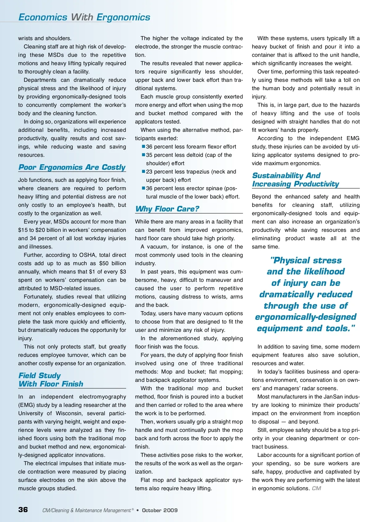 Economics With Ergonomics wrists and shoulders. Cleaning staff are at high risk of develop-ing these MSDs due to the repetitive motions and heavy lifting typically required to thoroughly clean a facility. Departments can dramatically reduce physical stress and the likelihood of injury by providing ergonomically-designed tools to concurrently complement the workerʼs body and the cleaning function. In doing so, organizations will experience additional benefits, including increased productivity, quality results and cost sav-ings, while reducing waste and saving resources. The higher the voltage indicated by the electrode, the stronger the muscle contrac-tion. The results revealed that newer applica-tors require significantly less shoulder, upper back and lower back effort than tra-ditional systems. Each muscle group consistently exerted more energy and effort when using the mop and bucket method compared with the applicators tested. When using the alternative method, par-ticipants exerted: 36 percent less forearm flexor effort 35 percent less deltoid (cap of the shoulder) effort 23 percent less trapezius (neck and upper back) effort 36 percent less erector spinae (pos-tural muscle of the lower back) effort. With these systems, users typically lift a heavy bucket of finish and pour it into a container that is affixed to the unit handle, which significantly increases the weight. Over time, performing this task repeated-ly using these methods will take a toll on the human body and potentially result in injury. This is, in large part, due to the hazards of heavy lifting and the use of tools designed with straight handles that do not fit workersʼ hands properly. According to the independent EMG study, these injuries can be avoided by uti-lizing applicator systems designed to pro-vide maximum ergonomics. Poor Ergonomics Are Costly Job functions, such as applying floor finish, where cleaners are required to perform heavy lifting and potential distress are not only costly to an employeeʼs health, but costly to the organization as well. Every year, MSDs account for more than $15 to $20 billion in workersʼ compensation and 34 percent of all lost workday injuries and illnesses. Further, according to OSHA, total direct costs add up to as much as $50 billion annually, which means that $1 of every $3 spent on workersʼ compensation can be attributed to MSD-related issues. Fortunately, studies reveal that utilizing modern, ergonomically-designed equip-ment not only enables employees to com-plete the task more quickly and efficiently, but dramatically reduces the opportunity for injury. This not only protects staff, but greatly reduces employee turnover, which can be another costly expense for an organization. Sustainability And Increasing Productivity Beyond the enhanced safety and health benefits for cleaning staff, utilizing ergonomically-designed tools and equip-ment can also increase an organizationʼs productivity while saving resources and eliminating product waste all at the same time. Why Floor Care? While there are many areas in a facility that can benefit from improved ergonomics, hard floor care should take high priority. A vacuum, for instance, is one of the most commonly used tools in the cleaning industry. In past years, this equipment was cum-bersome, heavy, difficult to maneuver and caused the user to perform repetitive motions, causing distress to wrists, arms and the back. Today, users have many vacuum options to choose from that are designed to fit the user and minimize any risk of injury. In the aforementioned study, applying floor finish was the focus. For years, the duty of applying floor finish involved using one of three traditional methods: Mop and bucket; flat mopping; and backpack applicator systems. With the traditional mop and bucket method, floor finish is poured into a bucket and then carried or rolled to the area where the work is to be performed. Then, workers usually grip a straight mop handle and must continually push the mop back and forth across the floor to apply the finish. These activities pose risks to the worker, the results of the work as well as the organ-ization. Flat mop and backpack applicator sys-tems also require heavy lifting. "Physical stress and the likelihood of injury can be dramatically reduced through the use of ergonomically-designed equipment and tools." In addition to saving time, some modern equipment features also save solution, resources and water. In todayʼs facilities business and opera-tions environment, conservation is on own-ersʼ and managersʼ radar screens. Most manufacturers in the JanSan indus-try are looking to minimize their productsʼ impact on the environment from inception to disposal — and beyond. Still, employee safety should be a top pri-ority in your cleaning department or con-tract business. Labor accounts for a significant portion of your spending, so be sure workers are safe, happy, productive and captivated by the work they are performing with the latest in ergonomic solutions. CM Field Study With Floor Finish In an independent electromyography (EMG) study by a leading researcher at the University of Wisconsin, several partici-pants with varying height, weight and expe-rience levels were analyzed as they fin-ished floors using both the traditional mop and bucket method and new, ergonomical-ly-designed applicator innovations. The electrical impulses that initiate mus-cle contraction were measured by placing surface electrodes on the skin above the muscle groups studied. 36 CM/Cleaning & Maintenance Management ® • October 2009