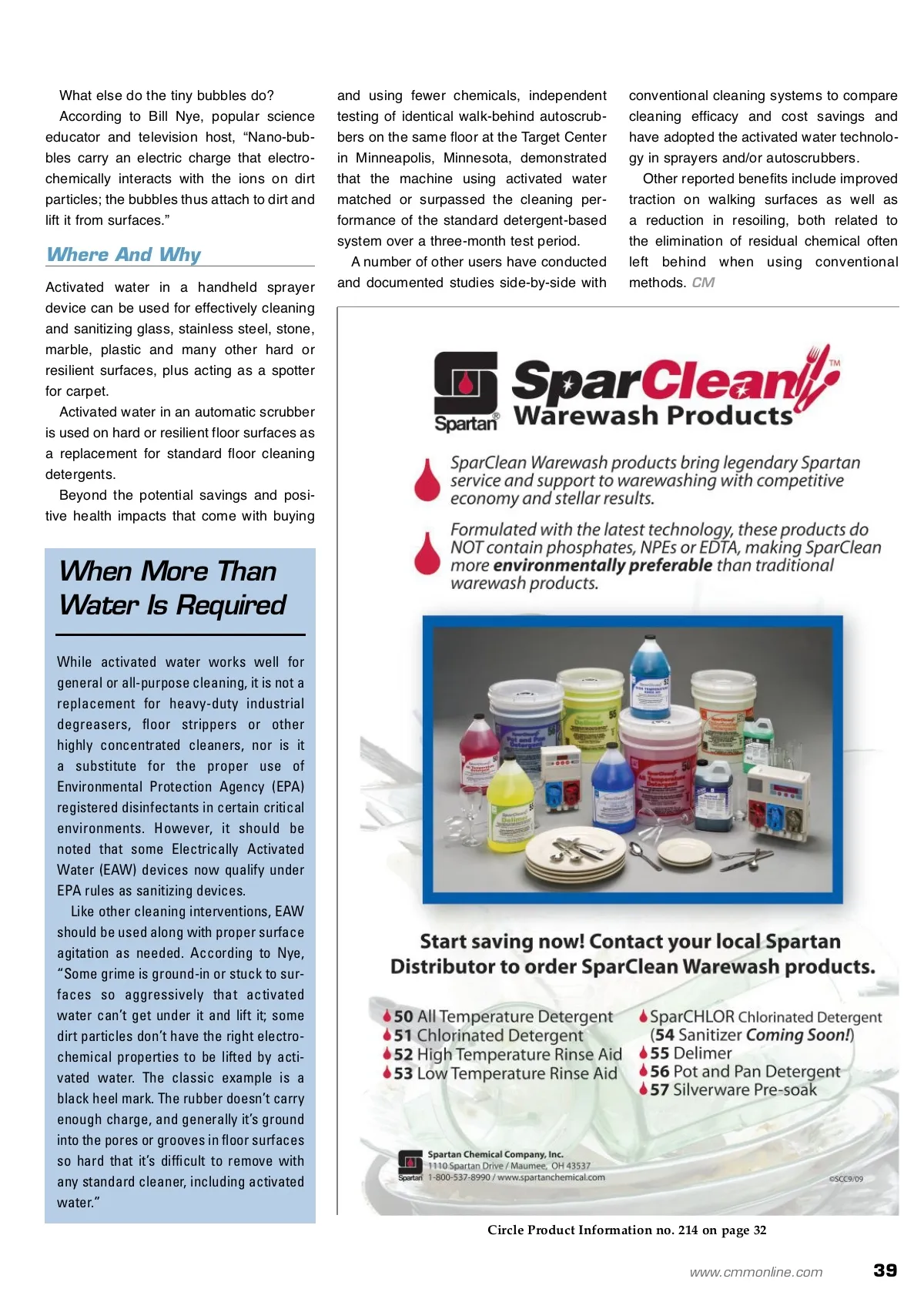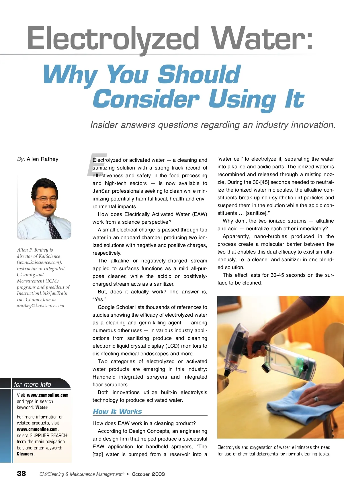 Electrolyzed Water: Why You Should Consider Using It Insider answers questions regarding an industry innovation. By: Allen Rathey E Allen P. Rathey is director of KaiScience (www.kaiscience.com), instructor in Integrated Cleaning and Measurement (ICM) programs and president of InstructionLink/JanTrain Inc. Contact him at [email protected]. for more info Visit www.cmmonline.com and type in search keyword: Water . For more information on related products, visit www.cmmonline.com , select SUPPLIER SEARCH from the main navigation bar, and enter keyword: Cleaners . Electrolyzed or activated water — a cleaning and sanitizing solution with a strong track record of effectiveness and safety in the food processing and high-tech sectors — is now available to JanSan professionals seeking to clean while min-imizing potentially harmful fiscal, health and envi-ronmental impacts. How does Electrically Activated Water (EAW) work from a science perspective? A small electrical charge is passed through tap water in an onboard chamber producing two ion-ized solutions with negative and positive charges, respectively. The alkaline or negatively-charged stream applied to surfaces functions as a mild all-pur-pose cleaner, while the acidic or positively-charged stream acts as a sanitizer. But, does it actually work? The answer is, “Yes.” Google Scholar lists thousands of references to studies showing the efficacy of electrolyzed water as a cleaning and germ-killing agent — among numerous other uses — in various industry appli-cations from sanitizing produce and cleaning electronic liquid crystal display (LCD) monitors to disinfecting medical endoscopes and more. Two categories of electrolyzed or activated water products are emerging in this industry: Handheld integrated sprayers and integrated floor scrubbers. Both innovations utilize built-in electrolysis technology to produce activated water. ʻwater cellʼ to electrolyze it, separating the water into alkaline and acidic parts. The ionized water is recombined and released through a misting noz-zle. During the 30-[45] seconds needed to neutral-ize the ionized water molecules, the alkaline con-stituents break up non-synthetic dirt particles and suspend them in the solution while the acidic con-stituents … [sanitize].” Why donʼt the two ionized streams — alkaline and acid — neutralize each other immediately? Apparently, nano-bubbles produced in the process create a molecular barrier between the two that enables this dual efficacy to exist simulta-neously, i.e. a cleaner and sanitizer in one blend-ed solution. This effect lasts for 30-45 seconds on the sur-face to be cleaned. How It Works How does EAW work in a cleaning product? According to Design Concepts, an engineering and design firm that helped produce a successful EAW application for handheld sprayers, “The [tap] water is pumped from a reservoir into a Electrolysis and oxygenation of water eliminates the need for use of chemical detergents for normal cleaning tasks. 38 CM/Cleaning & Maintenance Management ® • October 2009