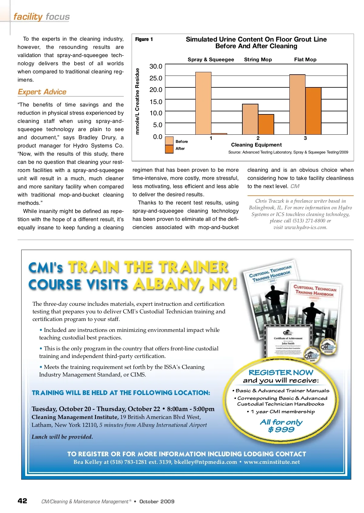 facility focus To the experts in the cleaning industry, however, the resounding results are validation that spray-and-squeegee tech-nology delivers the best of all worlds when compared to traditional cleaning reg-imens. Figure 1 Simulated Urine Content On Floor Grout Line Before And After Cleaning Spray & Squeegee String Mop Flat Mop mmole/L Creatine Residue 30.0 25.0 20.0 15.0 10.0 5.0 0.0 Before After Expert Advice “The benefits of time savings and the reduction in physical stress experienced by cleaning staff when using spray-and-squeegee technology are plain to see and document,” says Bradley Drury, a product manager for Hydro Systems Co. “Now, with the results of this study, there can be no question that cleaning your rest-room facilities with a spray-and-squeegee unit will result in a much, much cleaner and more sanitary facility when compared with traditional mop-and-bucket cleaning methods.” While insanity might be defined as repe-tition with the hope of a different result, itʼs equally insane to keep funding a cleaning 123 Cleaning Equipment Source: Advanced Testing Laboratory, Spray & Squeegee Testing/2009 regimen that has been proven to be more time-intensive, more costly, more stressful, less motivating, less efficient and less able to deliver the desired results. Thanks to the recent test results, using spray-and-squeegee cleaning technology has been proven to eliminate all of the defi-ciencies associated with mop-and-bucket cleaning and is an obvious choice when considering how to take facility cleanliness to the next level. CM Chris Traczek is a freelance writer based in Bolingbrook, IL. For more information on Hydro Systems or ICS touchless cleaning technology, please call (513) 271-8800 or visit www.hydro-ics.com. CMI's TRAIN THE TRAINER COURSE VISITS ALBANY, NY! The three-day course includes materials, expert instruction and certification testing that prepares you to deliver CMI's Custodial Technician training and certification programto your staff. • Included are instructions on minimizing environmental impact while teaching custodial best practices. • This is the only programin the country that offers front-line custodial training and independent third-party certification. • Meets the training requirement set forth by the ISSA's Cleaning Industry Management Standard, or CIMS. R E G I S T E R N O W and you will receive: • Basic & Advanced Trainer Manuals • Corresponding Basic & Advanced CustodialTechnician Handbooks • 1 year CMI membership TRAINING WILL BE HELD AT THE FOLLOWING LOCATION: Tuesday, October 20 -Thursday, October 22 • 8:00am -5:00pm Cleaning Management Institute, 19 British American Blvd West, Latham, New York 12110 , 5 minutes from Albany International Airport Lunch will be provided. A l l f o r o n l y $ 9 9 9 TO REGISTER OR FOR MORE INFORMATION INCLUDING LODGING CONTACT Bea Kelley at (518) 783-1281 ext. 3139, [email protected] • www.cminstitute.net 42 CM/Cleaning & Maintenance Management ® • October 2009