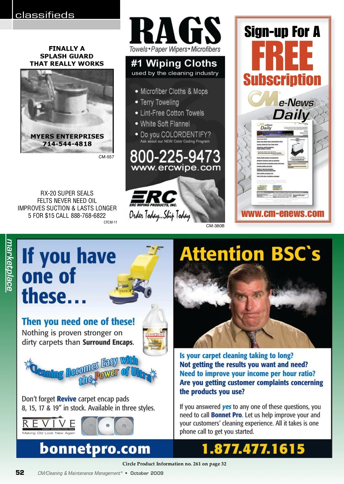 classifieds Sign-up For A FREE Subscription e-News Daily CM-557 RX-20 SUPER SEALS FELTS NEVER NEED OIL IMPROVES SUCTION & LASTS LONGER 5 FOR $15 CALL 888-768-6822 CFCM-11 www.cm-enews.com CM-380B marketplace Circle Product Information no. 261 on page 32 52 CM/Cleaning & Maintenance Management ® • October 2009