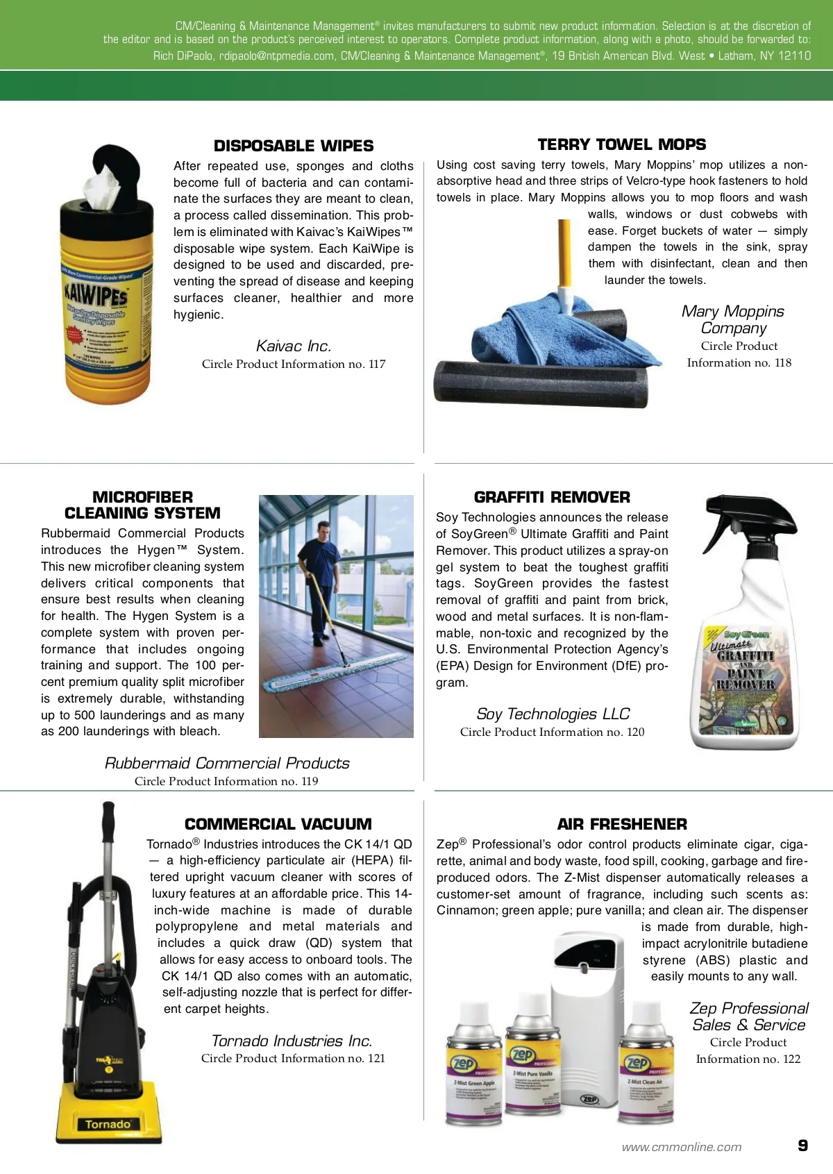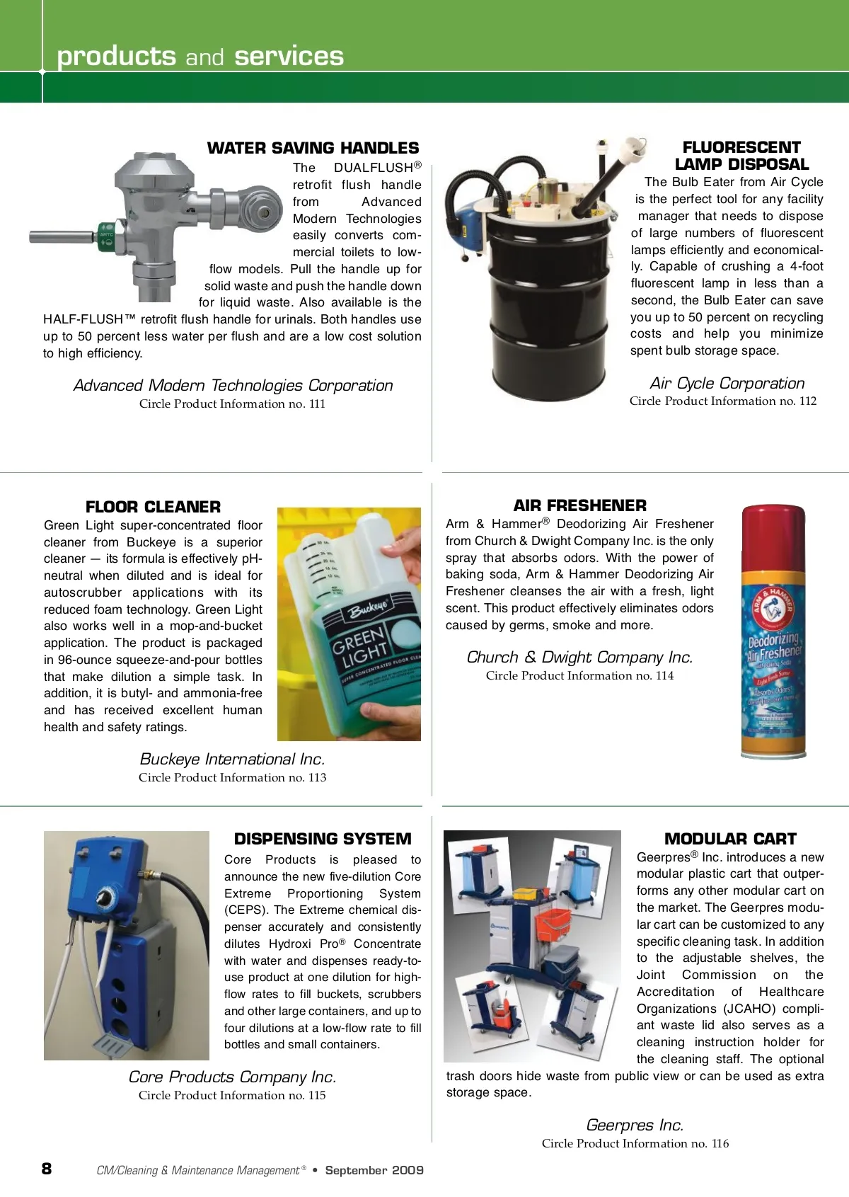 products and services WATER SAVING HANDLES The DUALFLUSH ® retrofit flush handle from Advanced Modern Technologies easily converts com-mercial toilets to low-flow models. Pull the handle up for solid waste and push the handle down for liquid waste. Also available is the HALF-FLUSH™ retrofit flush handle for urinals. Both handles use up to 50 percent less water per flush and are a low cost solution to high efficiency. FLUORESCENT LAMP DISPOSAL The Bulb Eater from Air Cycle is the perfect tool for any facility manager that needs to dispose of large numbers of fluorescent lamps efficiently and economical-ly. Capable of crushing a 4-foot fluorescent lamp in less than a second, the Bulb Eater can save you up to 50 percent on recycling costs and help you minimize spent bulb storage space. Advanced Modern Technologies Corporation Circle Product Information no. 111 Air Cycle Corporation Circle Product Information no. 112 FLOOR CLEANER Green Light super-concentrated floor cleaner from Buckeye is a superior cleaner — its formula is effectively pH-neutral when diluted and is ideal for autoscrubber applications with its reduced foam technology. Green Light also works well in a mop-and-bucket application. The product is packaged in 96-ounce squeeze-and-pour bottles that make dilution a simple task. In addition, it is butyl-and ammonia-free and has received excellent human health and safety ratings. AIR FRESHENER Arm & Hammer ® Deodorizing Air Freshener from Church & Dwight Company Inc. is the only spray that absorbs odors. With the power of baking soda, Arm & Hammer Deodorizing Air Freshener cleanses the air with a fresh, light scent. This product effectively eliminates odors caused by germs, smoke and more. Church & Dwight Company Inc. Circle Product Information no. 114 Buckeye International Inc. Circle Product Information no. 113 DISPENSING SYSTEM Core Products is pleased to announce the new five-dilution Core Extreme Proportioning System (CEPS). The Extreme chemical dis-penser accurately and consistently dilutes Hydroxi Pro ® Concentrate with water and dispenses ready-to-use product at one dilution for high-flow rates to fill buckets, scrubbers and other large containers, and up to four dilutions at a low-flow rate to fill bottles and small containers. MODULAR CART Geerpres ® Inc. introduces a new modular plastic cart that outper-forms any other modular cart on the market. The Geerpres modu-lar cart can be customized to any specific cleaning task. In addition to the adjustable shelves, the Joint Commission on the Accreditation of Healthcare Organizations (JCAHO) compli-ant waste lid also serves as a cleaning instruction holder for the cleaning staff. The optional trash doors hide waste from public view or can be used as extra storage space. Core Products Company Inc. Circle Product Information no. 115 Geerpres Inc. Circle Product Information no. 116 8 CM/Cleaning & Maintenance Management ® • September 2009