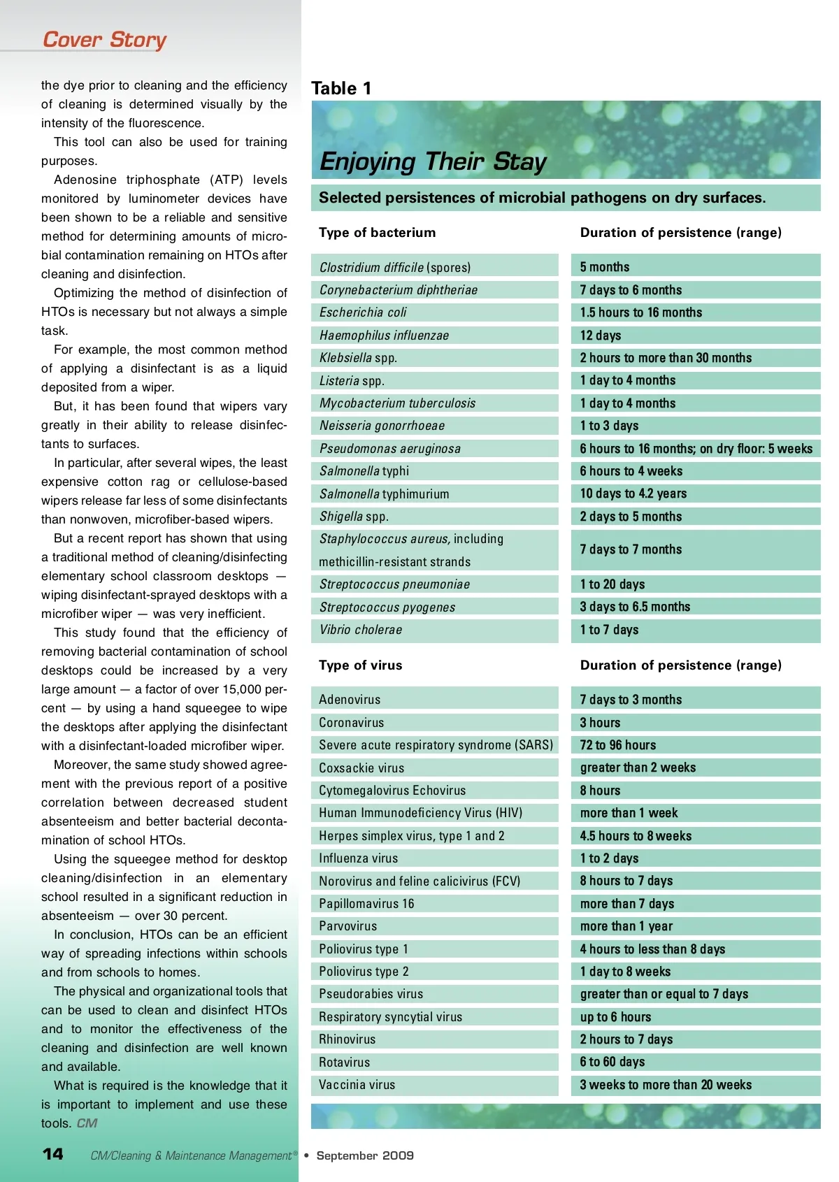 Cover Story the dye prior to cleaning and the efficiency of cleaning is determined visually by the intensity of the fluorescence. This tool can also be used for training purposes. Adenosine triphosphate (ATP) levels monitored by luminometer devices have been shown to be a reliable and sensitive method for determining amounts of micro-bial contamination remaining on HTOs after cleaning and disinfection. Optimizing the method of disinfection of HTOs is necessary but not always a simple task. For example, the most common method of applying a disinfectant is as a liquid deposited from a wiper. But, it has been found that wipers vary greatly in their ability to release disinfec-tants to surfaces. In particular, after several wipes, the least expensive cotton rag or cellulose-based wipers release far less of some disinfectants than nonwoven, microfiber-based wipers. But a recent report has shown that using a traditional method of cleaning/disinfecting elementary school classroom desktops — wiping disinfectant-sprayed desktops with a microfiber wiper — was very inefficient. This study found that the efficiency of removing bacterial contamination of school desktops could be increased by a very large amount — a factor of over 15,000 per-cent — by using a hand squeegee to wipe the desktops after applying the disinfectant with a disinfectant-loaded microfiber wiper. Moreover, the same study showed agree-ment with the previous report of a positive correlation between decreased student absenteeism and better bacterial deconta-mination of school HTOs. Using the squeegee method for desktop cleaning/disinfection in an elementary school resulted in a significant reduction in absenteeism — over 30 percent. In conclusion, HTOs can be an efficient way of spreading infections within schools and from schools to homes. The physical and organizational tools that can be used to clean and disinfect HTOs and to monitor the effectiveness of the cleaning and disinfection are well known and available. What is required is the knowledge that it is important to implement and use these tools. CM Table 1 Enjoying Their Stay Selected persistences of microbial pathogens on dry surfaces. Type of bacterium Duration of persistence (range) 5 m o n t h s 7 d a y s t o 6 mo n t h s 1 . 5 h o u r s t o 1 6 m o n t h s 1 2 d a y s 2 h o u r s t o m o r e th a n 3 0 m o n t h s 1 d a y t o 4 mo n t h s 1 d a y t o 4 mo n t h s 1 t o 3 d a y s 6 h o u r s t o 1 6 mo n t h s ; o n d r y f l o o r : 5 w e e k s 6 h o u r s t o 4 we e k s 1 0 d a y s t o 4 . 2 y e a r s 2 d a y s t o 5 mo n t h s 7 d a y s t o 7 mo n t h s 1 t o 2 0 d a y s 3 d a y s t o 6 . 5 m o n t h s 1 t o 7 d a y s Duration of persistence (range) 7 d a y s t o 3 mo n t h s 3 h o u r s 7 2 t o 9 6 h o u r s g r e a t e r t h a n 2 w e e k s 8 h o u r s m o r e t h a n 1 w e e k 4 . 5 h o u r s t o 8 we e k s 1 t o 2 d a y s 8 h o u r s t o 7 da y s m o r e t h a n 7 d a y s m o r e t h a n 1 y e a r 4 h o u r s t o l e s s th a n 8 d a y s 1 d a y t o 8 we e k s g r e a t e r t h a n o r e q u a l to 7 d a y s u p t o 6 h o u r s 2 h o u r s t o 7 da y s 6 t o 6 0 d a y s 3 w e e k s t o m o r e th a n 2 0 w e e k s Clostridium difficile (spores) Corynebacterium diphtheriae Escherichia coli Haemophilus influenzae Klebsiella spp. Listeria spp. Mycobacterium tuberculosis Neisseria gonorrhoeae Pseudomonas aeruginosa Salmonella typhi Salmonella typhimurium Shigella spp. Staphylococcus aureus, including methicillin-resistant strands Streptococcus pneumoniae Streptococcus pyogenes Vibrio cholerae Type of virus Adenovirus Coronavirus Severe acute respiratory syndrome (SARS) Coxsackie virus Cytomegalovirus Echovirus Human Immunodeficiency Virus (HIV) Herpes simplex virus, type 1 and 2 Influenza virus Norovirus and feline calicivirus (FCV) Papillomavirus 16 Parvovirus Poliovirus type 1 Poliovirus type 2 Pseudorabies virus Respiratory syncytial virus Rhinovirus Rotavirus Vaccinia virus 14 CM/Cleaning & Maintenance Management ® • September 2009