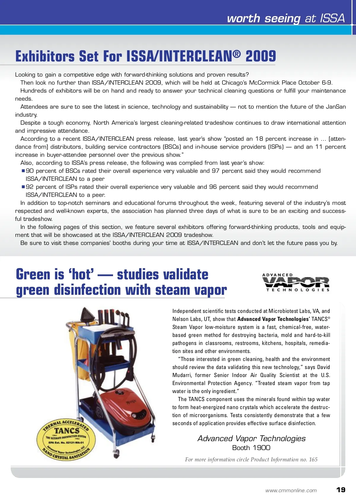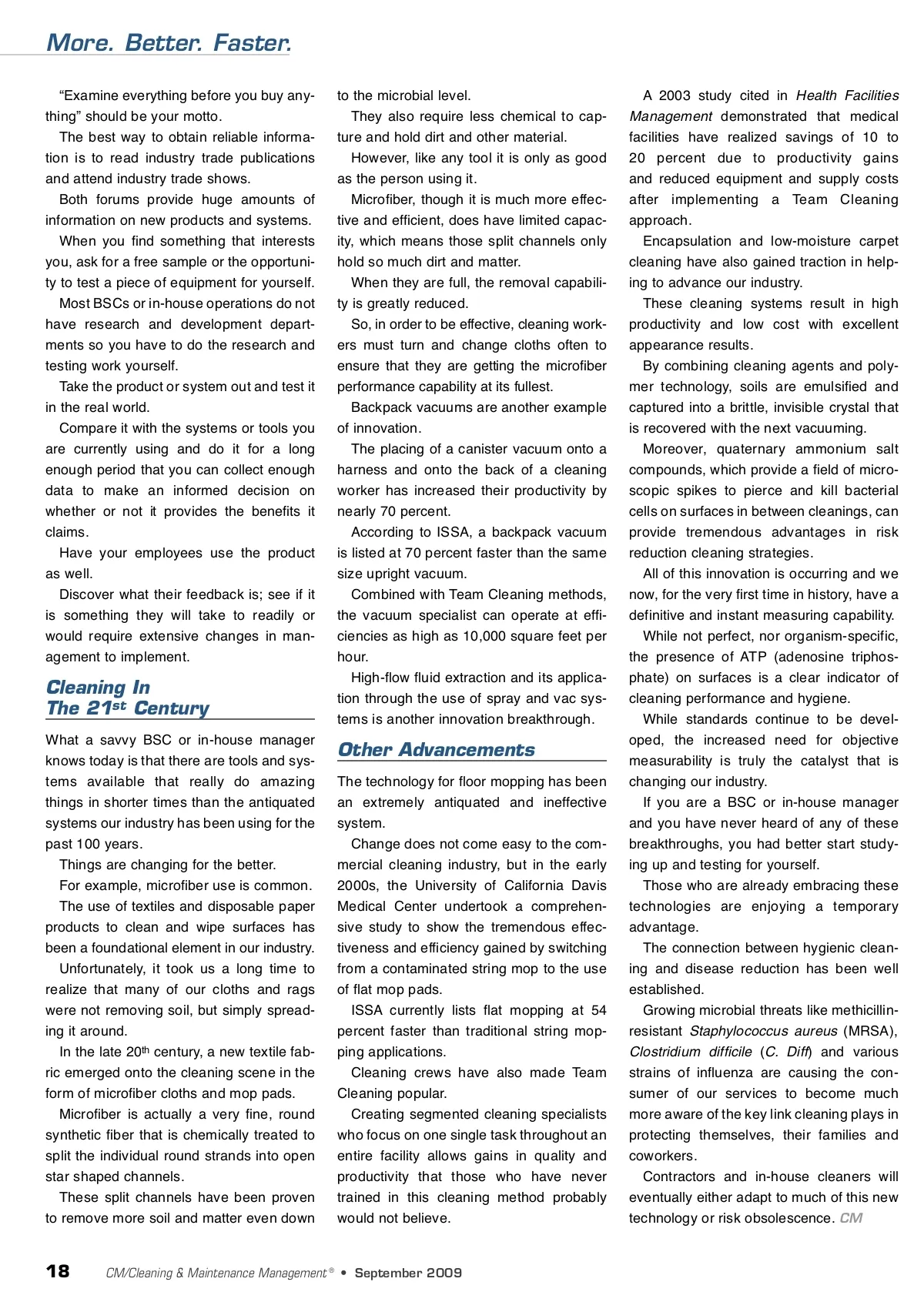 More. Better. Faster. “Examine everything before you buy any-thing” should be your motto. The best way to obtain reliable informa-tion is to read industry trade publications and attend industry trade shows. Both forums provide huge amounts of information on new products and systems. When you find something that interests you, ask for a free sample or the opportuni-ty to test a piece of equipment for yourself. Most BSCs or in-house operations do not have research and development depart-ments so you have to do the research and testing work yourself. Take the product or system out and test it in the real world. Compare it with the systems or tools you are currently using and do it for a long enough period that you can collect enough data to make an informed decision on whether or not it provides the benefits it claims. Have your employees use the product as well. Discover what their feedback is; see if it is something they will take to readily or would require extensive changes in man-agement to implement. to the microbial level. They also require less chemical to cap-ture and hold dirt and other material. However, like any tool it is only as good as the person using it. Microfiber, though it is much more effec-tive and efficient, does have limited capac-ity, which means those split channels only hold so much dirt and matter. When they are full, the removal capabili-ty is greatly reduced. So, in order to be effective, cleaning work-ers must turn and change cloths often to ensure that they are getting the microfiber performance capability at its fullest. Backpack vacuums are another example of innovation. The placing of a canister vacuum onto a harness and onto the back of a cleaning worker has increased their productivity by nearly 70 percent. According to ISSA, a backpack vacuum is listed at 70 percent faster than the same size upright vacuum. Combined with Team Cleaning methods, the vacuum specialist can operate at effi-ciencies as high as 10,000 square feet per hour. High-flow fluid extraction and its applica-tion through the use of spray and vac sys-tems is another innovation breakthrough. A 2003 study cited in Health Facilities Management demonstrated that medical facilities have realized savings of 10 to 20 percent due to productivity gains and reduced equipment and supply costs after implementing a Team Cleaning approach. Encapsulation and low-moisture carpet cleaning have also gained traction in help-ing to advance our industry. These cleaning systems result in high productivity and low cost with excellent appearance results. By combining cleaning agents and poly-mer technology, soils are emulsified and captured into a brittle, invisible crystal that is recovered with the next vacuuming. Moreover, quaternary ammonium salt compounds, which provide a field of micro-scopic spikes to pierce and kill bacterial cells on surfaces in between cleanings, can provide tremendous advantages in risk reduction cleaning strategies. All of this innovation is occurring and we now, for the very first time in history, have a definitive and instant measuring capability. While not perfect, nor organism-specific, the presence of ATP (adenosine triphos-phate) on surfaces is a clear indicator of cleaning performance and hygiene. While standards continue to be devel-oped, the increased need for objective measurability is truly the catalyst that is changing our industry. If you are a BSC or in-house manager and you have never heard of any of these breakthroughs, you had better start study-ing up and testing for yourself. Those who are already embracing these technologies are enjoying a temporary advantage. The connection between hygienic clean-ing and disease reduction has been well established. Growing microbial threats like methicillin-resistant Staphylococcus aureus (MRSA), Clostridium difficile ( C. Diff ) and various strains of influenza are causing the con-sumer of our services to become much more aware of the key link cleaning plays in protecting themselves, their families and coworkers. Contractors and in-house cleaners will eventually either adapt to much of this new technology or risk obsolescence. CM Cleaning In The 21 st Century What a savvy BSC or in-house manager knows today is that there are tools and sys-tems available that really do amazing things in shorter times than the antiquated systems our industry has been using for the past 100 years. Things are changing for the better. For example, microfiber use is common. The use of textiles and disposable paper products to clean and wipe surfaces has been a foundational element in our industry. Unfortunately, it took us a long time to realize that many of our cloths and rags were not removing soil, but simply spread-ing it around. In the late 20 th century, a new textile fab-ric emerged onto the cleaning scene in the form of microfiber cloths and mop pads. Microfiber is actually a very fine, round synthetic fiber that is chemically treated to split the individual round strands into open star shaped channels. These split channels have been proven to remove more soil and matter even down Other Advancements The technology for floor mopping has been an extremely antiquated and ineffective system. Change does not come easy to the com-mercial cleaning industry, but in the early 2000s, the University of California Davis Medical Center undertook a comprehen-sive study to show the tremendous effec-tiveness and efficiency gained by switching from a contaminated string mop to the use of flat mop pads. ISSA currently lists flat mopping at 54 percent faster than traditional string mop-ping applications. Cleaning crews have also made Team Cleaning popular. Creating segmented cleaning specialists who focus on one single task throughout an entire facility allows gains in quality and productivity that those who have never trained in this cleaning method probably would not believe. 18 CM/Cleaning & Maintenance Management ® • September 2009