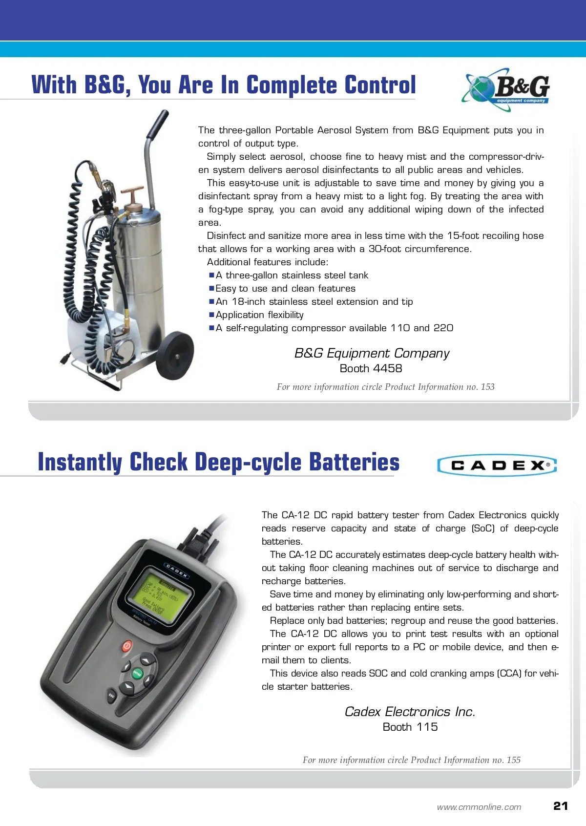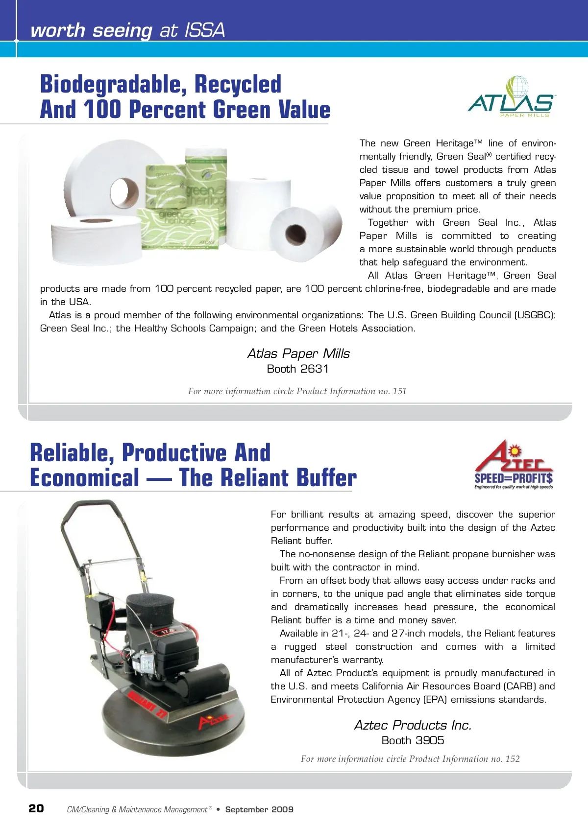 worth seeing at ISSA Biodegradable, Recycled And 100 Percent Green Value The new Green Heritage ™ line of environ-mentally friendly, Green Seal ® certified recy-cled tissue and towel products from Atlas Paper Mills offers customers a truly green value proposition to meet all of their needs without the premium price. Together with Green Seal Inc., Atlas Paper Mills is committed to creating a more sustainable world through products that help safeguard the environment. All Atlas Green Heritage ™, Green Seal products are made from 100 percent recycled paper, are 100 percent chlorine-free, biodegradable and are made in the USA. Atlas is a proud member of the following environmental organizations: The U.S. Green Building Council (USGBC); Green Seal Inc.; the Healthy Schools Campaign; and the Green Hotels Association. Atlas Paper Mills Booth 2631 For more information circle Product Information no. 151 Reliable, Productive And Economical — The Reliant Buffer For brilliant results at amazing speed, discover the superior performance and productivity built into the design of the Aztec Reliant buffer. The no-nonsense design of the Reliant propane burnisher was built with the contractor in mind. From an offset body that allows easy access under racks and in corners, to the unique pad angle that eliminates side torque and dramatically increases head pressure, the economical Reliant buffer is a time and money saver. Available in 21-, 24-and 27-inch models, the Reliant features a rugged steel construction and comes with a limited manufacturer’s warranty. All of Aztec Product’s equipment is proudly manufactured in the U.S. and meets California Air Resources Board (CARB) and Environmental Protection Agency (EPA) emissions standards. Aztec Products Inc. Booth 3905 For more information circle Product Information no. 152 20 CM/Cleaning & Maintenance Management ® • September 2009
