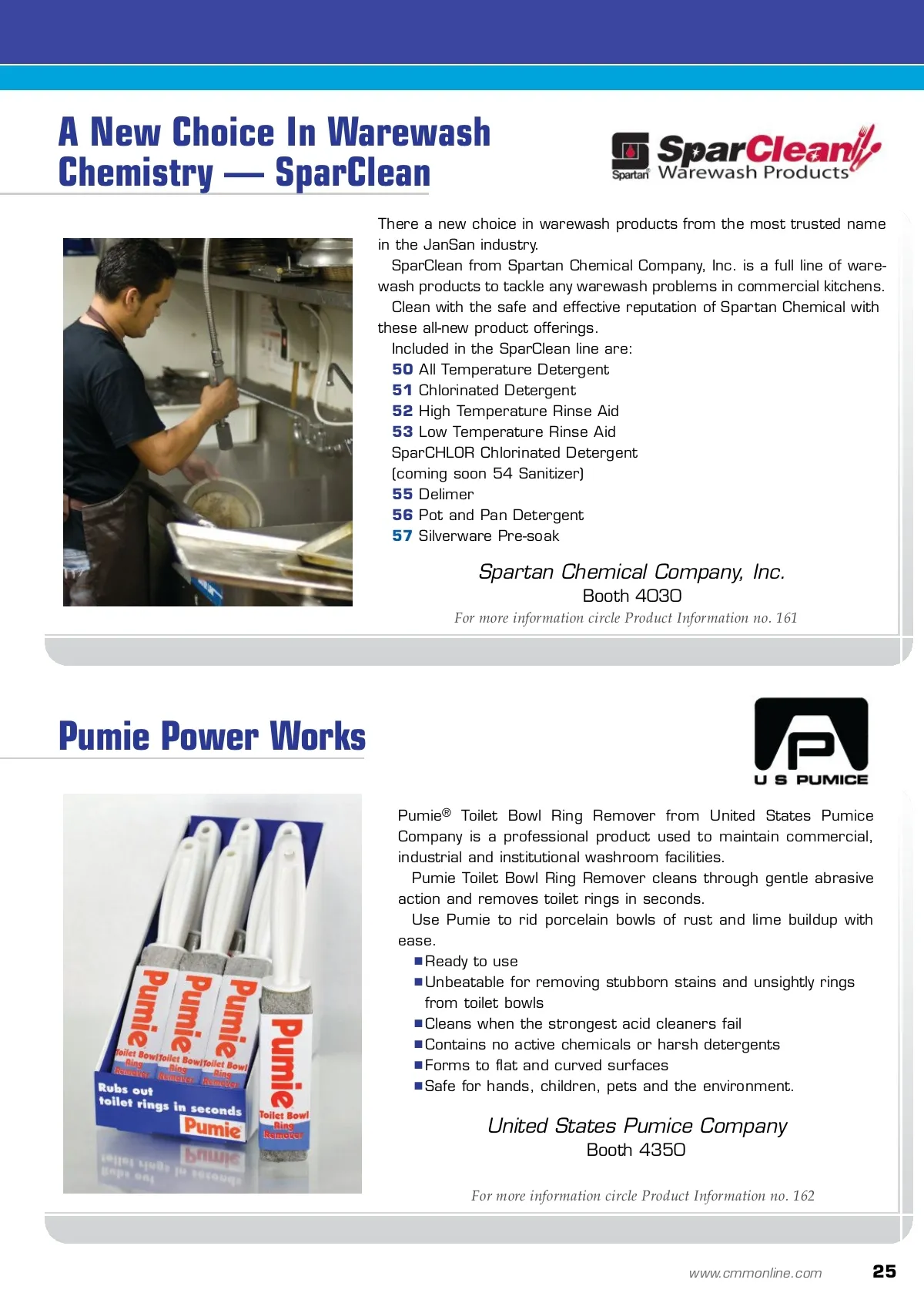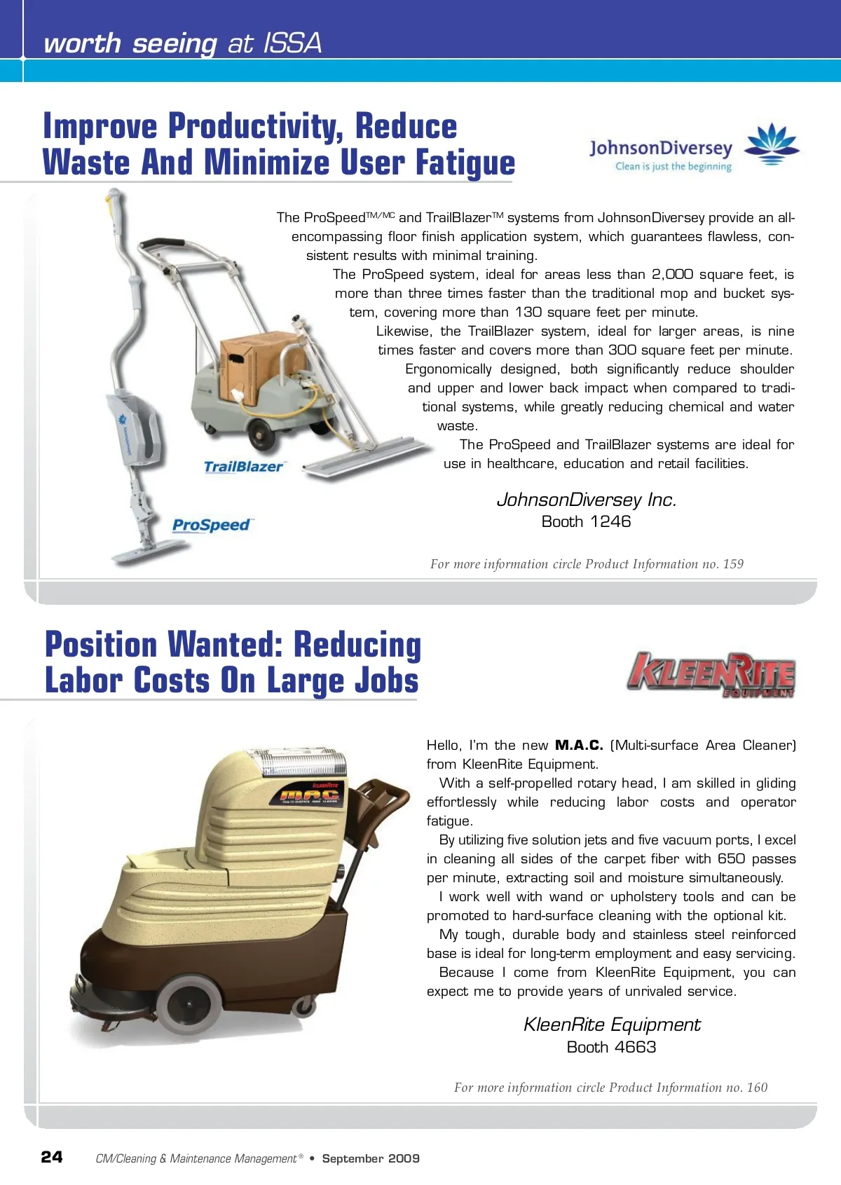 worth seeing at ISSA Improve Productivity, Reduce Waste And Minimize User Fatigue The ProSpeed TM/MC and TrailBlazer TM systems from JohnsonDiversey provide an all-encompassing floor finish application system, which guarantees flawless, con-sistent results with minimal training. The ProSpeed system, ideal for areas less than 2,000 square feet, is more than three times faster than the traditional mop and bucket sys-tem, covering more than 130 square feet per minute. Likewise, the TrailBlazer system, ideal for larger areas, is nine times faster and covers more than 300 square feet per minute. Ergonomically designed, both significantly reduce shoulder and upper and lower back impact when compared to tradi-tional systems, while greatly reducing chemical and water waste. The ProSpeed and TrailBlazer systems are ideal for use in healthcare, education and retail facilities. JohnsonDiversey Inc. Booth 1246 For more information circle Product Information no. 159 Position Wanted: Reducing Labor Costs On Large Jobs Hello, I’m the new M.A.C. (Multi-surface Area Cleaner) from KleenRite Equipment. With a self-propelled rotary head, I am skilled in gliding effortlessly while reducing labor costs and operator fatigue. By utilizing five solution jets and five vacuum ports, I excel in cleaning all sides of the carpet fiber with 650 passes per minute, extracting soil and moisture simultaneously. I work well with wand or upholstery tools and can be promoted to hard-surface cleaning with the optional kit. My tough, durable body and stainless steel reinforced base is ideal for long-term employment and easy servicing. Because I come from KleenRite Equipment, you can expect me to provide years of unrivaled service. KleenRite Equipment Booth 4663 For more information circle Product Information no. 160 24 CM/Cleaning & Maintenance Management ® • September 2009
