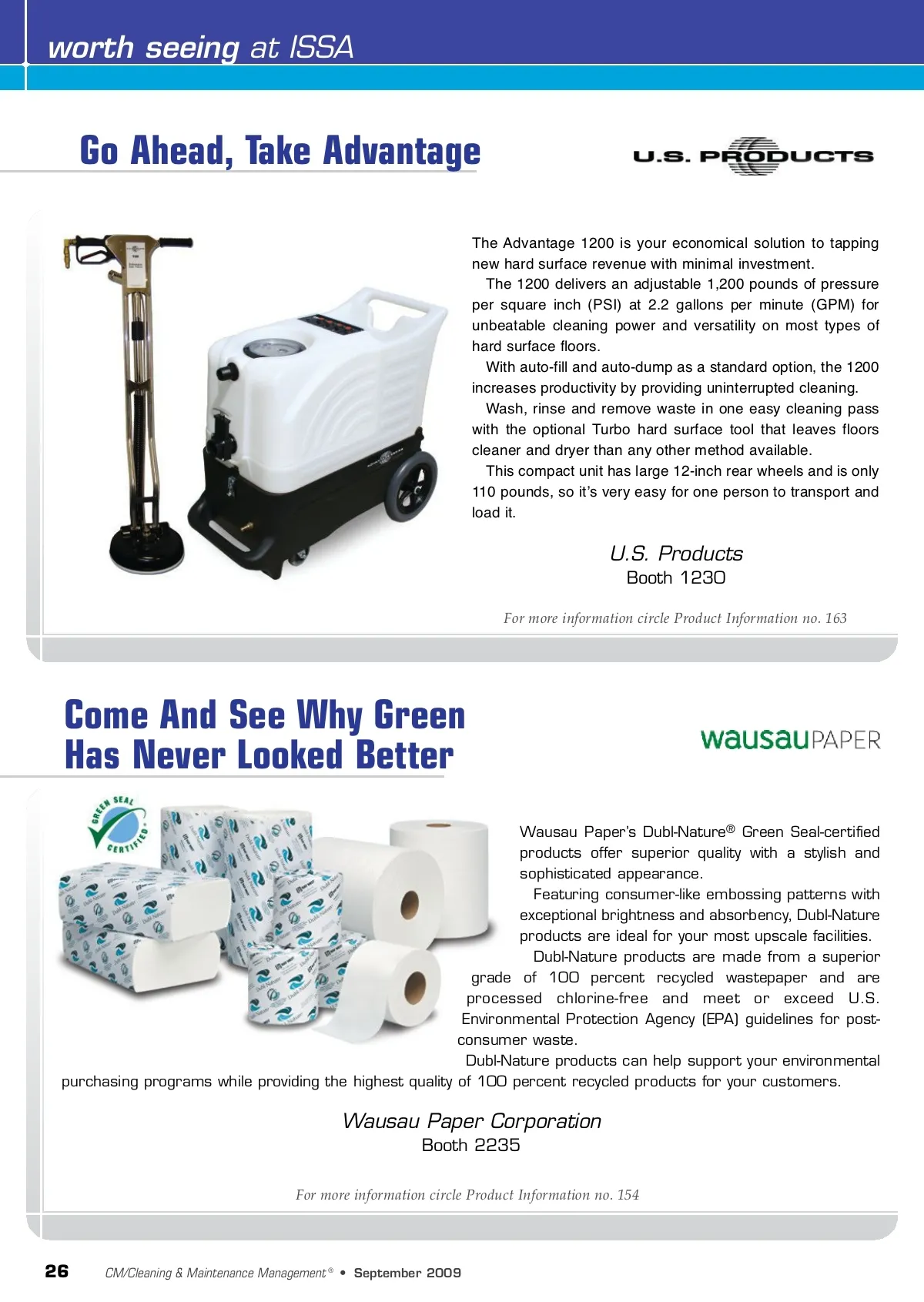 worth seeing at ISSA Go Ahead, Take Advantage The Advantage 1200 is your economical solution to tapping new hard surface revenue with minimal investment. The 1200 delivers an adjustable 1,200 pounds of pressure per square inch (PSI) at 2.2 gallons per minute (GPM) for unbeatable cleaning power and versatility on most types of hard surface floors. With auto-fill and auto-dump as a standard option, the 1200 increases productivity by providing uninterrupted cleaning. Wash, rinse and remove waste in one easy cleaning pass with the optional Turbo hard surface tool that leaves floors cleaner and dryer than any other method available. This compact unit has large 12-inch rear wheels and is only 110 pounds, so itʼs very easy for one person to transport and load it. U.S. Products Booth 1230 For more information circle Product Information no. 163 Come And See Why Green Has Never Looked Better Wausau Paper’s Dubl-Nature ® Green Seal-certified products offer superior quality with a stylish and sophisticated appearance. Featuring consumer-like embossing patterns with exceptional brightness and absorbency, Dubl-Nature products are ideal for your most upscale facilities. Dubl-Nature products are made from a superior grade of 100 percent recycled wastepaper and are processed chlorine-free and meet or exceed U.S. Environmental Protection Agency (EPA) guidelines for post-consumer waste. Dubl-Nature products can help support your environmental purchasing programs while providing the highest quality of 100 percent recycled products for your customers. Wausau Paper Corporation Booth 2235 For more information circle Product Information no. 154 26 CM/Cleaning & Maintenance Management ® • September 2009