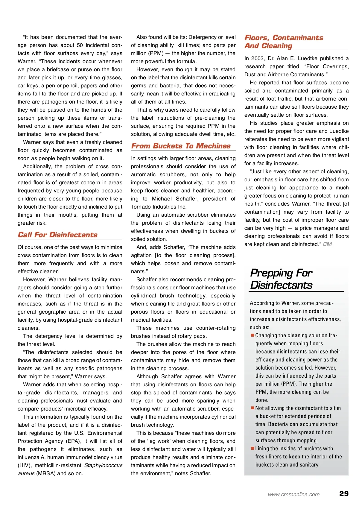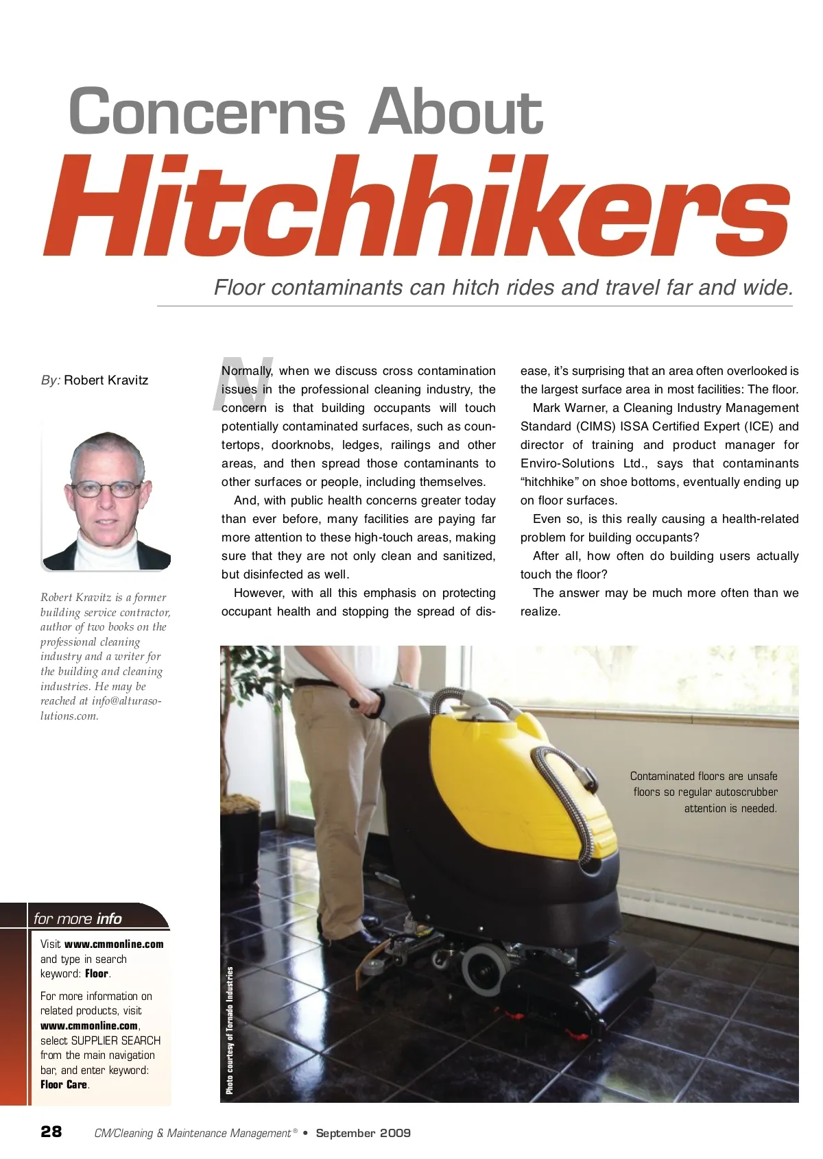 Concerns About Hitchhikers Floor contaminants can hitch rides and travel far and wide. By: Robert Kravitz N Robert Kravitz is a former building service contractor, author of two books on the professional cleaning industry and a writer for the building and cleaning industries. He may be reached at [email protected]. Normally, when we discuss cross contamination issues in the professional cleaning industry, the concern is that building occupants will touch potentially contaminated surfaces, such as coun-tertops, doorknobs, ledges, railings and other areas, and then spread those contaminants to other surfaces or people, including themselves. And, with public health concerns greater today than ever before, many facilities are paying far more attention to these high-touch areas, making sure that they are not only clean and sanitized, but disinfected as well. However, with all this emphasis on protecting occupant health and stopping the spread of dis-ease, itʼs surprising that an area often overlooked is the largest surface area in most facilities: The floor. Mark Warner, a Cleaning Industry Management Standard (CIMS) ISSA Certified Expert (ICE) and director of training and product manager for Enviro-Solutions Ltd., says that contaminants “hitchhike” on shoe bottoms, eventually ending up on floor surfaces. Even so, is this really causing a health-related problem for building occupants? After all, how often do building users actually touch the floor? The answer may be much more often than we realize. Contaminated floors are unsafe floors so regular autoscrubber attention is needed. for more info Visit www.cmmonline.com and type in search keyword: Floor . For more information on related products, visit www.cmmonline.com , select SUPPLIER SEARCH from the main navigation bar, and enter keyword: Floor Care . 28 CM/Cleaning & Maintenance Management ® • September 2009 Photo courtesy of Tornado Industries