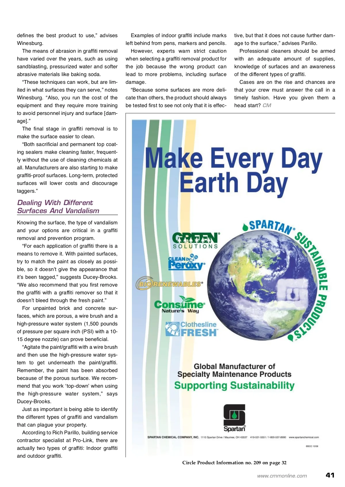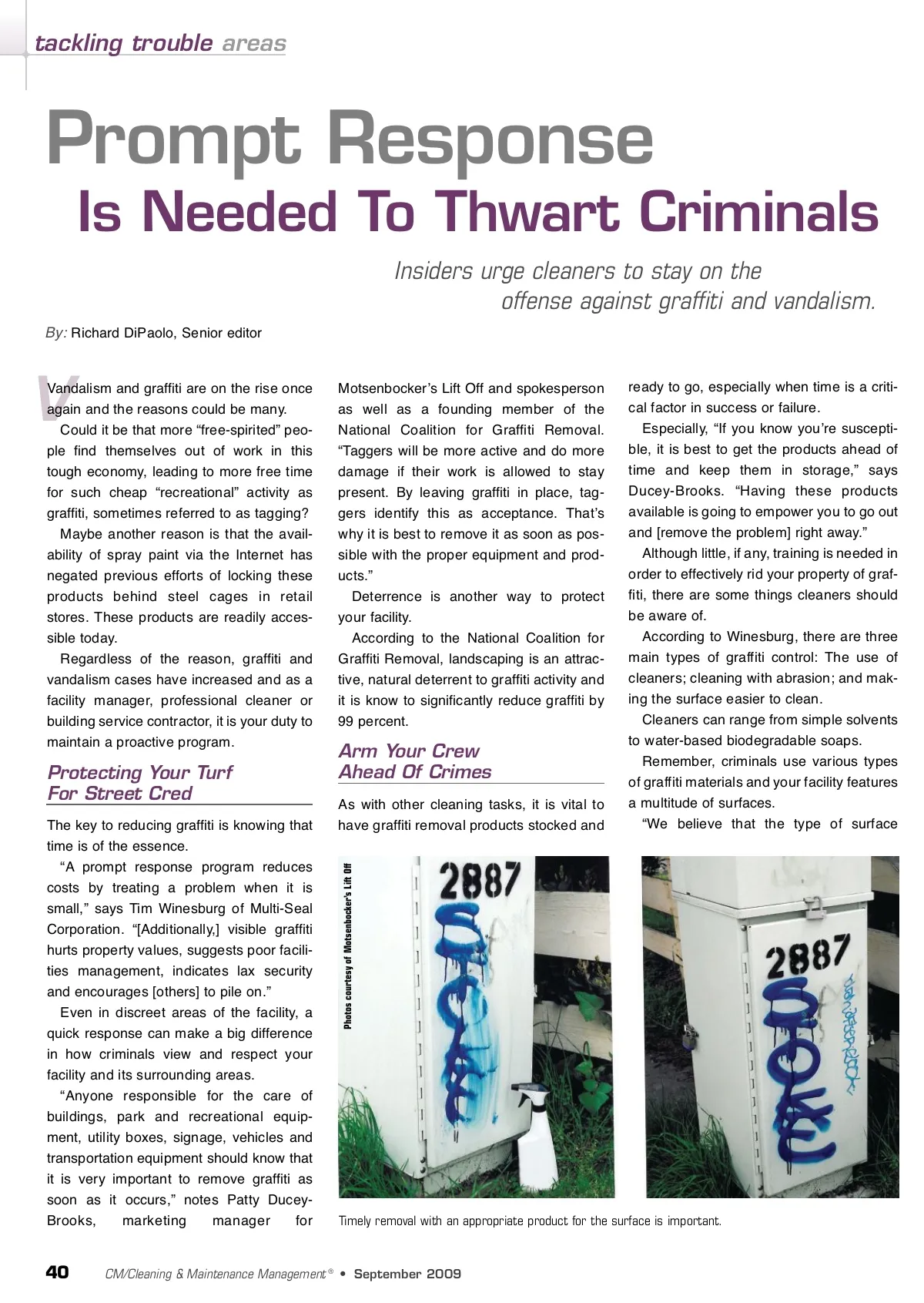 tackling trouble areas Prompt Response Is Needed To Thwart Criminals Insiders urge cleaners to stay on the offense against graffiti and vandalism. By: Richard DiPaolo, Senior editor V Vandalism and graffiti are on the rise once again and the reasons could be many. Could it be that more “free-spirited” peo-ple find themselves out of work in this tough economy, leading to more free time for such cheap “recreational” activity as graffiti, sometimes referred to as tagging? Maybe another reason is that the avail-ability of spray paint via the Internet has negated previous efforts of locking these products behind steel cages in retail stores. These products are readily acces-sible today. Regardless of the reason, graffiti and vandalism cases have increased and as a facility manager, professional cleaner or building service contractor, it is your duty to maintain a proactive program. Motsenbockerʼs Lift Off and spokesperson as well as a founding member of the National Coalition for Graffiti Removal. “Taggers will be more active and do more damage if their work is allowed to stay present. By leaving graffiti in place, tag-gers identify this as acceptance. Thatʼs why it is best to remove it as soon as pos-sible with the proper equipment and prod-ucts.” Deterrence is another way to protect your facility. According to the National Coalition for Graffiti Removal, landscaping is an attrac-tive, natural deterrent to graffiti activity and it is know to significantly reduce graffiti by 99 percent. Protecting Your Turf For Street Cred The key to reducing graffiti is knowing that time is of the essence. “A prompt response program reduces costs by treating a problem when it is small,” says Tim Winesburg of Multi-Seal Corporation. “[Additionally,] visible graffiti hurts property values, suggests poor facili-ties management, indicates lax security and encourages [others] to pile on.” Even in discreet areas of the facility, a quick response can make a big difference in how criminals view and respect your facility and its surrounding areas. “Anyone responsible for the care of buildings, park and recreational equip-ment, utility boxes, signage, vehicles and transportation equipment should know that it is very important to remove graffiti as soon as it occurs,” notes Patty Ducey-Brooks, marketing manager for Arm Your Crew Ahead Of Crimes As with other cleaning tasks, it is vital to have graffiti removal products stocked and Photos courtesy of Motsenbocker’s Lift Off ready to go, especially when time is a criti-cal factor in success or failure. Especially, “If you know youʼre suscepti-ble, it is best to get the products ahead of time and keep them in storage,” says Ducey-Brooks. “Having these products available is going to empower you to go out and [remove the problem] right away.” Although little, if any, training is needed in order to effectively rid your property of graf-fiti, there are some things cleaners should be aware of. According to Winesburg, there are three main types of graffiti control: The use of cleaners; cleaning with abrasion; and mak-ing the surface easier to clean. Cleaners can range from simple solvents to water-based biodegradable soaps. Remember, criminals use various types of graffiti materials and your facility features a multitude of surfaces. “We believe that the type of surface Timely removal with an appropriate product for the surface is important. 40 CM/Cleaning & Maintenance Management ® • September 2009