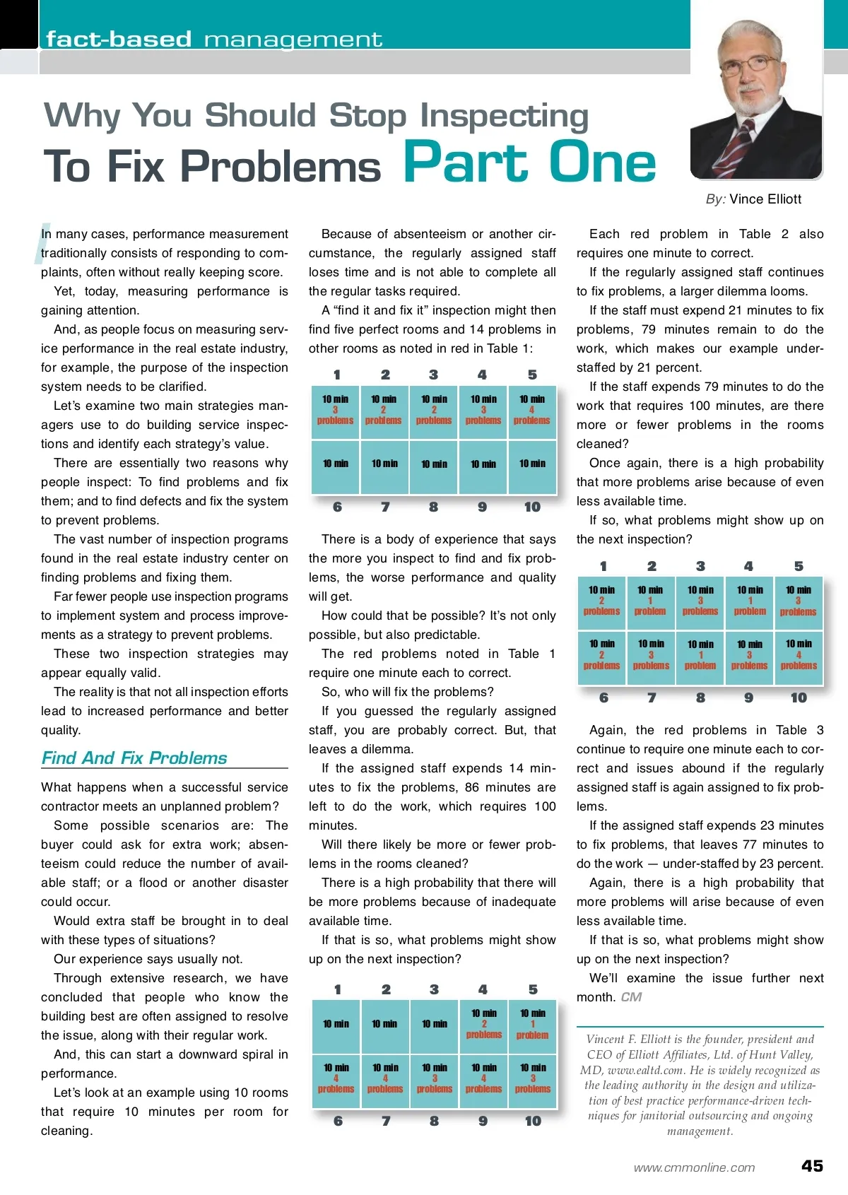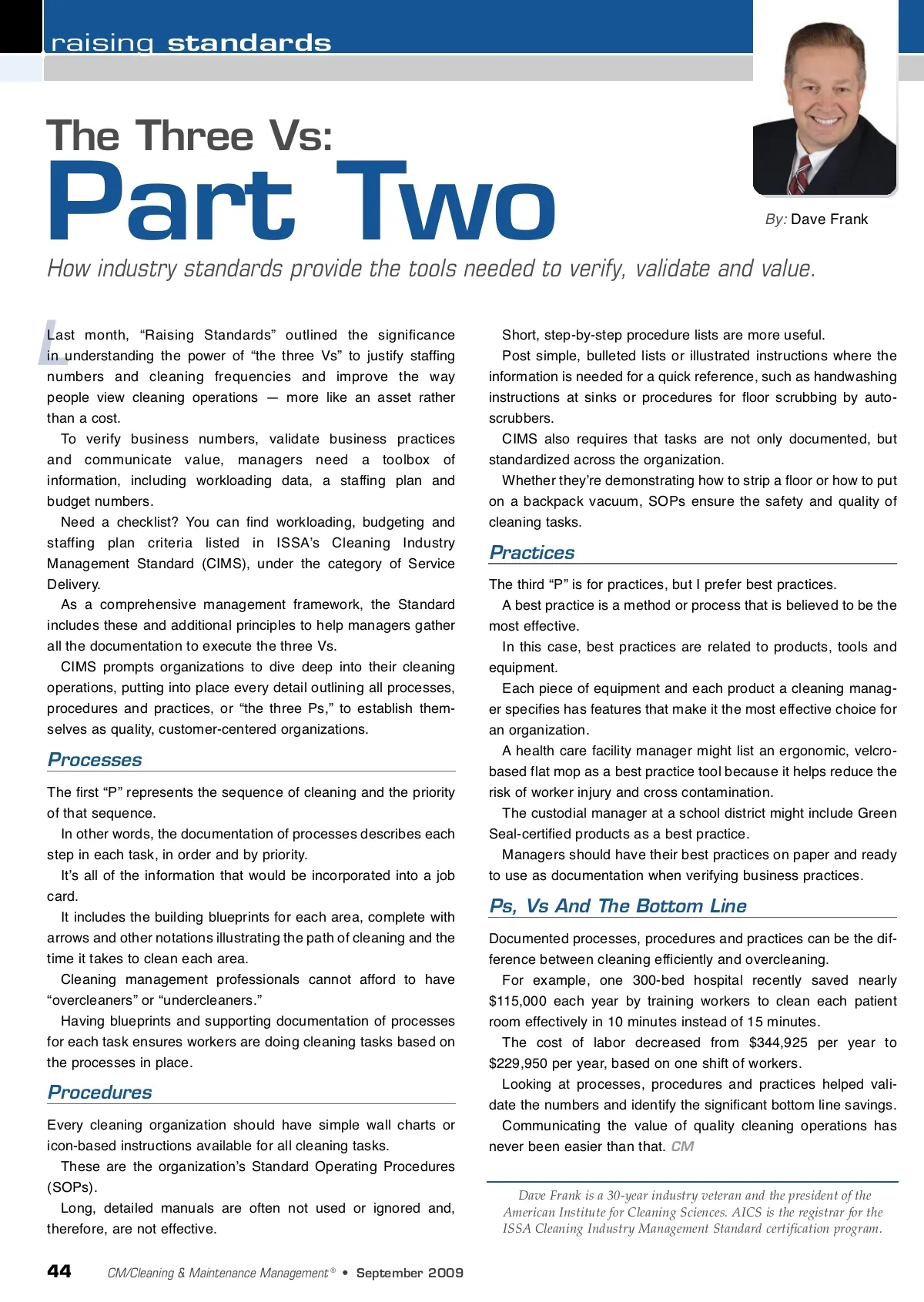 raising standards Part Two L Last month, “Raising Standards” outlined the significance in understanding the power of “the three Vs” to justify staffing numbers and cleaning frequencies and improve the way people view cleaning operations — more like an asset rather than a cost. To verify business numbers, validate business practices and communicate value, managers need a toolbox of information, including workloading data, a staffing plan and budget numbers. Need a checklist? You can find workloading, budgeting and staffing plan criteria listed in ISSAʼs Cleaning Industry Management Standard (CIMS), under the category of Service Delivery. As a comprehensive management framework, the Standard includes these and additional principles to help managers gather all the documentation to execute the three Vs. CIMS prompts organizations to dive deep into their cleaning operations, putting into place every detail outlining all processes, procedures and practices, or “the three Ps,” to establish them-selves as quality, customer-centered organizations. The Three Vs: By: Dave Frank How industry standards provide the tools needed to verify, validate and value. Short, step-by-step procedure lists are more useful. Post simple, bulleted lists or illustrated instructions where the information is needed for a quick reference, such as handwashing instructions at sinks or procedures for floor scrubbing by auto-scrubbers. CIMS also requires that tasks are not only documented, but standardized across the organization. Whether theyʼre demonstrating how to strip a floor or how to put on a backpack vacuum, SOPs ensure the safety and quality of cleaning tasks. Practices The third “P” is for practices, but I prefer best practices. A best practice is a method or process that is believed to be the most effective. In this case, best practices are related to products, tools and equipment. Each piece of equipment and each product a cleaning manag-er specifies has features that make it the most effective choice for an organization. A health care facility manager might list an ergonomic, velcro-based flat mop as a best practice tool because it helps reduce the risk of worker injury and cross contamination. The custodial manager at a school district might include Green Seal-certified products as a best practice. Managers should have their best practices on paper and ready to use as documentation when verifying business practices. Processes The first “P” represents the sequence of cleaning and the priority of that sequence. In other words, the documentation of processes describes each step in each task, in order and by priority. Itʼs all of the information that would be incorporated into a job card. It includes the building blueprints for each area, complete with arrows and other notations illustrating the path of cleaning and the time it takes to clean each area. Cleaning management professionals cannot afford to have “overcleaners” or “undercleaners.” Having blueprints and supporting documentation of processes for each task ensures workers are doing cleaning tasks based on the processes in place. Ps, Vs And The Bottom Line Documented processes, procedures and practices can be the dif-ference between cleaning efficiently and overcleaning. For example, one 300-bed hospital recently saved nearly $115,000 each year by training workers to clean each patient room effectively in 10 minutes instead of 15 minutes. The cost of labor decreased from $344,925 per year to $229,950 per year, based on one shift of workers. Looking at processes, procedures and practices helped vali-date the numbers and identify the significant bottom line savings. Communicating the value of quality cleaning operations has never been easier than that. CM Procedures Every cleaning organization should have simple wall charts or icon-based instructions available for all cleaning tasks. These are the organizationʼs Standard Operating Procedures (SOPs). Long, detailed manuals are often not used or ignored and, therefore, are not effective. Dave Frank is a 30-year industry veteran and the president of the American Institute for Cleaning Sciences. AICS is the registrar for the ISSA Cleaning Industry Management Standard certification program. 44 CM/Cleaning & Maintenance Management ® • September 2009