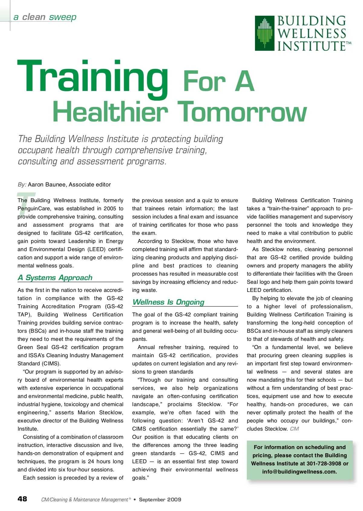 a clean sweep Training By: Aaron Baunee, Associate editor For A Healthier Tomorrow The Building Wellness Institute is protecting building occupant health through comprehensive training, consulting and assessment programs. T The Building Wellness Institute, formerly PenguinCare, was established in 2005 to provide comprehensive training, consulting and assessment programs that are designed to facilitate GS-42 certification, gain points toward Leadership in Energy and Environmental Design (LEED) certifi-cation and support a wide range of environ-mental wellness goals. A Systems Approach As the first in the nation to receive accredi-tation in compliance with the GS-42 Training Accreditation Program (GS-42 TAP), Building Wellness Certification Training provides building service contrac-tors (BSCs) and in-house staff the training they need to meet the requirements of the Green Seal GS-42 certification program and ISSAʼs Cleaning Industry Management Standard (CIMS). “Our program is supported by an adviso-ry board of environmental health experts with extensive experience in occupational and environmental medicine, public health, industrial hygiene, toxicology and chemical engineering,” asserts Marion Stecklow, executive director of the Building Wellness Institute. Consisting of a combination of classroom instruction, interactive discussion and live, hands-on demonstration of equipment and techniques, the program is 24 hours long and divided into six four-hour sessions. Each session is preceded by a review of the previous session and a quiz to ensure that trainees retain information; the last session includes a final exam and issuance of training certificates for those who pass the exam. According to Stecklow, those who have completed training will affirm that standard-izing cleaning products and applying disci-pline and best practices to cleaning processes has resulted in measurable cost savings by increasing efficiency and reduc-ing waste. Wellness Is Ongoing The goal of the GS-42 compliant training program is to increase the health, safety and general well-being of all building occu-pants. Annual refresher training, required to maintain GS-42 certification, provides updates on current legislation and any revi-sions to green standards “Through our training and consulting services, we also help organizations navigate an often-confusing certification landscape,” proclaims Stecklow. “For example, weʼre often faced with the following question: ʻArenʼt GS-42 and CIMS certification essentially the same?ʼ Our position is that educating clients on the differences among the three leading green standards — GS-42, CIMS and LEED — is an essential first step toward achieving their environmental wellness goals.” Building Wellness Certification Training takes a “train-the-trainer” approach to pro-vide facilities management and supervisory personnel the tools and knowledge they need to make a vital contribution to public health and the environment. As Stecklow notes, cleaning personnel that are GS-42 certified provide building owners and property managers the ability to differentiate their facilities with the Green Seal logo and help them gain points toward LEED certification. By helping to elevate the job of cleaning to a higher level of professionalism, Building Wellness Certification Training is transforming the long-held conception of BSCs and in-house staff as simply cleaners to that of stewards of health and safety. “On a fundamental level, we believe that procuring green cleaning supplies is an important first step toward environmen-tal wellness — and several states are now mandating this for their schools — but without a firm understanding of best prac-tices, equipment use and how to execute healthy, hands-on procedures, we can never optimally protect the health of the people who occupy our buildings,” con-cludes Stecklow. CM For information on scheduling and pricing, please contact the Building Wellness Institute at 301-728-3908 or [email protected]. 48 CM/Cleaning & Maintenance Management ® • September 2009