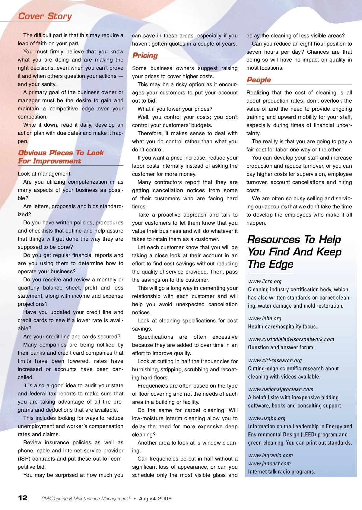 Cover Story The difficult part is that this may require a leap of faith on your part. You must firmly believe that you know what you are doing and are making the right decisions, even when you canʼt prove it and when others question your actions — and your sanity. A primary goal of the business owner or manager must be the desire to gain and maintain a competitive edge over your competition. Write it down, read it daily, develop an action plan with due dates and make it hap-pen. can save in these areas, especially if you havenʼt gotten quotes in a couple of years. delay the cleaning of less visible areas? Can you reduce an eight-hour position to seven hours per day? Chances are that doing so will have no impact on quality in most locations. Pricing Some business owners suggest raising your prices to cover higher costs. This may be a risky option as it encour-ages your customers to put your account out to bid. What if you lower your prices? Well, you control your costs; you donʼt control your customersʼ budgets. Therefore, it makes sense to deal with what you do control rather than what you donʼt control. If you want a price increase, reduce your labor costs internally instead of asking the customer for more money. Many contractors report that they are getting cancellation notices from some of their customers who are facing hard times. Take a proactive approach and talk to your customers to let them know that you value their business and will do whatever it takes to retain them as a customer. Let each customer know that you will be taking a close look at their account in an effort to find cost savings without reducing the quality of service provided. Then, pass the savings on to the customer. This will go a long way in cementing your relationship with each customer and will help you avoid unexpected cancellation notices. Look at cleaning specifications for cost savings. Specifications are often excessive because they are added to over time in an effort to improve quality. Look at cutting in half the frequencies for burnishing, stripping, scrubbing and recoat-ing hard floors. Frequencies are often based on the type of floor covering and not the needs of each area in a building or facility. Do the same for carpet cleaning: Will low-moisture interim cleaning allow you to delay the need for more expensive deep cleaning? Another area to look at is window clean-ing. Can frequencies be cut in half without a significant loss of appearance, or can you schedule only the most visible glass and People Realizing that the cost of cleaning is all about production rates, donʼt overlook the value of and the need to provide ongoing training and upward mobility for your staff, especially during times of financial uncer-tainty. The reality is that you are going to pay a fair cost for labor one way or the other. You can develop your staff and increase production and reduce turnover, or you can pay higher costs for supervision, employee turnover, account cancellations and hiring costs. We are often so busy selling and servic-ing our accounts that we donʼt take the time to develop the employees who make it all happen. Obvious Places To Look For Improvement Look at management. Are you utilizing computerization in as many aspects of your business as possi-ble? Are letters, proposals and bids standard-ized? Do you have written policies, procedures and checklists that outline and help assure that things will get done the way they are supposed to be done? Do you get regular financial reports and are you using them to determine how to operate your business? Do you receive and review a monthly or quarterly balance sheet, profit and loss statement, along with income and expense projections? Have you updated your credit line and credit cards to see if a lower rate is avail-able? Are your credit line and cards secured? Many companies are being notified by their banks and credit card companies that limits have been lowered, rates have increased or accounts have been can-celled. It is also a good idea to audit your state and federal tax reports to make sure that you are taking advantage of all the pro-grams and deductions that are available. This includes looking for ways to reduce unemployment and workerʼs compensation rates and claims. Review insurance policies as well as phone, cable and Internet service provider (ISP) contracts and put these out for com-petitive bid. You may be surprised at how much you Resources To Help You Find And Keep The Edge www.iicrc.org Cleaning industry certification body, which has also written standards on carpet clean-ing, water damage and mold restoration. www.ieha.org Health care/hospitality focus. www.custodialadvisorsnetwork.com Question and answer forum. www.ciri-research.org Cutting-edge scientific research about cleaning with videos available. www.nationalproclean.com A helpful site with inexpensive bidding software, books and consulting support. www.usgbc.org Information on the Leadership in Energy and Environmental Design (LEED) program and green cleaning. You can print out standards. www.iaqradio.com www.jancast.com Internet talk radio programs. 12 CM/Cleaning & Maintenance Management ® • August 2009