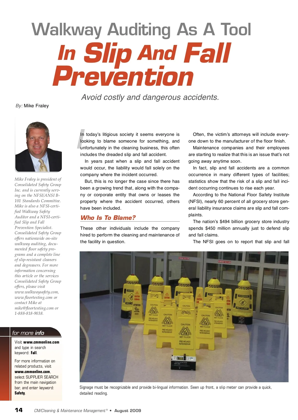 Walkway Auditing As A Tool Slip And Fall Prevention In Avoid costly and dangerous accidents. By: Mike Fraley I Mike Fraley is president of Consolidated Safety Group Inc. and is currently serv-ing on the NFSI/ANSI B-101 Standards Committee. Mike is also a NFSI-certi-fied Walkway Safety Auditor and a NFSI-certi-fied Slip and Fall Prevention Specialist. Consolidated Safety Group offers nationwide on-site walkway auditing, docu-mented floor safety pro-grams and a complete line of slip-resistant cleaners and degreasers. For more information concerning this article or the services Consolidated Safety Group offers, please visit www.walkwaysafety.com, www.floortesting.com or contact Mike at [email protected] or 1-888-818-9038. In todayʼs litigious society it seems everyone is looking to blame someone for something, and unfortunately in the cleaning business, this often includes the dreaded slip and fall accident. In years past when a slip and fall accident would occur, the liability would fall solely on the company where the incident occurred. But, this is no longer the case since there has been a growing trend that, along with the compa-ny or corporate entity that owns or leases the property where the accident occurred, others have been included. Who Is To Blame? These other individuals include the company hired to perform the cleaning and maintenance of the facility in question. Often, the victimʼs attorneys will include every-one down to the manufacturer of the floor finish. Maintenance companies and their employees are starting to realize that this is an issue thatʼs not going away anytime soon. In fact, slip and fall accidents are a common occurrence in many different types of facilities; statistics show that the risk of a slip and fall inci-dent occurring continues to rise each year. According to the National Floor Safety Institute (NFSI), nearly 60 percent of all grocery store gen-eral liability insurance claims are slip and fall com-plaints. The nationʼs $494 billion grocery store industry spends $450 million annually just to defend slip and fall claims. The NFSI goes on to report that slip and fall for more info Visit www.cmmonline.com and type in search keyword: Fall . For more information on related products, visit www.cmmonline.com , select SUPPLIER SEARCH from the main navigation bar, and enter keyword: Safety . Signage must be recognizable and provide bi-lingual information. Seen up front, a slip meter can provide a quick, detailed reading. 14 CM/Cleaning & Maintenance Management ® • August 2009