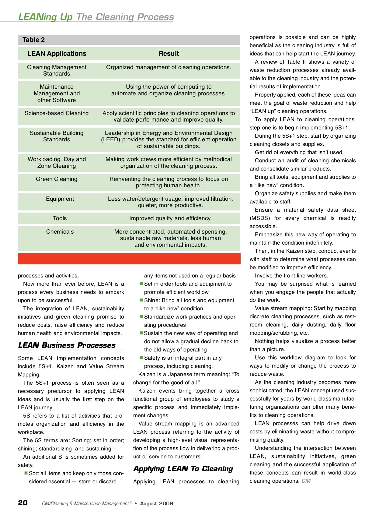 LEANing Up The Cleaning Process Table 2 LEAN Applications Cleaning Management Standards Maintenance Management and other Software Science-based Cleaning Sustainable Building Standards Workloading, Day and Zone Cleaning Green Cleaning Equipment Tools Chemicals operations is possible and can be highly beneficial as the cleaning industry is full of ideas that can help start the LEAN journey. A review of Table II shows a variety of waste reduction processes already avail-able to the cleaning industry and the poten-tial results of implementation. Properly applied, each of these ideas can meet the goal of waste reduction and help “LEAN up” cleaning operations. To apply LEAN to cleaning operations, step one is to begin implementing 5S+1. During the 5S+1 step, start by organizing cleaning closets and supplies. Get rid of everything that isnʼt used. Conduct an audit of cleaning chemicals and consolidate similar products. Bring all tools, equipment and supplies to a “like new” condition. Organize safety supplies and make them available to staff. Ensure a material safety data sheet (MSDS) for every chemical is readily accessible. Emphasize this new way of operating to maintain the condition indefinitely. Then, in the Kaizen step, conduct events with staff to determine what processes can be modified to improve efficiency. Involve the front line workers. You may be surprised what is learned when you engage the people that actually do the work. Value stream mapping: Start by mapping discrete cleaning processes, such as rest-room cleaning, daily dusting, daily floor mopping/scrubbing, etc. Nothing helps visualize a process better than a picture. Use this workflow diagram to look for ways to modify or change the process to reduce waste. As the cleaning industry becomes more sophisticated, the LEAN concept used suc-cessfully for years by world-class manufac-turing organizations can offer many bene-fits to cleaning operations. LEAN processes can help drive down costs by eliminating waste without compro-mising quality. Understanding the intersection between LEAN, sustainability initiatives, green cleaning and the successful application of these concepts can result in world-class cleaning operations. CM Result Organized management of cleaning operations. Using the power of computing to automate and organize cleaning processes. Apply scientific principles to cleaning operations to validate performance and improve quality. Leadership in Energy and Environmental Design (LEED) provides the standard for efficient operation of sustainable buildings. Making work crews more efficient by methodical organization of the cleaning process. Reinventing the cleaning process to focus on protecting human health. Less water/detergent usage, improved filtration, quieter, more productive. Improved quality and efficiency. More concentrated, automated dispensing, sustainable raw materials, less human and environmental impacts. processes and activities. Now more than ever before, LEAN is a process every business needs to embark upon to be successful. The integration of LEAN, sustainability initiatives and green cleaning promise to reduce costs, raise efficiency and reduce human health and environmental impacts. LEAN Business Processes Some LEAN implementation concepts include 5S+1, Kaizen and Value Stream Mapping. The 5S+1 process is often seen as a necessary precursor to applying LEAN ideas and is usually the first step on the LEAN journey. 5S refers to a list of activities that pro-motes organization and efficiency in the workplace. The 5S terms are: Sorting; set in order; shining; standardizing; and sustaining. An additional S is sometimes added for safety. Sort all items and keep only those con-sidered essential — store or discard any items not used on a regular basis Set in order tools and equipment to promote efficient workflow Shine: Bring all tools and equipment to a “like new” condition Standardize work practices and oper-ating procedures Sustain the new way of operating and do not allow a gradual decline back to the old ways of operating Safety is an integral part in any process, including cleaning. Kaizen is a Japanese term meaning: “To change for the good of all.” Kaizen events bring together a cross functional group of employees to study a specific process and immediately imple-ment changes. Value stream mapping is an advanced LEAN process referring to the activity of developing a high-level visual representa-tion of the process flow in delivering a prod-uct or service to customers. Applying LEAN To Cleaning Applying LEAN processes to cleaning 20 CM/Cleaning & Maintenance Management ® • August 2009