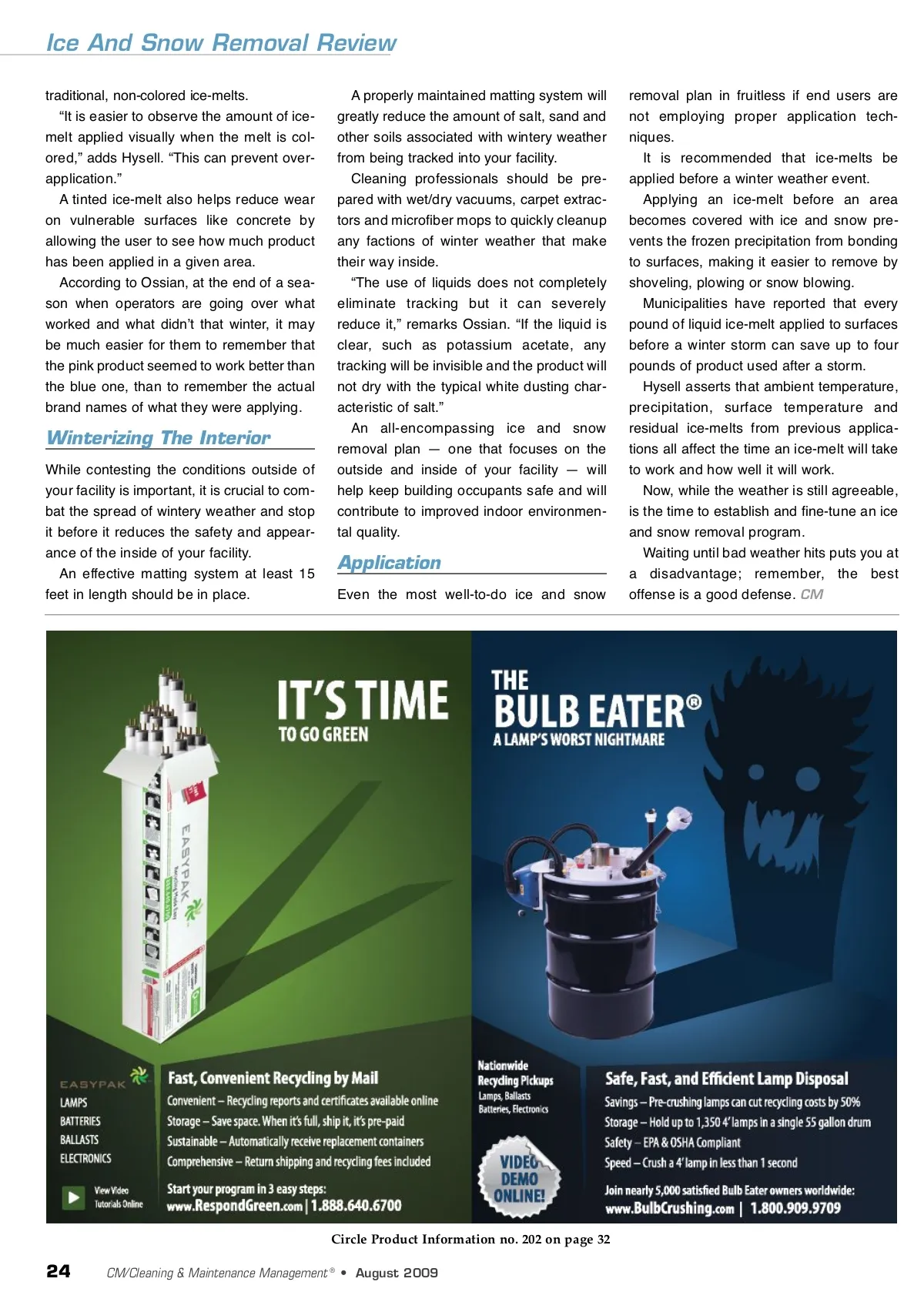 Ice And Snow Removal Review traditional, non-colored ice-melts. “It is easier to observe the amount of ice-melt applied visually when the melt is col-ored,” adds Hysell. “This can prevent over-application.” A tinted ice-melt also helps reduce wear on vulnerable surfaces like concrete by allowing the user to see how much product has been applied in a given area. According to Ossian, at the end of a sea-son when operators are going over what worked and what didnʼt that winter, it may be much easier for them to remember that the pink product seemed to work better than the blue one, than to remember the actual brand names of what they were applying. A properly maintained matting system will greatly reduce the amount of salt, sand and other soils associated with wintery weather from being tracked into your facility. Cleaning professionals should be pre-pared with wet/dry vacuums, carpet extrac-tors and microfiber mops to quickly cleanup any factions of winter weather that make their way inside. “The use of liquids does not completely eliminate tracking but it can severely reduce it,” remarks Ossian. “If the liquid is clear, such as potassium acetate, any tracking will be invisible and the product will not dry with the typical white dusting char-acteristic of salt.” An all-encompassing ice and snow removal plan — one that focuses on the outside and inside of your facility — will help keep building occupants safe and will contribute to improved indoor environmen-tal quality. removal plan in fruitless if end users are not employing proper application tech-niques. It is recommended that ice-melts be applied before a winter weather event. Applying an ice-melt before an area becomes covered with ice and snow pre-vents the frozen precipitation from bonding to surfaces, making it easier to remove by shoveling, plowing or snow blowing. Municipalities have reported that every pound of liquid ice-melt applied to surfaces before a winter storm can save up to four pounds of product used after a storm. Hysell asserts that ambient temperature, precipitation, surface temperature and residual ice-melts from previous applica-tions all affect the time an ice-melt will take to work and how well it will work. Now, while the weather is still agreeable, is the time to establish and fine-tune an ice and snow removal program. Waiting until bad weather hits puts you at a disadvantage; remember, the best offense is a good defense. CM Winterizing The Interior While contesting the conditions outside of your facility is important, it is crucial to com-bat the spread of wintery weather and stop it before it reduces the safety and appear-ance of the inside of your facility. An effective matting system at least 15 feet in length should be in place. Application Even the most well-to-do ice and snow Circle Product Information no. 202 on page 32 24 CM/Cleaning & Maintenance Management ® • August 2009
