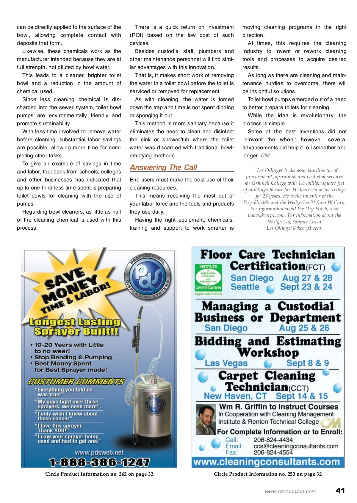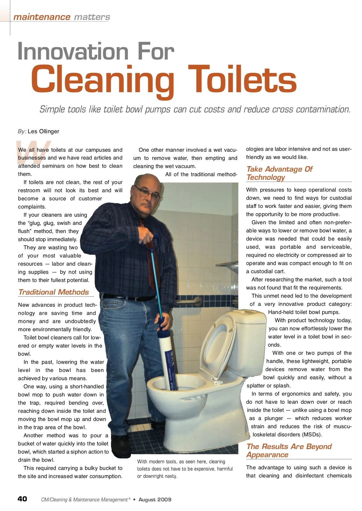 maintenance matters Innovation For Cleaning Toilets Simple tools like toilet bowl pumps can cut costs and reduce cross contamination. One other manner involved a wet vacu-um to remove water, then empting and cleaning the wet vacuum. All of the traditional method-ologies are labor intensive and not as user-friendly as we would like. By: Les Ollinger W We all have toilets at our campuses and businesses and we have read articles and attended seminars on how best to clean them. If toilets are not clean, the rest of your restroom will not look its best and will become a source of customer complaints. If your cleaners are using the “glug, glug, swish and flush” method, then they should stop immediately. They are wasting two of your most valuable resources — labor and clean-ing supplies — by not using them to their fullest potential. Take Advantage Of Technology With pressures to keep operational costs down, we need to find ways for custodial staff to work faster and easier, giving them the opportunity to be more productive. Given the limited and often non-prefer-able ways to lower or remove bowl water, a device was needed that could be easily used, was portable and serviceable, required no electricity or compressed air to operate and was compact enough to fit on a custodial cart. After researching the market, such a tool was not found that fit the requirements. This unmet need led to the development of a very innovative product category: Hand-held toilet bowl pumps. With product technology today, you can now effortlessly lower the water level in a toilet bowl in sec-onds. With one or two pumps of the handle, these lightweight, portable devices remove water from the bowl quickly and easily, without a splatter or splash. In terms of ergonomics and safety, you do not have to lean down over or reach inside the toilet — unlike using a bowl mop as a plunger — which reduces worker strain and reduces the risk of muscu-loskeletal disorders (MSDs). Traditional Methods New advances in product tech-nology are saving time and money and are undoubtedly more environmentally friendly. Toilet bowl cleaners call for low-ered or empty water levels in the bowl. In the past, lowering the water level in the bowl has been achieved by various means. One way, using a short-handled bowl mop to push water down in the trap, required bending over, reaching down inside the toilet and moving the bowl mop up and down in the trap area of the bowl. Another method was to pour a bucket of water quickly into the toilet bowl, which started a siphon action to drain the bowl. This required carrying a bulky bucket to the site and increased water consumption. The Results Are Beyond Appearance With modern tools, as seen here, clearing toilets does not have to be expensive, harmful or downright nasty. The advantage to using such a device is that cleaning and disinfectant chemicals 40 CM/Cleaning & Maintenance Management ® • August 2009