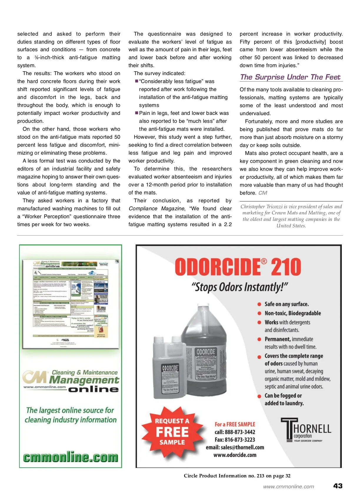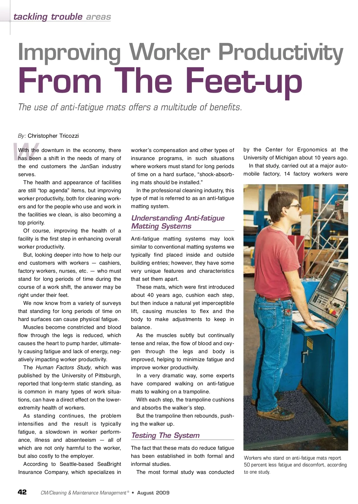 tackling trouble areas Improving Worker Productivity From The Feet-up The use of anti-fatigue mats offers a multitude of benefits. By: Christopher Tricozzi W With the downturn in the economy, there has been a shift in the needs of many of the end customers the JanSan industry serves. The health and appearance of facilities are still “top agenda” items, but improving worker productivity, both for cleaning work-ers and for the people who use and work in the facilities we clean, is also becoming a top priority. Of course, improving the health of a facility is the first step in enhancing overall worker productivity. But, looking deeper into how to help our end customers with workers — cashiers, factory workers, nurses, etc. — who must stand for long periods of time during the course of a work shift, the answer may be right under their feet. We now know from a variety of surveys that standing for long periods of time on hard surfaces can cause physical fatigue. Muscles become constricted and blood flow through the legs is reduced, which causes the heart to pump harder, ultimate-ly causing fatigue and lack of energy, neg-atively impacting worker productivity. The Human Factors Study , which was published by the University of Pittsburgh, reported that long-term static standing, as is common in many types of work situa-tions, can have a direct effect on the lower-extremity health of workers. As standing continues, the problem intensifies and the result is typically fatigue, a slowdown in worker perform-ance, illness and absenteeism — all of which are not only harmful to the worker, but also costly to the employer. According to Seattle-based SeaBright Insurance Company, which specializes in workerʼs compensation and other types of insurance programs, in such situations where workers must stand for long periods of time on a hard surface, “shock-absorb-ing mats should be installed.” In the professional cleaning industry, this type of mat is referred to as an anti-fatigue matting system. by the Center for Ergonomics at the University of Michigan about 10 years ago. In that study, carried out at a major auto-mobile factory, 14 factory workers were Understanding Anti-fatigue Matting Systems Anti-fatigue matting systems may look similar to conventional matting systems we typically find placed inside and outside building entries; however, they have some very unique features and characteristics that set them apart. These mats, which were first introduced about 40 years ago, cushion each step, but then induce a natural yet imperceptible lift, causing muscles to flex and the body to make adjustments to keep in balance. As the muscles subtly but continually tense and relax, the flow of blood and oxy-gen through the legs and body is improved, helping to minimize fatigue and improve worker productivity. In a very dramatic way, some experts have compared walking on anti-fatigue mats to walking on a trampoline. With each step, the trampoline cushions and absorbs the walkerʼs step. But the trampoline then rebounds, push-ing the walker up. Testing The System The fact that these mats do reduce fatigue has been established in both formal and informal studies. The most formal study was conducted Workers who stand on anti-fatigue mats report 50 percent less fatigue and discomfort, according to one study. 42 CM/Cleaning & Maintenance Management ® • August 2009