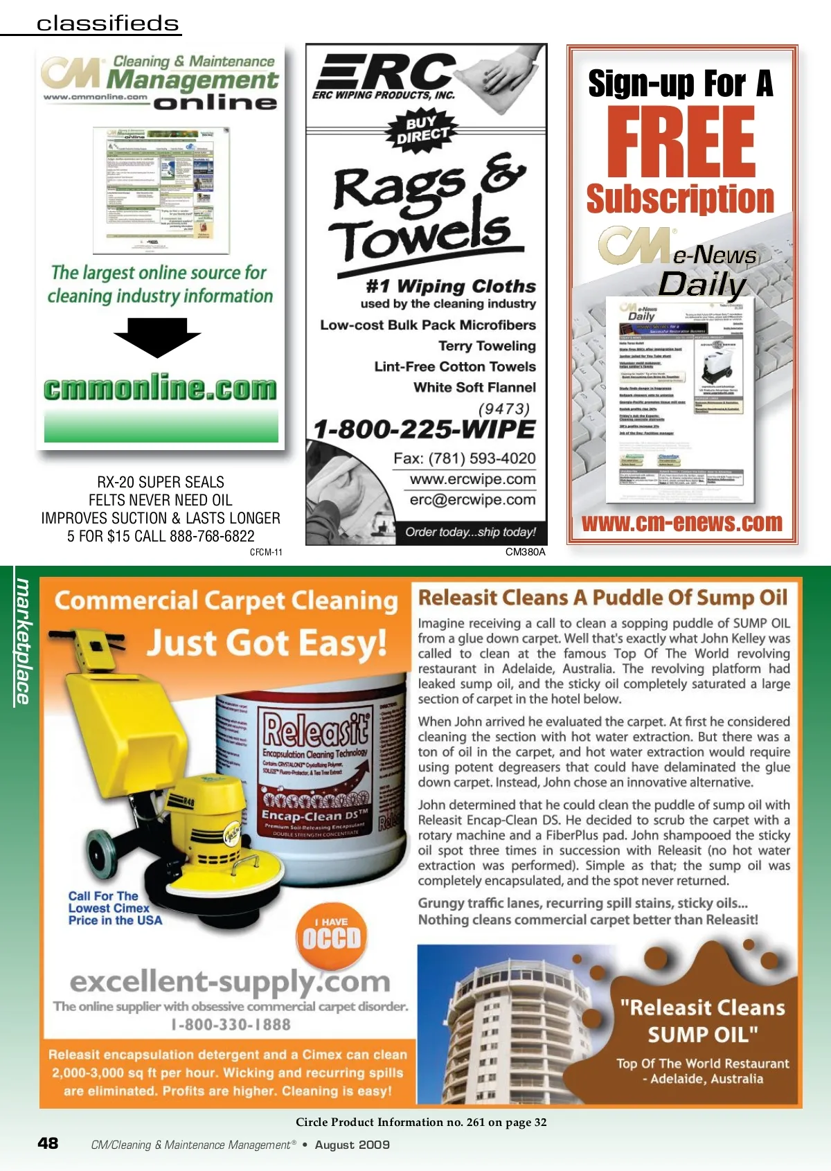 classifieds Sign-up For A FREE Subscription e-News Daily RX-20 SUPER SEALS FELTS NEVER NEED OIL IMPROVES SUCTION & LASTS LONGER 5 FOR $15 CALL 888-768-6822 CFCM-11 www.cm-enews.com CM380A marketplace Circle Product Information no. 261 on page 32 48 CM/Cleaning & Maintenance Management ® • August 2009