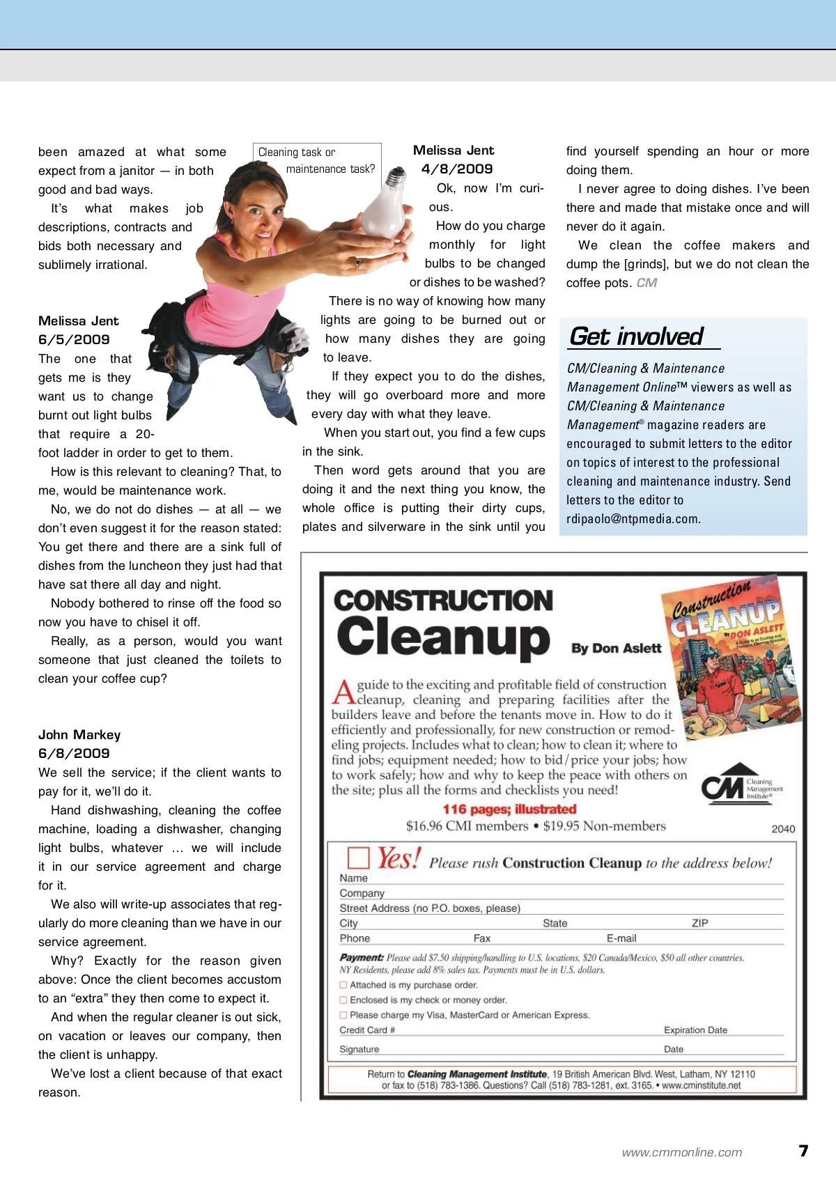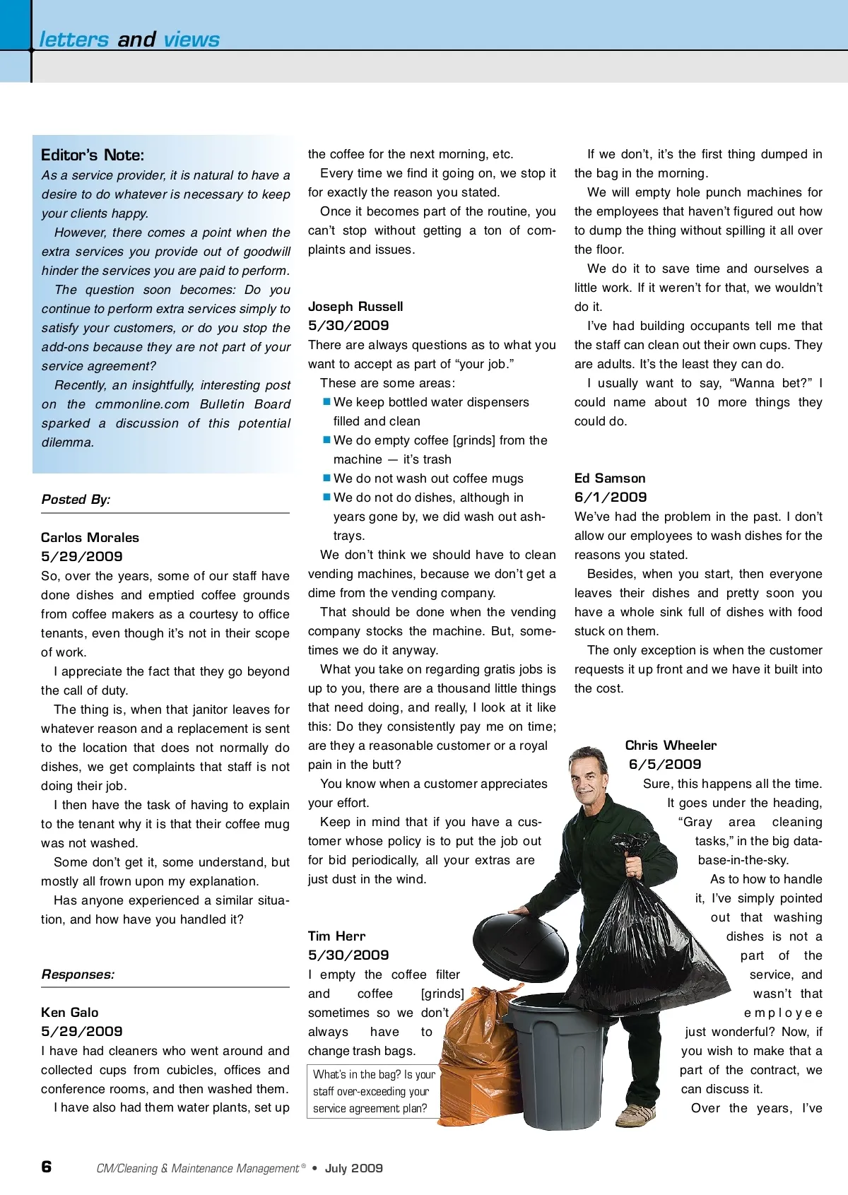 letters and views Editor’s Note: As a service provider, it is natural to have a desire to do whatever is necessary to keep your clients happy. However, there comes a point when the extra services you provide out of goodwill hinder the services you are paid to perform. The question soon becomes: Do you continue to perform extra services simply to satisfy your customers, or do you stop the add-ons because they are not part of your service agreement? Recently, an insightfully, interesting post on the cmmonline.com Bulletin Board sparked a discussion of this potential dilemma. the coffee for the next morning, etc. Every time we find it going on, we stop it for exactly the reason you stated. Once it becomes part of the routine, you canʼt stop without getting a ton of com-plaints and issues. Posted By: Carlos Morales 5/29/2009 So, over the years, some of our staff have done dishes and emptied coffee grounds from coffee makers as a courtesy to office tenants, even though itʼs not in their scope of work. I appreciate the fact that they go beyond the call of duty. The thing is, when that janitor leaves for whatever reason and a replacement is sent to the location that does not normally do dishes, we get complaints that staff is not doing their job. I then have the task of having to explain to the tenant why it is that their coffee mug was not washed. Some donʼt get it, some understand, but mostly all frown upon my explanation. Has anyone experienced a similar situa-tion, and how have you handled it? Joseph Russell 5/30/2009 There are always questions as to what you want to accept as part of “your job.” These are some areas: We keep bottled water dispensers filled and clean We do empty coffee [grinds] from the machine — itʼs trash We do not wash out coffee mugs We do not do dishes, although in years gone by, we did wash out ash-trays. We donʼt think we should have to clean vending machines, because we donʼt get a dime from the vending company. That should be done when the vending company stocks the machine. But, some-times we do it anyway. What you take on regarding gratis jobs is up to you, there are a thousand little things that need doing, and really, I look at it like this: Do they consistently pay me on time; are they a reasonable customer or a royal pain in the butt? You know when a customer appreciates your effort. Keep in mind that if you have a cus-tomer whose policy is to put the job out for bid periodically, all your extras are just dust in the wind. If we donʼt, itʼs the first thing dumped in the bag in the morning. We will empty hole punch machines for the employees that havenʼt figured out how to dump the thing without spilling it all over the floor. We do it to save time and ourselves a little work. If it werenʼt for that, we wouldnʼt do it. Iʼve had building occupants tell me that the staff can clean out their own cups. They are adults. Itʼs the least they can do. I usually want to say, “Wanna bet?” I could name about 10 more things they could do. Ed Samson 6/1/2009 Weʼve had the problem in the past. I donʼt allow our employees to wash dishes for the reasons you stated. Besides, when you start, then everyone leaves their dishes and pretty soon you have a whole sink full of dishes with food stuck on them. The only exception is when the customer requests it up front and we have it built into the cost. Responses: Ken Galo 5/29/2009 I have had cleaners who went around and collected cups from cubicles, offices and conference rooms, and then washed them. I have also had them water plants, set up Tim Herr 5/30/2009 I empty the coffee filter and coffee [grinds] sometimes so we donʼt always have to change trash bags. What’s in the bag? Is your staff over-exceeding your service agreement plan? Chris Wheeler 6/5/2009 Sure, this happens all the time. It goes under the heading, “Gray area cleaning tasks,” in the big data-base-in-the-sky. As to how to handle it, Iʼve simply pointed out that washing dishes is not a part of the service, and wasnʼt that employee just wonderful? Now, if you wish to make that a part of the contract, we can discuss it. Over the years, Iʼve 6 CM/Cleaning & Maintenance Management ® • July 2009