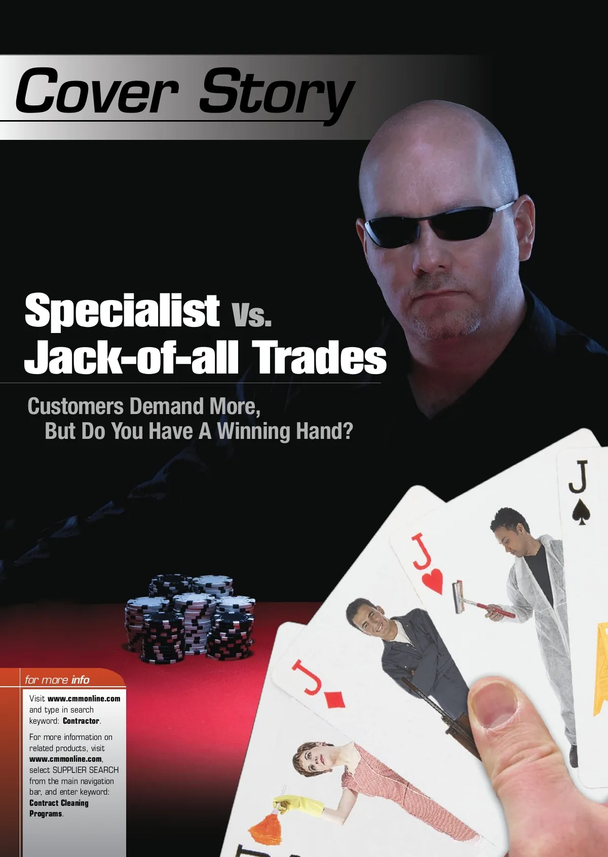 Cover Story Specialist Vs. Jack-of-all Trades Customers Demand More, But Do You Have A Winning Hand? Circle Product Information no. ? on page ? for more info Visit www.cmmonline.com and type in search keyword: Contractor . For more information on related products, visit www.cmmonline.com , select SUPPLIER SEARCH from the main navigation bar, and enter keyword: Contract Cleaning Programs .