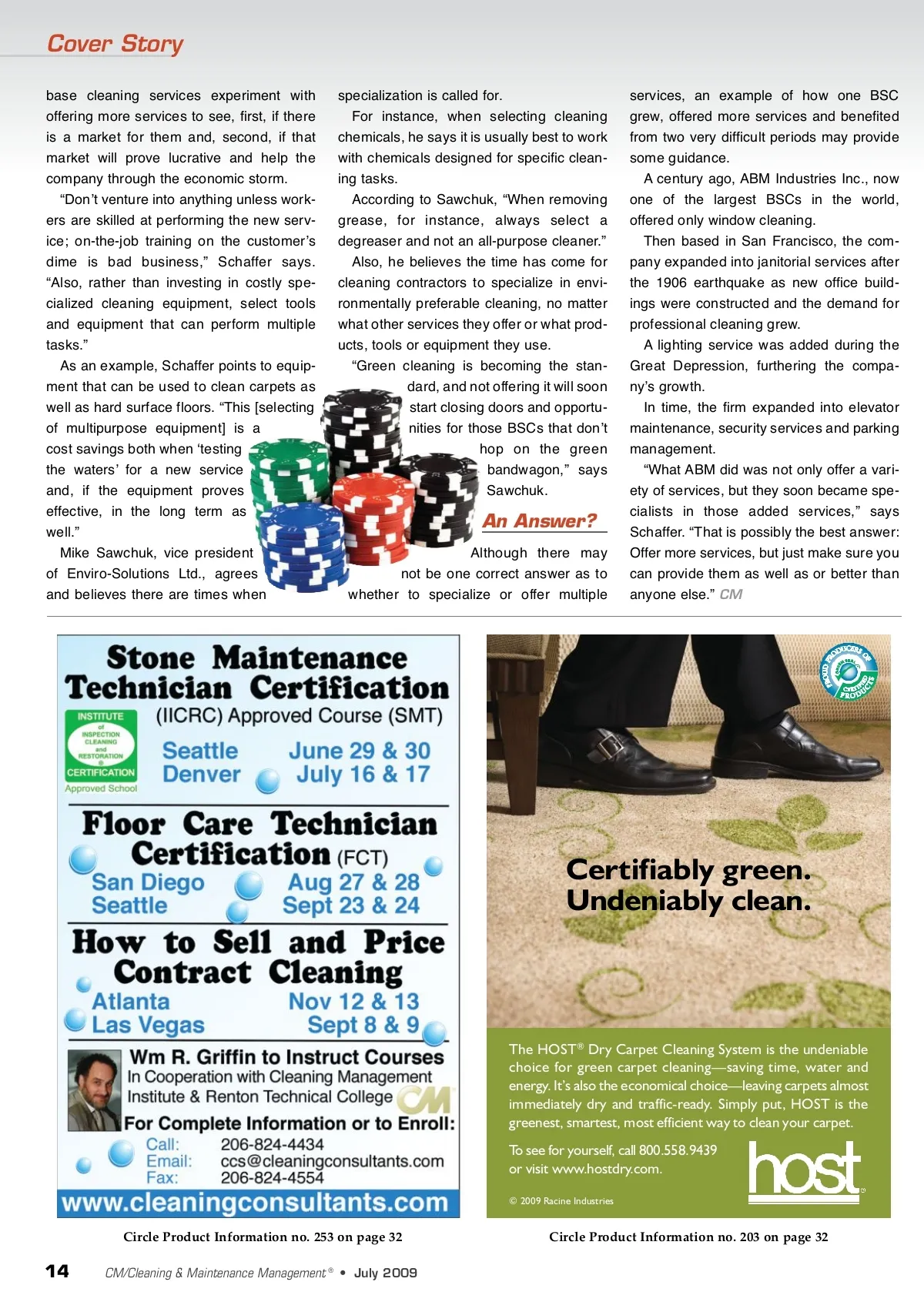 Cover Story base cleaning services experiment with offering more services to see, first, if there is a market for them and, second, if that market will prove lucrative and help the company through the economic storm. “Donʼt venture into anything unless work-ers are skilled at performing the new serv-ice; on-the-job training on the customerʼs dime is bad business,” Schaffer says. “Also, rather than investing in costly spe-cialized cleaning equipment, select tools and equipment that can perform multiple tasks.” As an example, Schaffer points to equip-ment that can be used to clean carpets as well as hard surface floors. “This [selecting of multipurpose equipment] is a cost savings both when ʻtesting the watersʼ for a new service and, if the equipment proves effective, in the long term as well.” Mike Sawchuk, vice president of Enviro-Solutions Ltd., agrees and believes there are times when specialization is called for. For instance, when selecting cleaning chemicals, he says it is usually best to work with chemicals designed for specific clean-ing tasks. According to Sawchuk, “When removing grease, for instance, always select a degreaser and not an all-purpose cleaner.” Also, he believes the time has come for cleaning contractors to specialize in envi-ronmentally preferable cleaning, no matter what other services they offer or what prod-ucts, tools or equipment they use. “Green cleaning is becoming the stan-dard, and not offering it will soon start closing doors and opportu-nities for those BSCs that donʼt hop on the green bandwagon,” says Sawchuk. services, an example of how one BSC grew, offered more services and benefited from two very difficult periods may provide some guidance. A century ago, ABM Industries Inc., now one of the largest BSCs in the world, offered only window cleaning. Then based in San Francisco, the com-pany expanded into janitorial services after the 1906 earthquake as new office build-ings were constructed and the demand for professional cleaning grew. A lighting service was added during the Great Depression, furthering the compa-nyʼs growth. In time, the firm expanded into elevator maintenance, security services and parking management. “What ABM did was not only offer a vari-ety of services, but they soon became spe-cialists in those added services,” says Schaffer. “That is possibly the best answer: Offer more services, but just make sure you can provide them as well as or better than anyone else.” CM An Answer? Although there may not be one correct answer as to whether to specialize or offer multiple Certifiably green. Undeniably clean. The HOST ® Dry Carpet Cleaning System is the undeniable choice for green carpet cleaning—saving time, water and energy. It’s also the economical choice—leaving carpets almost immediately dry and traffic-ready. Simply put, HOST is the greenest, smartest, most efficient way to clean your carpet. To see for yourself, call 800.558.9439 or visit www.hostdry.com. © 2009 Racine Industries Circle Product Information no. 253 on page 32 Circle Product Information no. 203 on page 32 14 CM/Cleaning & Maintenance Management ® • July 2009