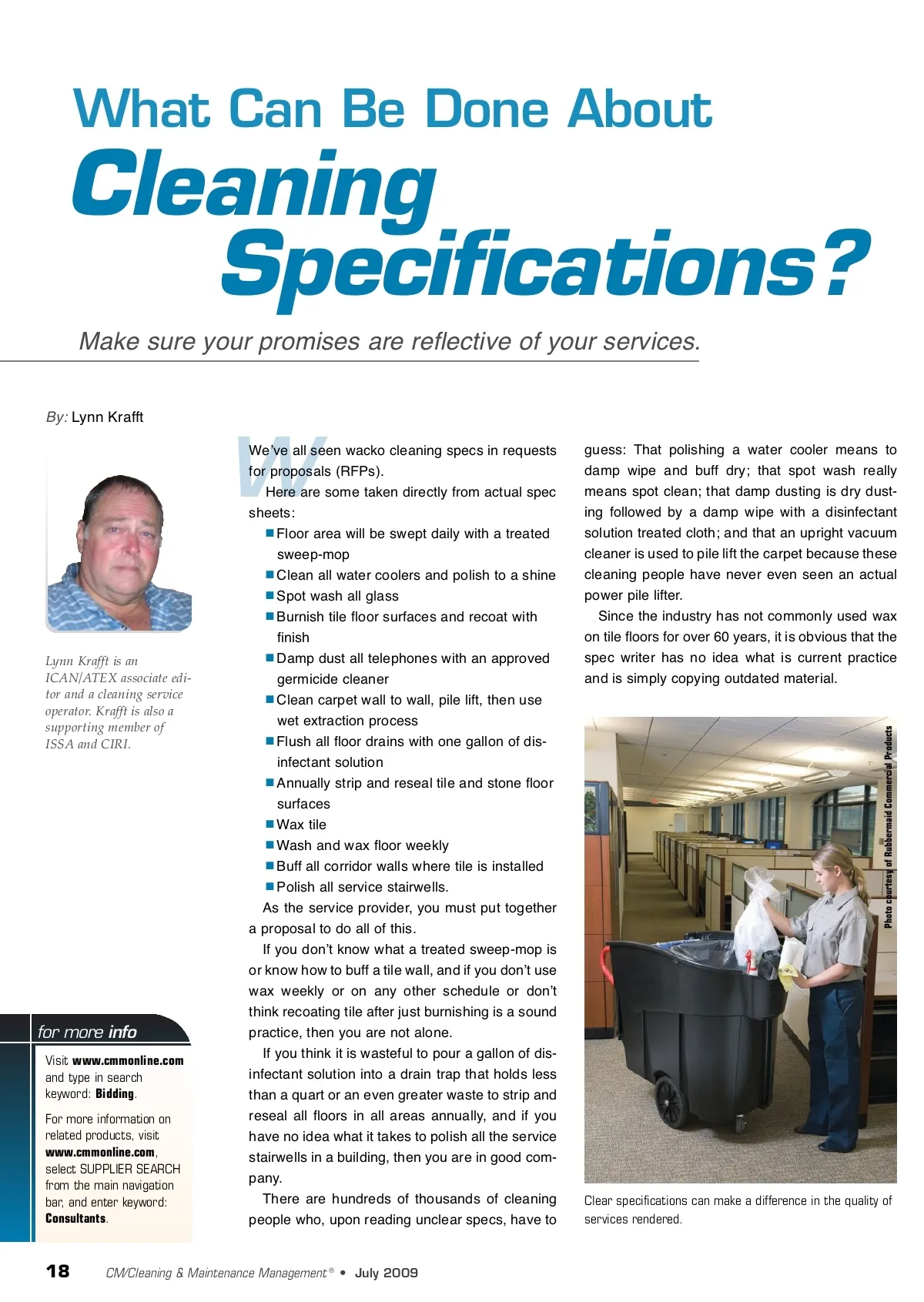 What Can Be Done About Cleaning Specifications? Make sure your promises are reflective of your services. By: Lynn Krafft W Lynn Krafft is an ICAN/ATEX associate edi-tor and a cleaning service operator. Krafft is also a supporting member of ISSA and CIRI. for more info Visit www.cmmonline.com and type in search keyword: Bidding . For more information on related products, visit www.cmmonline.com , select SUPPLIER SEARCH from the main navigation bar, and enter keyword: Consultants . Weʼve all seen wacko cleaning specs in requests for proposals (RFPs). Here are some taken directly from actual spec sheets: Floor area will be swept daily with a treated sweep-mop Clean all water coolers and polish to a shine Spot wash all glass Burnish tile floor surfaces and recoat with finish Damp dust all telephones with an approved germicide cleaner Clean carpet wall to wall, pile lift, then use wet extraction process Flush all floor drains with one gallon of dis-infectant solution Annually strip and reseal tile and stone floor surfaces Wax tile Wash and wax floor weekly Buff all corridor walls where tile is installed Polish all service stairwells. As the service provider, you must put together a proposal to do all of this. If you donʼt know what a treated sweep-mop is or know how to buff a tile wall, and if you donʼt use wax weekly or on any other schedule or donʼt think recoating tile after just burnishing is a sound practice, then you are not alone. If you think it is wasteful to pour a gallon of dis-infectant solution into a drain trap that holds less than a quart or an even greater waste to strip and reseal all floors in all areas annually, and if you have no idea what it takes to polish all the service stairwells in a building, then you are in good com-pany. There are hundreds of thousands of cleaning people who, upon reading unclear specs, have to guess: That polishing a water cooler means to damp wipe and buff dry; that spot wash really means spot clean; that damp dusting is dry dust-ing followed by a damp wipe with a disinfectant solution treated cloth; and that an upright vacuum cleaner is used to pile lift the carpet because these cleaning people have never even seen an actual power pile lifter. Since the industry has not commonly used wax on tile floors for over 60 years, it is obvious that the spec writer has no idea what is current practice and is simply copying outdated material. Clear specifications can make a difference in the quality of services rendered. 18 CM/Cleaning & Maintenance Management ® • July 2009 Photo courtesy of Rubbermaid Commercial Products