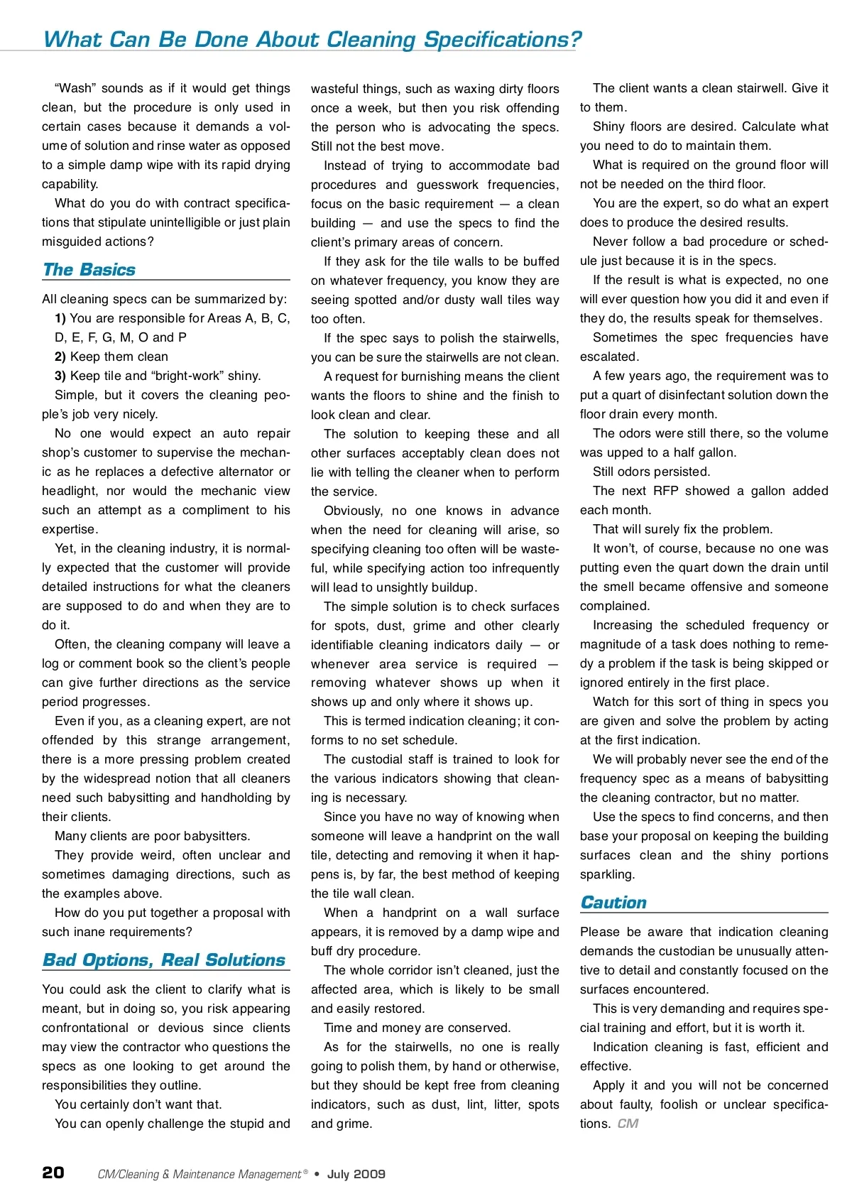 What Can Be Done About Cleaning Specifications? “Wash” sounds as if it would get things clean, but the procedure is only used in certain cases because it demands a vol-ume of solution and rinse water as opposed to a simple damp wipe with its rapid drying capability. What do you do with contract specifica-tions that stipulate unintelligible or just plain misguided actions? wasteful things, such as waxing dirty floors once a week, but then you risk offending the person who is advocating the specs. Still not the best move. Instead of trying to accommodate bad procedures and guesswork frequencies, focus on the basic requirement — a clean building — and use the specs to find the clientʼs primary areas of concern. If they ask for the tile walls to be buffed on whatever frequency, you know they are seeing spotted and/or dusty wall tiles way too often. If the spec says to polish the stairwells, you can be sure the stairwells are not clean. A request for burnishing means the client wants the floors to shine and the finish to look clean and clear. The solution to keeping these and all other surfaces acceptably clean does not lie with telling the cleaner when to perform the service. Obviously, no one knows in advance when the need for cleaning will arise, so specifying cleaning too often will be waste-ful, while specifying action too infrequently will lead to unsightly buildup. The simple solution is to check surfaces for spots, dust, grime and other clearly identifiable cleaning indicators daily — or whenever area service is required — removing whatever shows up when it shows up and only where it shows up. This is termed indication cleaning; it con-forms to no set schedule. The custodial staff is trained to look for the various indicators showing that clean-ing is necessary. Since you have no way of knowing when someone will leave a handprint on the wall tile, detecting and removing it when it hap-pens is, by far, the best method of keeping the tile wall clean. When a handprint on a wall surface appears, it is removed by a damp wipe and buff dry procedure. The whole corridor isnʼt cleaned, just the affected area, which is likely to be small and easily restored. Time and money are conserved. As for the stairwells, no one is really going to polish them, by hand or otherwise, but they should be kept free from cleaning indicators, such as dust, lint, litter, spots and grime. The client wants a clean stairwell. Give it to them. Shiny floors are desired. Calculate what you need to do to maintain them. What is required on the ground floor will not be needed on the third floor. You are the expert, so do what an expert does to produce the desired results. Never follow a bad procedure or sched-ule just because it is in the specs. If the result is what is expected, no one will ever question how you did it and even if they do, the results speak for themselves. Sometimes the spec frequencies have escalated. A few years ago, the requirement was to put a quart of disinfectant solution down the floor drain every month. The odors were still there, so the volume was upped to a half gallon. Still odors persisted. The next RFP showed a gallon added each month. That will surely fix the problem. It wonʼt, of course, because no one was putting even the quart down the drain until the smell became offensive and someone complained. Increasing the scheduled frequency or magnitude of a task does nothing to reme-dy a problem if the task is being skipped or ignored entirely in the first place. Watch for this sort of thing in specs you are given and solve the problem by acting at the first indication. We will probably never see the end of the frequency spec as a means of babysitting the cleaning contractor, but no matter. Use the specs to find concerns, and then base your proposal on keeping the building surfaces clean and the shiny portions sparkling. The Basics All cleaning specs can be summarized by: 1) You are responsible for Areas A, B, C, D, E, F, G, M, O and P 2) Keep them clean 3) Keep tile and “bright-work” shiny. Simple, but it covers the cleaning peo-pleʼs job very nicely. No one would expect an auto repair shopʼs customer to supervise the mechan-ic as he replaces a defective alternator or headlight, nor would the mechanic view such an attempt as a compliment to his expertise. Yet, in the cleaning industry, it is normal-ly expected that the customer will provide detailed instructions for what the cleaners are supposed to do and when they are to do it. Often, the cleaning company will leave a log or comment book so the clientʼs people can give further directions as the service period progresses. Even if you, as a cleaning expert, are not offended by this strange arrangement, there is a more pressing problem created by the widespread notion that all cleaners need such babysitting and handholding by their clients. Many clients are poor babysitters. They provide weird, often unclear and sometimes damaging directions, such as the examples above. How do you put together a proposal with such inane requirements? Caution Please be aware that indication cleaning demands the custodian be unusually atten-tive to detail and constantly focused on the surfaces encountered. This is very demanding and requires spe-cial training and effort, but it is worth it. Indication cleaning is fast, efficient and effective. Apply it and you will not be concerned about faulty, foolish or unclear specifica-tions. CM Bad Options, Real Solutions You could ask the client to clarify what is meant, but in doing so, you risk appearing confrontational or devious since clients may view the contractor who questions the specs as one looking to get around the responsibilities they outline. You certainly donʼt want that. You can openly challenge the stupid and 20 CM/Cleaning & Maintenance Management ® • July 2009