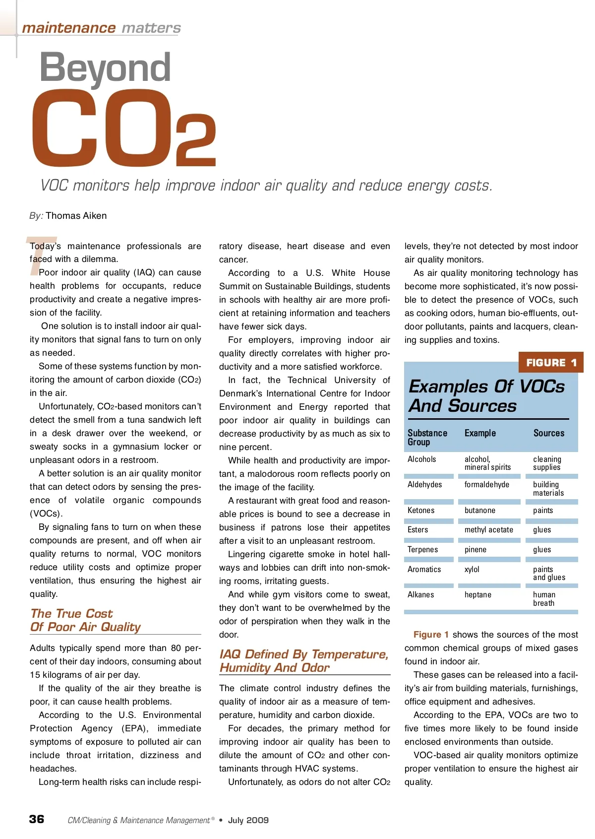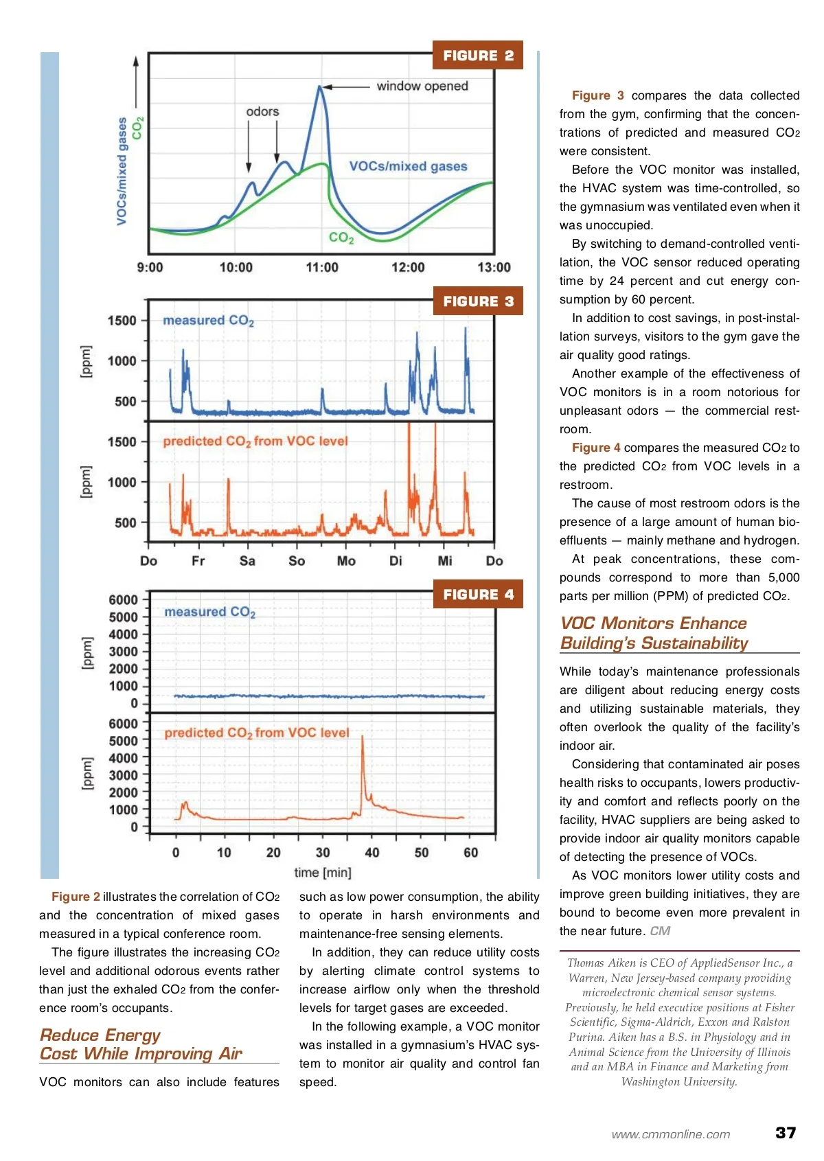 F I G U R E 2 Figure 3 compares the data collected from the gym, confirming that the concen-trations of predicted and measured CO 2 were consistent. Before the VOC monitor was installed, the HVAC system was time-controlled, so the gymnasium was ventilated even when it was unoccupied. By switching to demand-controlled venti-lation, the VOC sensor reduced operating time by 24 percent and cut energy con-sumption by 60 percent. In addition to cost savings, in post-instal-lation surveys, visitors to the gym gave the air quality good ratings. Another example of the effectiveness of VOC monitors is in a room notorious for unpleasant odors — the commercial rest-room. Figure 4 compares the measured CO 2 to the predicted CO 2 from VOC levels in a restroom. The cause of most restroom odors is the presence of a large amount of human bio-effluents — mainly methane and hydrogen. At peak concentrations, these com-pounds correspond to more than 5,000 parts per million (PPM) of predicted CO 2 . F I G U R E 3 F I G U R E 4 VOC Monitors Enhance Building’s Sustainability While todayʼs maintenance professionals are diligent about reducing energy costs and utilizing sustainable materials, they often overlook the quality of the facilityʼs indoor air. Considering that contaminated air poses health risks to occupants, lowers productiv-ity and comfort and reflects poorly on the facility, HVAC suppliers are being asked to provide indoor air quality monitors capable of detecting the presence of VOCs. As VOC monitors lower utility costs and improve green building initiatives, they are bound to become even more prevalent in the near future. CM Thomas Aiken is CEO of AppliedSensor Inc., a Warren, New Jersey-based company providing microelectronic chemical sensor systems. Previously, he held executive positions at Fisher Scientific, Sigma-Aldrich, Exxon and Ralston Purina. Aiken has a B.S. in Physiology and in Animal Science from the University of Illinois and an MBA in Finance and Marketing from Washington University. Figure 2 illustrates the correlation of CO 2 and the concentration of mixed gases measured in a typical conference room. The figure illustrates the increasing CO 2 level and additional odorous events rather than just the exhaled CO 2 from the confer-ence roomʼs occupants. Reduce Energy Cost While Improving Air VOC monitors can also include features such as low power consumption, the ability to operate in harsh environments and maintenance-free sensing elements. In addition, they can reduce utility costs by alerting climate control systems to increase airflow only when the threshold levels for target gases are exceeded. In the following example, a VOC monitor was installed in a gymnasiumʼs HVAC sys-tem to monitor air quality and control fan speed. www.cmmonline.com 37