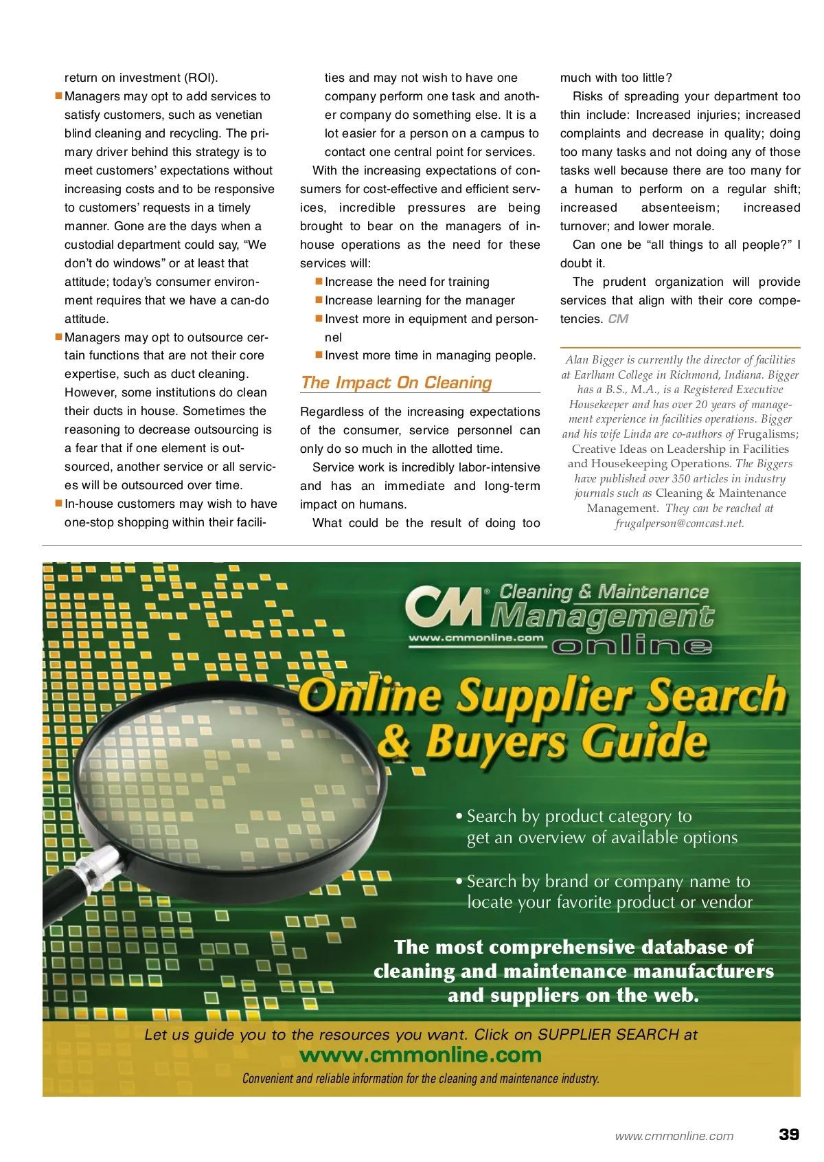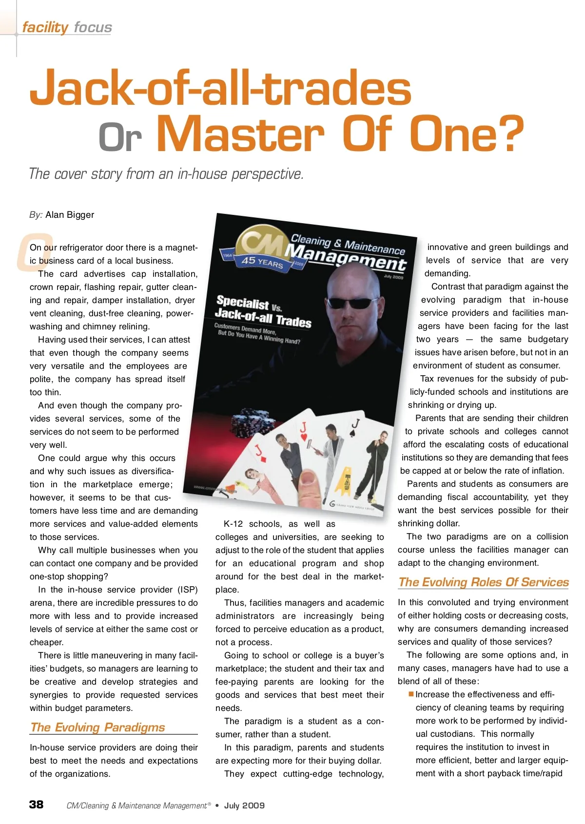 facility focus Jack-of-all-trades Or Master Of One? The cover story from an in-house perspective. By: Alan Bigger O On our refrigerator door there is a magnet-ic business card of a local business. The card advertises cap installation, crown repair, flashing repair, gutter clean-ing and repair, damper installation, dryer vent cleaning, dust-free cleaning, power-washing and chimney relining. Having used their services, I can attest that even though the company seems very versatile and the employees are polite, the company has spread itself too thin. And even though the company pro-vides several services, some of the services do not seem to be performed very well. One could argue why this occurs and why such issues as diversifica-tion in the marketplace emerge; however, it seems to be that cus-tomers have less time and are demanding more services and value-added elements to those services. Why call multiple businesses when you can contact one company and be provided one-stop shopping? In the in-house service provider (ISP) arena, there are incredible pressures to do more with less and to provide increased levels of service at either the same cost or cheaper. There is little maneuvering in many facil-itiesʼ budgets, so managers are learning to be creative and develop strategies and synergies to provide requested services within budget parameters. The Evolving Paradigms In-house service providers are doing their best to meet the needs and expectations of the organizations. K-12 schools, as well as colleges and universities, are seeking to adjust to the role of the student that applies for an educational program and shop around for the best deal in the market-place. Thus, facilities managers and academic administrators are increasingly being forced to perceive education as a product, not a process. Going to school or college is a buyerʼs marketplace; the student and their tax and fee-paying parents are looking for the goods and services that best meet their needs. The paradigm is a student as a con-sumer, rather than a student. In this paradigm, parents and students are expecting more for their buying dollar. They expect cutting-edge technology, innovative and green buildings and levels of service that are very demanding. Contrast that paradigm against the evolving paradigm that in-house service providers and facilities man-agers have been facing for the last two years — the same budgetary issues have arisen before, but not in an environment of student as consumer. Tax revenues for the subsidy of pub-licly-funded schools and institutions are shrinking or drying up. Parents that are sending their children to private schools and colleges cannot afford the escalating costs of educational institutions so they are demanding that fees be capped at or below the rate of inflation. Parents and students as consumers are demanding fiscal accountability, yet they want the best services possible for their shrinking dollar. The two paradigms are on a collision course unless the facilities manager can adapt to the changing environment. The Evolving Roles Of Services In this convoluted and trying environment of either holding costs or decreasing costs, why are consumers demanding increased services and quality of those services? The following are some options and, in many cases, managers have had to use a blend of all of these: Increase the effectiveness and effi-ciency of cleaning teams by requiring more work to be performed by individ-ual custodians. This normally requires the institution to invest in more efficient, better and larger equip-ment with a short payback time/rapid 38 CM/Cleaning & Maintenance Management ® • July 2009