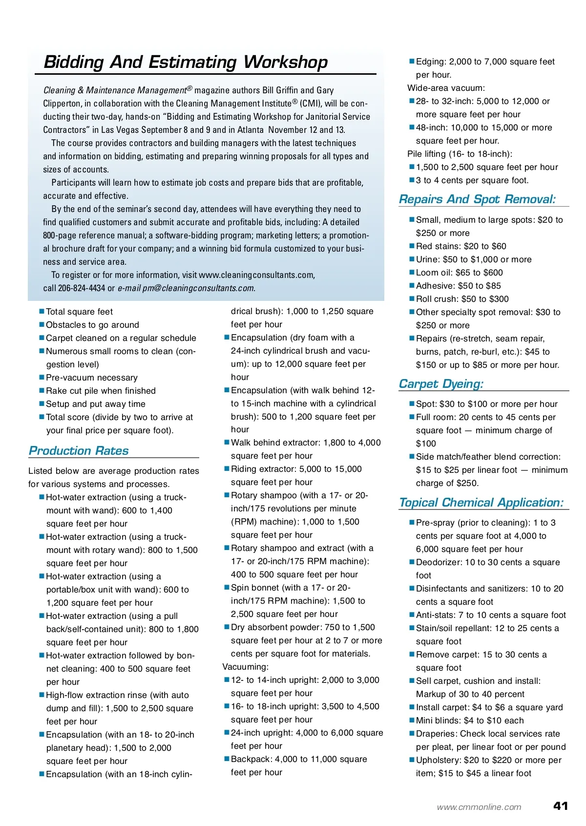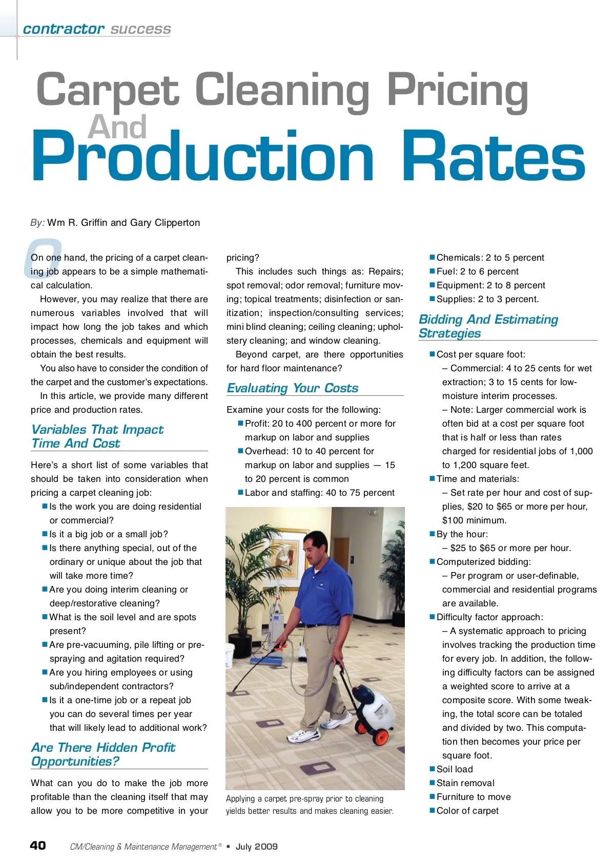 contractor success Carpet Cleaning Pricing Production Rates By: Wm R. Griffin and Gary Clipperton And O On one hand, the pricing of a carpet clean-ing job appears to be a simple mathemati-cal calculation. However, you may realize that there are numerous variables involved that will impact how long the job takes and which processes, chemicals and equipment will obtain the best results. You also have to consider the condition of the carpet and the customerʼs expectations. In this article, we provide many different price and production rates. pricing? This includes such things as: Repairs; spot removal; odor removal; furniture mov-ing; topical treatments; disinfection or san-itization; inspection/consulting services; mini blind cleaning; ceiling cleaning; uphol-stery cleaning; and window cleaning. Beyond carpet, are there opportunities for hard floor maintenance? Chemicals: 2 to 5 percent Fuel: 2 to 6 percent Equipment: 2 to 8 percent Supplies: 2 to 3 percent. Bidding And Estimating Strategies Cost per square foot: – Commercial: 4 to 25 cents for wet extraction; 3 to 15 cents for low-moisture interim processes. – Note: Larger commercial work is often bid at a cost per square foot that is half or less than rates charged for residential jobs of 1,000 to 1,200 square feet. Time and materials: – Set rate per hour and cost of sup-plies, $20 to $65 or more per hour, $100 minimum. By the hour: – $25 to $65 or more per hour. Computerized bidding: – Per program or user-definable, commercial and residential programs are available. Difficulty factor approach: – A systematic approach to pricing involves tracking the production time for every job. In addition, the follow-ing difficulty factors can be assigned a weighted score to arrive at a composite score. With some tweak-ing, the total score can be totaled and divided by two. This computa-tion then becomes your price per square foot. Soil load Stain removal Furniture to move Color of carpet Evaluating Your Costs Examine your costs for the following: Profit: 20 to 400 percent or more for markup on labor and supplies Overhead: 10 to 40 percent for markup on labor and supplies — 15 to 20 percent is common Labor and staffing: 40 to 75 percent Variables That Impact Time And Cost Hereʼs a short list of some variables that should be taken into consideration when pricing a carpet cleaning job: Is the work you are doing residential or commercial? Is it a big job or a small job? Is there anything special, out of the ordinary or unique about the job that will take more time? Are you doing interim cleaning or deep/restorative cleaning? What is the soil level and are spots present? Are pre-vacuuming, pile lifting or pre-spraying and agitation required? Are you hiring employees or using sub/independent contractors? Is it a one-time job or a repeat job you can do several times per year that will likely lead to additional work? Are There Hidden Profit Opportunities? What can you do to make the job more profitable than the cleaning itself that may allow you to be more competitive in your Applying a carpet pre-spray prior to cleaning yields better results and makes cleaning easier. 40 CM/Cleaning & Maintenance Management ® • July 2009