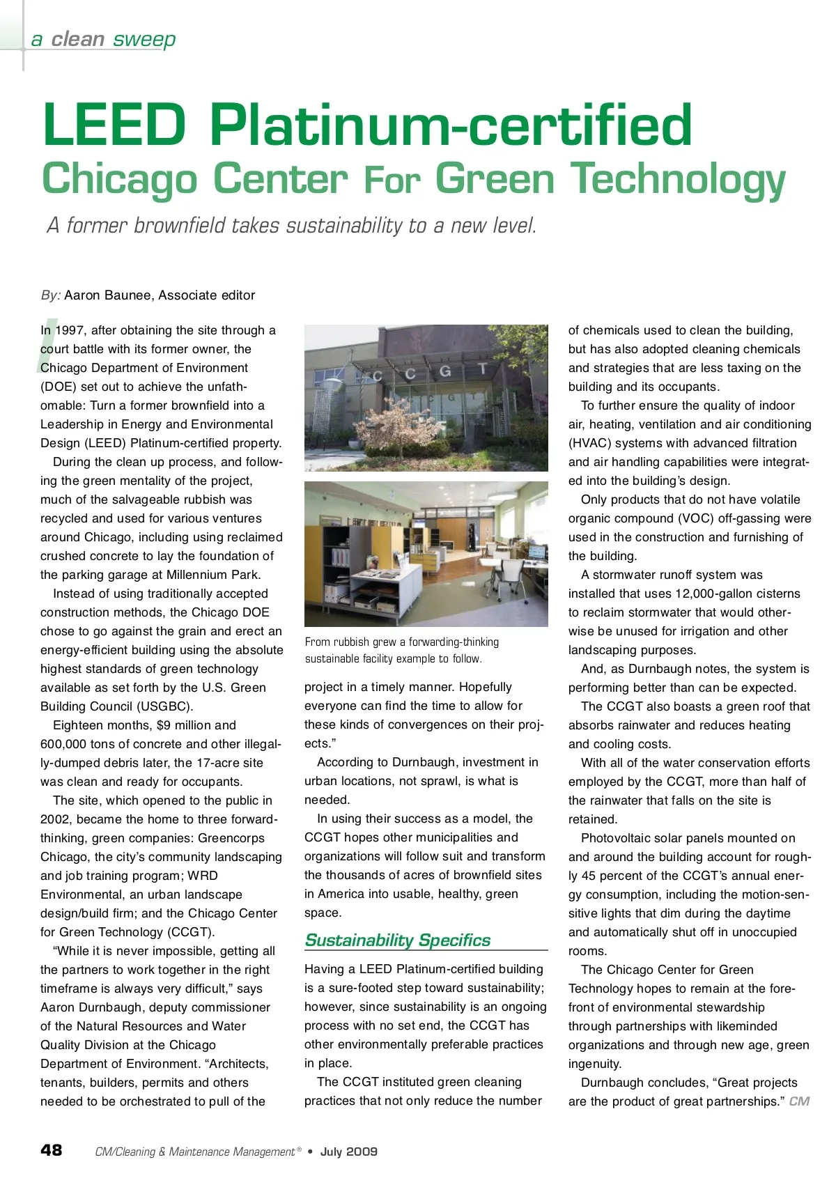 a clean sweep LEED Platinum-certified Chicago Center For Green Technology A former brownfield takes sustainability to a new level. By: Aaron Baunee, Associate editor I In 1997, after obtaining the site through a court battle with its former owner, the Chicago Department of Environment (DOE) set out to achieve the unfath-omable: Turn a former brownfield into a Leadership in Energy and Environmental Design (LEED) Platinum-certified property. During the clean up process, and follow-ing the green mentality of the project, much of the salvageable rubbish was recycled and used for various ventures around Chicago, including using reclaimed crushed concrete to lay the foundation of the parking garage at Millennium Park. Instead of using traditionally accepted construction methods, the Chicago DOE chose to go against the grain and erect an energy-efficient building using the absolute highest standards of green technology available as set forth by the U.S. Green Building Council (USGBC). Eighteen months, $9 million and 600,000 tons of concrete and other illegal-ly-dumped debris later, the 17-acre site was clean and ready for occupants. The site, which opened to the public in 2002, became the home to three forward-thinking, green companies: Greencorps Chicago, the cityʼs community landscaping and job training program; WRD Environmental, an urban landscape design/build firm; and the Chicago Center for Green Technology (CCGT). “While it is never impossible, getting all the partners to work together in the right timeframe is always very difficult,” says Aaron Durnbaugh, deputy commissioner of the Natural Resources and Water Quality Division at the Chicago Department of Environment. “Architects, tenants, builders, permits and others needed to be orchestrated to pull of the From rubbish grew a forwarding-thinking sustainable facility example to follow. project in a timely manner. Hopefully everyone can find the time to allow for these kinds of convergences on their proj-ects.” According to Durnbaugh, investment in urban locations, not sprawl, is what is needed. In using their success as a model, the CCGT hopes other municipalities and organizations will follow suit and transform the thousands of acres of brownfield sites in America into usable, healthy, green space. Sustainability Specifics Having a LEED Platinum-certified building is a sure-footed step toward sustainability; however, since sustainability is an ongoing process with no set end, the CCGT has other environmentally preferable practices in place. The CCGT instituted green cleaning practices that not only reduce the number of chemicals used to clean the building, but has also adopted cleaning chemicals and strategies that are less taxing on the building and its occupants. To further ensure the quality of indoor air, heating, ventilation and air conditioning (HVAC) systems with advanced filtration and air handling capabilities were integrat-ed into the buildingʼs design. Only products that do not have volatile organic compound (VOC) off-gassing were used in the construction and furnishing of the building. A stormwater runoff system was installed that uses 12,000-gallon cisterns to reclaim stormwater that would other-wise be unused for irrigation and other landscaping purposes. And, as Durnbaugh notes, the system is performing better than can be expected. The CCGT also boasts a green roof that absorbs rainwater and reduces heating and cooling costs. With all of the water conservation efforts employed by the CCGT, more than half of the rainwater that falls on the site is retained. Photovoltaic solar panels mounted on and around the building account for rough-ly 45 percent of the CCGTʼs annual ener-gy consumption, including the motion-sen-sitive lights that dim during the daytime and automatically shut off in unoccupied rooms. The Chicago Center for Green Technology hopes to remain at the fore-front of environmental stewardship through partnerships with likeminded organizations and through new age, green ingenuity. Durnbaugh concludes, “Great projects are the product of great partnerships.” CM 48 CM/Cleaning & Maintenance Management ® • July 2009