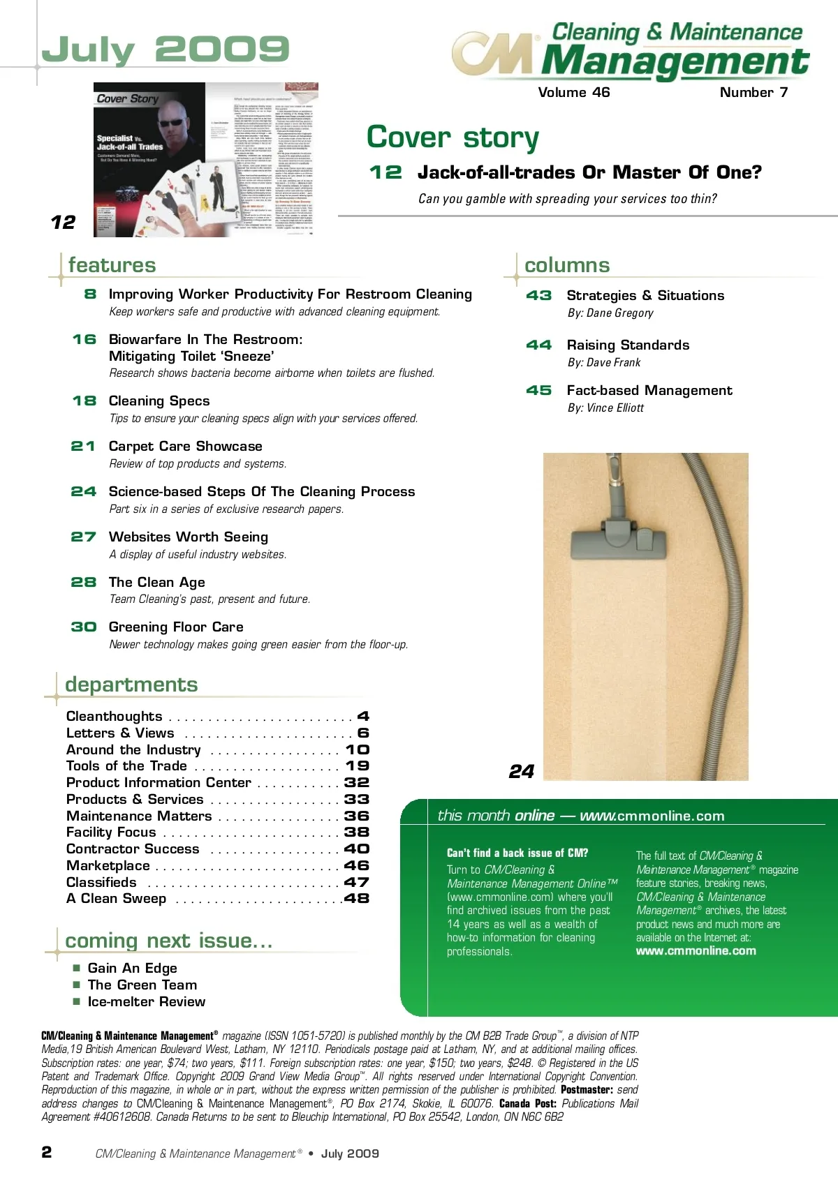 July 2009 Volume 46 Number 7 Cover story 12 Jack-of-all-trades Or Master Of One? Can you gamble with spreading your services too thin? 12 features 8 Improving Worker Productivity For Restroom Cleaning Keep workers safe and productive with advanced cleaning equipment. columns 43 Strategies & Situations By: Dane Gregory 16 Biowarfare In The Restroom: Mitigating Toilet ‘Sneeze’ Research shows bacteria become airborne when toilets are flushed. 44 45 Raising Standards By: Dave Frank 18 Cleaning Specs Tips to ensure your cleaning specs align with your services offered. Fact-based Management By: Vince Elliott 21 Carpet Care Showcase Review of top products and systems. 24 Science-based Steps Of The Cleaning Process Part six in a series of exclusive research papers. 27 Websites Worth Seeing A display of useful industry websites. 28 The Clean Age Team Cleaning’s past, present and future. 30 Greening Floor Care Newer technology makes going green easier from the floor-up. departments Cleanthoughts . . . . . . . . . . . . . . . . . . . . . . . . 4 Letters & Views . . . . . . . . . . . . . . . . . . . . . . 6 Around the Industry . . . . . . . . . . . . . . . . . 10 Tools of the Trade . . . . . . . . . . . . . . . . . . . 19 Product Information Center . . . . . . . . . . . 32 Products & Services . . . . . . . . . . . . . . . . . 33 Maintenance Matters . . . . . . . . . . . . . . . . 36 Facility Focus . . . . . . . . . . . . . . . . . . . . . . . 38 Contractor Success . . . . . . . . . . . . . . . . . 40 Marketplace . . . . . . . . . . . . . . . . . . . . . . . . 46 Classifieds . . . . . . . . . . . . . . . . . . . . . . . . . 47 A Clean Sweep . . . . . . . . . . . . . . . . . . . . . . 48 24 this month online — www. cmmonline. com Can’t find a back issue of CM? Turn to CM/Cleaning & Maintenance Management Online™ (www.cmmonline.com) where you’ll find archived issues from the past 14 years as well as a wealth of how-to information for cleaning professionals. The full text of CM/Cleaning & Maintenance Management ® magazine feature stories, breaking news, CM/Cleaning & Maintenance Management ® archives, the latest product news and much more are available on the Internet at: w w w . c m m o n l i n e . c o m coming next issue... Gain An Edge The Green Team Ice-melter Review CM/Cleaning & Maintenance Management ® magazine (ISSN 1051-5720) is published monthly by the CM B2B Trade Group ™ , a division of NTP Media,19 British American Boulevard West, Latham, NY 12110. Periodicals postage paid at Latham, NY, and at additional mailing offices. Subscription rates: one year, $74; two years, $111. Foreign subscription rates: one year, $150; two years, $248. © Registered in the US Patent and Trademark Office. Copyright 2009 Grand View Media Group ™ . All rights reserved under International Copyright Convention. Reproduction of this magazine, in whole or in part, without the express written permission of the publisher is prohibited. Postmaster: send address changes to CM/Cleaning & Maintenance Management ® , PO Box 2174, Skokie, IL 60076. Canada Post: Publications Mail Agreement #40612608. Canada Returns to be sent to Bleuchip International, PO Box 25542, London, ON N6C 6B2 2 CM/Cleaning & Maintenance Management ® • July 2009
