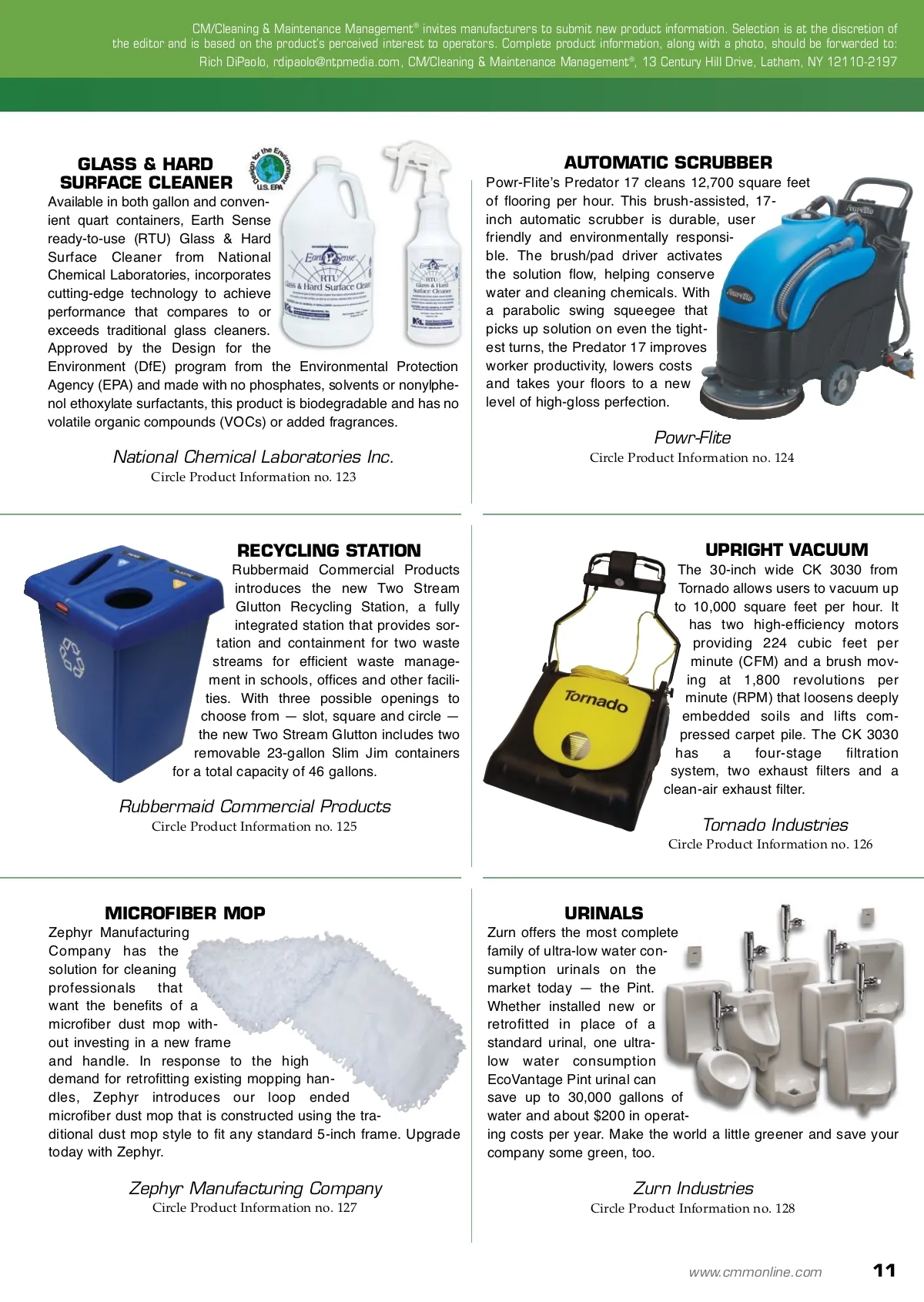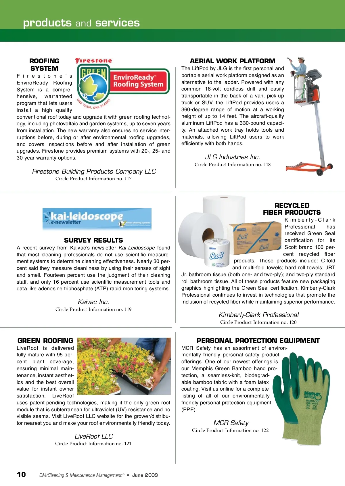 products and services ROOFING SYSTEM F i r e s t o n e ʼ s EnviroReady Roofing System is a compre-hensive, warranteed program that lets users install a high quality conventional roof today and upgrade it with green roofing technol-ogy, including photovoltaic and garden systems, up to seven years from installation. The new warranty also ensures no service inter-ruptions before, during or after environmental roofing upgrades, and covers inspections before and after installation of green upgrades. Firestone provides premium systems with 20-, 25-and 30-year warranty options. AERIAL WORK PLATFORM The LiftPod by JLG is the first personal and portable aerial work platform designed as an alternative to the ladder. Powered with any common 18-volt cordless drill and easily transportable in the back of a van, pick-up truck or SUV, the LiftPod provides users a 360-degree range of motion at a working height of up to 14 feet. The aircraft-quality aluminum LiftPod has a 330-pound capaci-ty. An attached work tray holds tools and materials, allowing LiftPod users to work efficiently with both hands. JLG Industries Inc. Circle Product Information no. 118 Firestone Building Products Company LLC Circle Product Information no. 117 RECYCLED FIBER PRODUCTS Kimberly-Clark Professional has received Green Seal certification for its Scott brand 100 per-cent recycled fiber products. These products include: C-fold and multi-fold towels; hard roll towels; JRT Jr. bathroom tissue (both one-and two-ply); and two-ply standard roll bathroom tissue. All of these products feature new packaging graphics highlighting the Green Seal certification. Kimberly-Clark Professional continues to invest in technologies that promote the inclusion of recycled fiber while maintaining superior performance. SURVEY RESULTS A recent survey from Kaivacʼs newsletter Kai-Leidoscope found that most cleaning professionals do not use scientific measure-ment systems to determine cleaning effectiveness. Nearly 30 per-cent said they measure cleanliness by using their senses of sight and smell. Fourteen percent use the judgment of their cleaning staff, and only 16 percent use scientific measurement tools and data like adenosine triphosphate (ATP) rapid monitoring systems. Kaivac Inc. Circle Product Information no. 119 Kimberly-Clark Professional Circle Product Information no. 120 GREEN ROOFING LiveRoof is delivered fully mature with 95 per-cent plant coverage, ensuring minimal main-tenance, instant aesthet-ics and the best overall value for instant owner satisfaction. LiveRoof uses patent-pending technologies, making it the only green roof module that is subterranean for ultraviolet (UV) resistance and no visible seams. Visit LiveRoof LLC website for the grower/distribu-tor nearest you and make your roof environmentally friendly today. PERSONAL PROTECTION EQUIPMENT MCR Safety has an assortment of environ-mentally friendly personal safety product offerings. One of our newest offerings is our Memphis Green Bamboo hand pro-tection, a seamless-knit, biodegrad-able bamboo fabric with a foam latex coating. Visit us online for a complete listing of all of our environmentally friendly personal protection equipment (PPE). MCR Safety Circle Product Information no. 122 LiveRoof LLC Circle Product Information no. 121 10 CM/Cleaning & Maintenance Management ® • June 2009