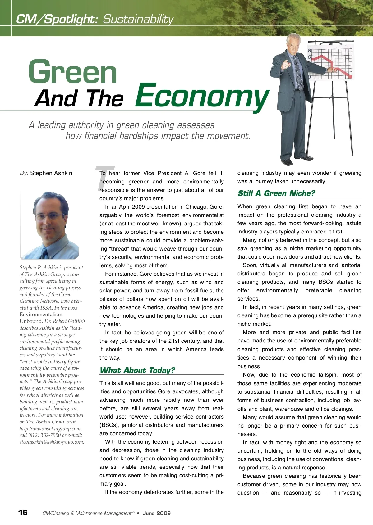 CM/Spotlight: Sustainability Green And The Economy cleaning industry may even wonder if greening was a journey taken unnecessarily. A leading authority in green cleaning assesses how financial hardships impact the movement. By: Stephen Ashkin T Stephen P. Ashkin is president of The Ashkin Group, a con-sulting firm specializing in greening the cleaning process and founder of the Green Cleaning Network, now oper-ated with ISSA. In the book Environmentalism Unbound, Dr. Robert Gottlieb describes Ashkin as the “lead-ing advocate for a stronger environmental profile among cleaning product manufactur-ers and suppliers” and the “most visible industry figure advancing the cause of envi-ronmentally preferable prod-ucts.” The Ashkin Group pro-vides green consulting services for school districts as well as building owners, product man-ufacturers and cleaning con-tractors. For more information on The Ashkin Group visit http://www.ashkingroup.com, call (812) 332-7950 or e-mail: [email protected]. To hear former Vice President Al Gore tell it, becoming greener and more environmentally responsible is the answer to just about all of our countryʼs major problems. In an April 2009 presentation in Chicago, Gore, arguably the worldʼs foremost environmentalist (or at least the most well-known), argued that tak-ing steps to protect the environment and become more sustainable could provide a problem-solv-ing “thread” that would weave through our coun-tryʼs security, environmental and economic prob-lems, solving most of them. For instance, Gore believes that as we invest in sustainable forms of energy, such as wind and solar power, and turn away from fossil fuels, the billions of dollars now spent on oil will be avail-able to advance America, creating new jobs and new technologies and helping to make our coun-try safer. In fact, he believes going green will be one of the key job creators of the 21st century, and that it should be an area in which America leads the way. Still A Green Niche? When green cleaning first began to have an impact on the professional cleaning industry a few years ago, the most forward-looking, astute industry players typically embraced it first. Many not only believed in the concept, but also saw greening as a niche marketing opportunity that could open new doors and attract new clients. Soon, virtually all manufacturers and janitorial distributors began to produce and sell green cleaning products, and many BSCs started to offer environmentally preferable cleaning services. In fact, in recent years in many settings, green cleaning has become a prerequisite rather than a niche market. More and more private and public facilities have made the use of environmentally preferable cleaning products and effective cleaning prac-tices a necessary component of winning their business. Now, due to the economic tailspin, most of those same facilities are experiencing moderate to substantial financial difficulties, resulting in all forms of business contraction, including job lay-offs and plant, warehouse and office closings. Many would assume that green cleaning would no longer be a primary concern for such busi-nesses. In fact, with money tight and the economy so uncertain, holding on to the old ways of doing business, including the use of conventional clean-ing products, is a natural response. Because green cleaning has historically been customer driven, some in our industry may now question — and reasonably so — if investing What About Today? This is all well and good, but many of the possibil-ities and opportunities Gore advocates, although advancing much more rapidly now than ever before, are still several years away from real-world use; however, building service contractors (BSCs), janitorial distributors and manufacturers are concerned today. With the economy teetering between recession and depression, those in the cleaning industry need to know if green cleaning and sustainability are still viable trends, especially now that their customers seem to be making cost-cutting a pri-mary goal. If the economy deteriorates further, some in the 16 CM/Cleaning & Maintenance Management ® • June 2009