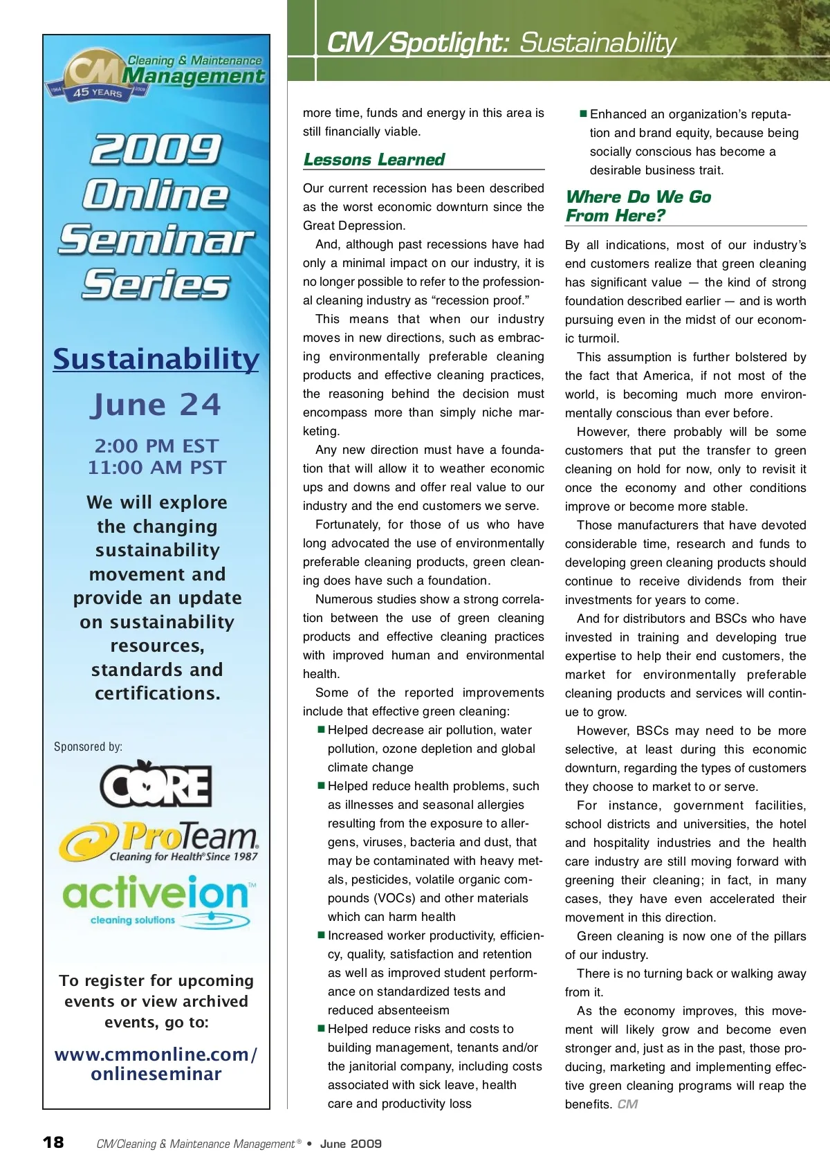CM/Spotlight: Sustainability more time, funds and energy in this area is still financially viable. Enhanced an organizationʼs reputa-tion and brand equity, because being socially conscious has become a desirable business trait. Lessons Learned Our current recession has been described as the worst economic downturn since the Great Depression. And, although past recessions have had only a minimal impact on our industry, it is no longer possible to refer to the profession-al cleaning industry as “recession proof.” This means that when our industry moves in new directions, such as embrac-ing environmentally preferable cleaning products and effective cleaning practices, the reasoning behind the decision must encompass more than simply niche mar-keting. Any new direction must have a founda-tion that will allow it to weather economic ups and downs and offer real value to our industry and the end customers we serve. Fortunately, for those of us who have long advocated the use of environmentally preferable cleaning products, green clean-ing does have such a foundation. Numerous studies show a strong correla-tion between the use of green cleaning products and effective cleaning practices with improved human and environmental health. Some of the reported improvements include that effective green cleaning: Helped decrease air pollution, water pollution, ozone depletion and global climate change Helped reduce health problems, such as illnesses and seasonal allergies resulting from the exposure to aller-gens, viruses, bacteria and dust, that may be contaminated with heavy met-als, pesticides, volatile organic com-pounds (VOCs) and other materials which can harm health Increased worker productivity, efficien-cy, quality, satisfaction and retention as well as improved student perform-ance on standardized tests and reduced absenteeism Helped reduce risks and costs to building management, tenants and/or the janitorial company, including costs associated with sick leave, health care and productivity loss Where Do We Go From Here? By all indications, most of our industryʼs end customers realize that green cleaning has significant value — the kind of strong foundation described earlier — and is worth pursuing even in the midst of our econom-ic turmoil. This assumption is further bolstered by the fact that America, if not most of the world, is becoming much more environ-mentally conscious than ever before. However, there probably will be some customers that put the transfer to green cleaning on hold for now, only to revisit it once the economy and other conditions improve or become more stable. Those manufacturers that have devoted considerable time, research and funds to developing green cleaning products should continue to receive dividends from their investments for years to come. And for distributors and BSCs who have invested in training and developing true expertise to help their end customers, the market for environmentally preferable cleaning products and services will contin-ue to grow. However, BSCs may need to be more selective, at least during this economic downturn, regarding the types of customers they choose to market to or serve. For instance, government facilities, school districts and universities, the hotel and hospitality industries and the health care industry are still moving forward with greening their cleaning; in fact, in many cases, they have even accelerated their movement in this direction. Green cleaning is now one of the pillars of our industry. There is no turning back or walking away from it. As the economy improves, this move-ment will likely grow and become even stronger and, just as in the past, those pro-ducing, marketing and implementing effec-tive green cleaning programs will reap the benefits. CM Sustainability June 24 2:00 PM EST 11:00 AM PST We will explore the changing sustainability movement and provide an update on sustainability resources, standards and certifications. Sponsored by: To register for upcoming events or view archived events, go to: www.cmmonline.com/ onlineseminar 18 CM/Cleaning & Maintenance Management ® • June 2009