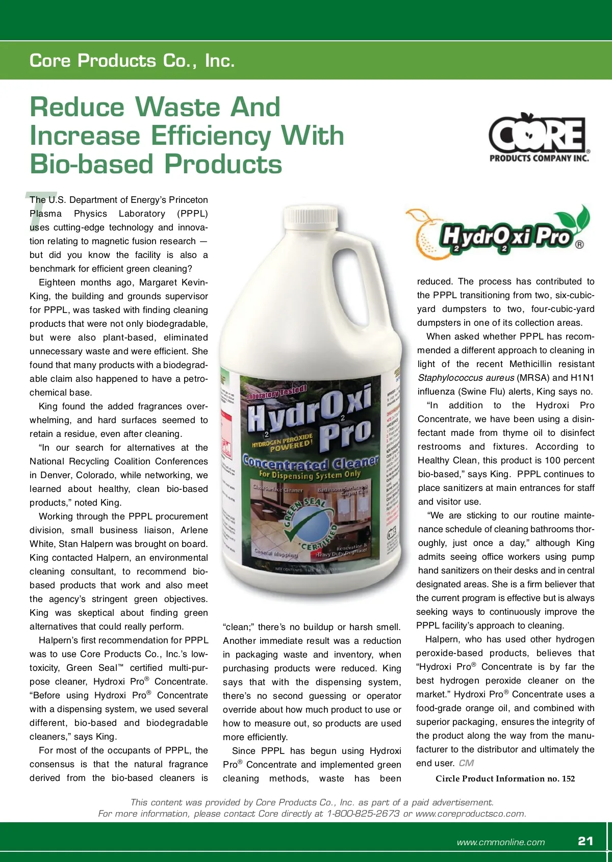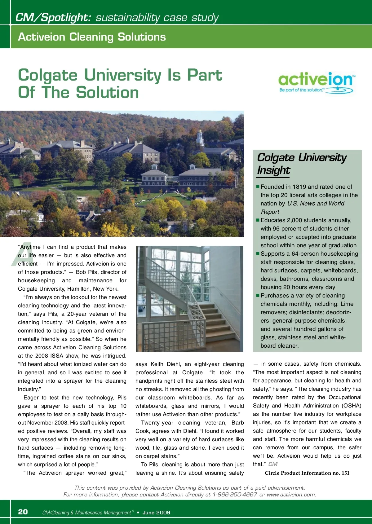 CM/Spotlight: sustainability case study Activeion Cleaning Solutions Colgate University Is Part Of The Solution Colgate University Insight Founded in 1819 and rated one of the top 20 liberal arts colleges in the nation by U.S. News and World Report Educates 2,800 students annually, with 96 percent of students either employed or accepted into graduate school within one year of graduation Supports a 64-person housekeeping staff responsible for cleaning glass, hard surfaces, carpets, whiteboards, desks, bathrooms, classrooms and housing 20 hours every day Purchases a variety of cleaning chemicals monthly, including: Lime removers; disinfectants; deodoriz-ers; general-purpose chemicals; and several hundred gallons of glass, stainless steel and white-board cleaner. says Keith Diehl, an eight-year cleaning professional at Colgate. “It took the handprints right off the stainless steel with no streaks. It removed all the ghosting from our classroom whiteboards. As far as whiteboards, glass and mirrors, I would rather use Activeion than other products.” Twenty-year cleaning veteran, Barb Cook, agrees with Diehl. “I found it worked very well on a variety of hard surfaces like wood, tile, glass and stone. I even used it on carpet stains.” To Pils, cleaning is about more than just leaving a shine. Itʼs about ensuring safety — in some cases, safety from chemicals. “The most important aspect is not cleaning for appearance, but cleaning for health and safety,” he says. “The cleaning industry has recently been rated by the Occupational Safety and Health Administration (OSHA) as the number five industry for workplace injuries, so itʼs important that we create a safe atmosphere for our students, faculty and staff. The more harmful chemicals we can remove from our campus, the safer weʼll be. Activeion would help us do just that.” CM Circle Product Information no. 151 A “Anytime I can find a product that makes our life easier — but is also effective and efficient — Iʼm impressed. Activeion is one of those products.” — Bob Pils, director of housekeeping and maintenance for Colgate University, Hamilton, New York. “Iʼm always on the lookout for the newest cleaning technology and the latest innova-tion,” says Pils, a 20-year veteran of the cleaning industry. “At Colgate, weʼre also committed to being as green and environ-mentally friendly as possible.” So when he came across Activeion Cleaning Solutions at the 2008 ISSA show, he was intrigued. “Iʼd heard about what ionized water can do in general, and so I was excited to see it integrated into a sprayer for the cleaning industry.” Eager to test the new technology, Pils gave a sprayer to each of his top 10 employees to test on a daily basis through-out November 2008. His staff quickly report-ed positive reviews. “Overall, my staff was very impressed with the cleaning results on hard surfaces — including removing long-time, ingrained coffee stains on our sinks, which surprised a lot of people.” “The Activeion sprayer worked great,” This content was provided by Activeion Cleaning Solutions as part of a paid advertisement. For more information, please contact Activeion directly at 1-866-950-4667 or www.activeion.com. 20 CM/Cleaning & Maintenance Management ® • June 2009