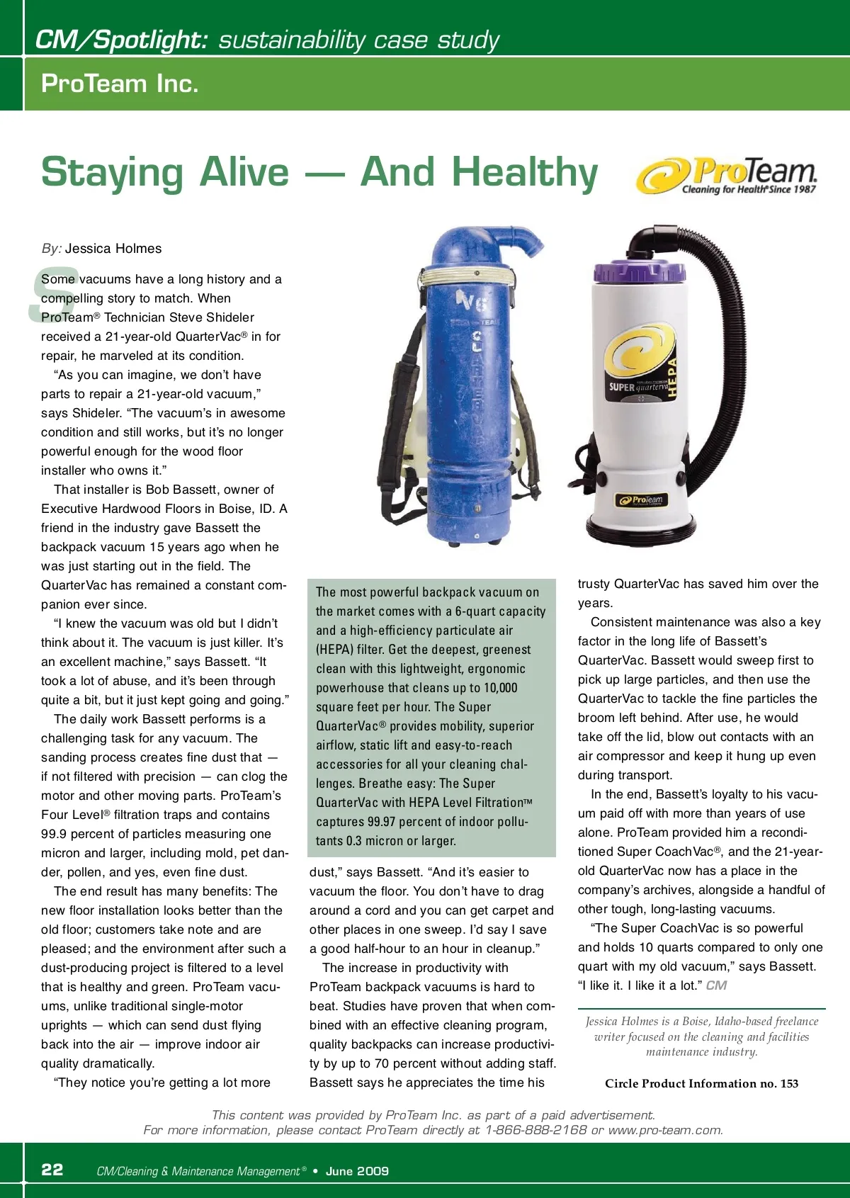 CM/Spotlight: sustainability case study ProTeam Inc. Staying Alive — And Healthy By: Jessica Holmes S Some vacuums have a long history and a compelling story to match. When ProTeam ® Technician Steve Shideler received a 21-year-old QuarterVac ® in for repair, he marveled at its condition. “As you can imagine, we donʼt have parts to repair a 21-year-old vacuum,” says Shideler. “The vacuumʼs in awesome condition and still works, but itʼs no longer powerful enough for the wood floor installer who owns it.” That installer is Bob Bassett, owner of Executive Hardwood Floors in Boise, ID. A friend in the industry gave Bassett the backpack vacuum 15 years ago when he was just starting out in the field. The QuarterVac has remained a constant com-panion ever since. “I knew the vacuum was old but I didnʼt think about it. The vacuum is just killer. Itʼs an excellent machine,” says Bassett. “It took a lot of abuse, and itʼs been through quite a bit, but it just kept going and going.” The daily work Bassett performs is a challenging task for any vacuum. The sanding process creates fine dust that — if not filtered with precision — can clog the motor and other moving parts. ProTeamʼs Four Level ® filtration traps and contains 99.9 percent of particles measuring one micron and larger, including mold, pet dan-der, pollen, and yes, even fine dust. The end result has many benefits: The new floor installation looks better than the old floor; customers take note and are pleased; and the environment after such a dust-producing project is filtered to a level that is healthy and green. ProTeam vacu-ums, unlike traditional single-motor uprights — which can send dust flying back into the air — improve indoor air quality dramatically. “They notice youʼre getting a lot more The most powerful backpack vacuum on the market comes with a 6-quart capacity and a high-efficiency particulate air (HEPA) filter. Get the deepest, greenest clean with this lightweight, ergonomic powerhouse that cleans up to 10,000 square feet per hour. The Super QuarterVac ® provides mobility, superior airflow, static lift and easy-to-reach accessories for all your cleaning chal-lenges. Breathe easy: The Super QuarterVac with HEPA Level Filtration ™ captures 99.97 percent of indoor pollu-tants 0.3 micron or larger. dust,” says Bassett. “And itʼs easier to vacuum the floor. You donʼt have to drag around a cord and you can get carpet and other places in one sweep. Iʼd say I save a good half-hour to an hour in cleanup.” The increase in productivity with ProTeam backpack vacuums is hard to beat. Studies have proven that when com-bined with an effective cleaning program, quality backpacks can increase productivi-ty by up to 70 percent without adding staff. Bassett says he appreciates the time his trusty QuarterVac has saved him over the years. Consistent maintenance was also a key factor in the long life of Bassettʼs QuarterVac. Bassett would sweep first to pick up large particles, and then use the QuarterVac to tackle the fine particles the broom left behind. After use, he would take off the lid, blow out contacts with an air compressor and keep it hung up even during transport. In the end, Bassettʼs loyalty to his vacu-um paid off with more than years of use alone. ProTeam provided him a recondi-tioned Super CoachVac ® , and the 21-year-old QuarterVac now has a place in the companyʼs archives, alongside a handful of other tough, long-lasting vacuums. “The Super CoachVac is so powerful and holds 10 quarts compared to only one quart with my old vacuum,” says Bassett. “I like it. I like it a lot.” CM Jessica Holmes is a Boise, Idaho-based freelance writer focused on the cleaning and facilities maintenance industry. Circle Product Information no. 153 This content was provided by ProTeam Inc. as part of a paid advertisement. For more information, please contact ProTeam directly at 1-866-888-2168 or www.pro-team.com. 22 CM/Cleaning & Maintenance Management ® • June 2009