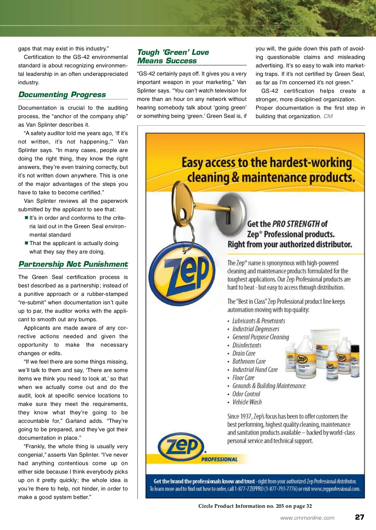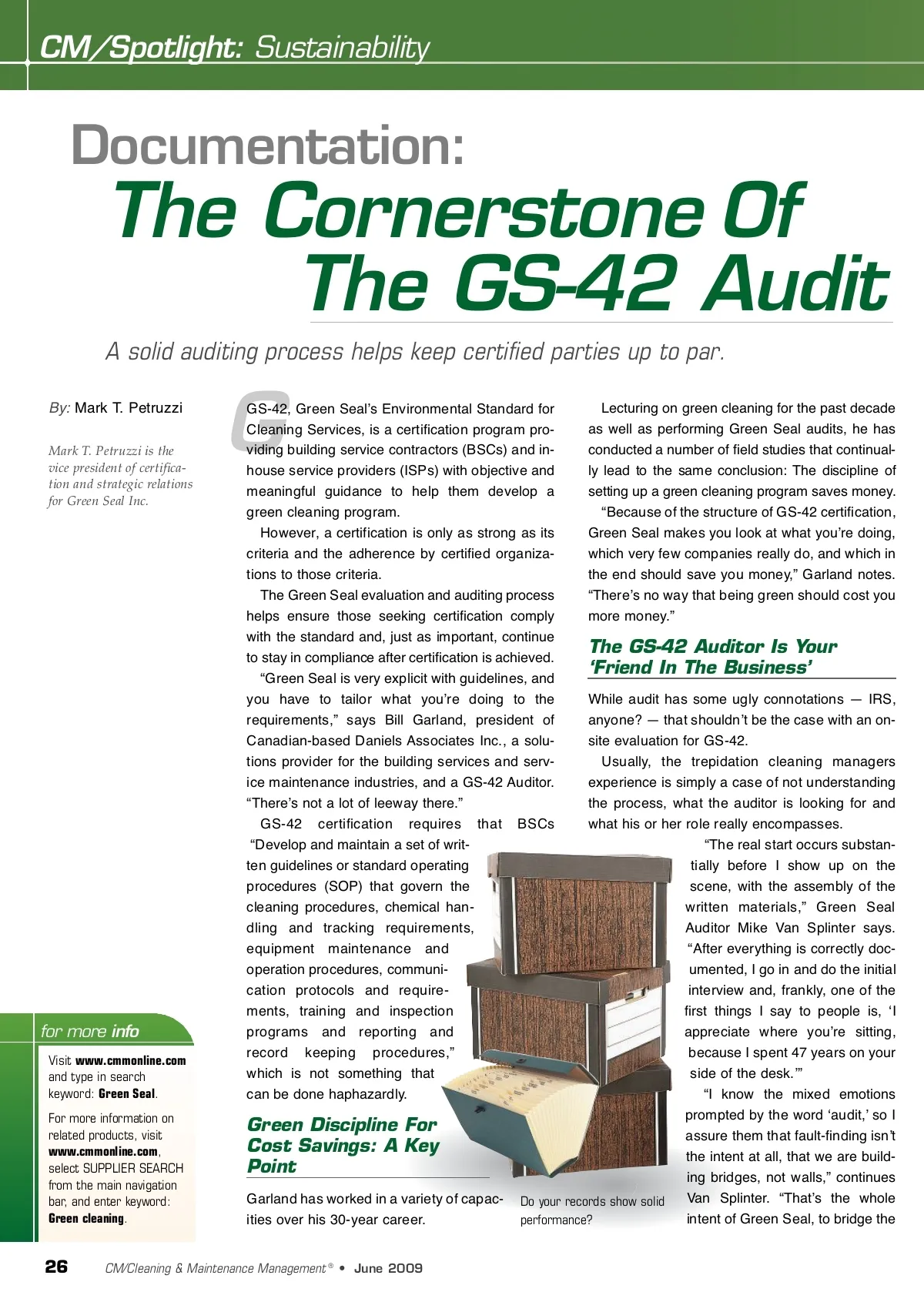 CM/Spotlight: Sustainability Documentation: The Cornerstone Of The GS-42 Audit A solid auditing process helps keep certified parties up to par. By: Mark T. Petruzzi Mark T. Petruzzi is the vice president of certifica-tion and strategic relations for Green Seal Inc. G for more info Visit www.cmmonline.com and type in search keyword: Green Seal . For more information on related products, visit www.cmmonline.com , select SUPPLIER SEARCH from the main navigation bar, and enter keyword: Green cleaning . GS-42, Green Sealʼs Environmental Standard for Cleaning Services, is a certification program pro-viding building service contractors (BSCs) and in-house service providers (ISPs) with objective and meaningful guidance to help them develop a green cleaning program. However, a certification is only as strong as its criteria and the adherence by certified organiza-tions to those criteria. The Green Seal evaluation and auditing process helps ensure those seeking certification comply with the standard and, just as important, continue to stay in compliance after certification is achieved. “Green Seal is very explicit with guidelines, and you have to tailor what youʼre doing to the requirements,” says Bill Garland, president of Canadian-based Daniels Associates Inc., a solu-tions provider for the building services and serv-ice maintenance industries, and a GS-42 Auditor. “Thereʼs not a lot of leeway there.” GS-42 certification requires that BSCs “Develop and maintain a set of writ-ten guidelines or standard operating procedures (SOP) that govern the cleaning procedures, chemical han-dling and tracking requirements, equipment maintenance and operation procedures, communi-cation protocols and require-ments, training and inspection programs and reporting and record keeping procedures,” which is not something that can be done haphazardly. Lecturing on green cleaning for the past decade as well as performing Green Seal audits, he has conducted a number of field studies that continual-ly lead to the same conclusion: The discipline of setting up a green cleaning program saves money. “Because of the structure of GS-42 certification, Green Seal makes you look at what youʼre doing, which very few companies really do, and which in the end should save you money,” Garland notes. “Thereʼs no way that being green should cost you more money.” The GS-42 Auditor Is Your ‘Friend In The Business’ Green Discipline For Cost Savings: A Key Point Garland has worked in a variety of capac-ities over his 30-year career. While audit has some ugly connotations — IRS, anyone? — that shouldnʼt be the case with an on-site evaluation for GS-42. Usually, the trepidation cleaning managers experience is simply a case of not understanding the process, what the auditor is looking for and what his or her role really encompasses. “The real start occurs substan-tially before I show up on the scene, with the assembly of the written materials,” Green Seal Auditor Mike Van Splinter says. “After everything is correctly doc-umented, I go in and do the initial interview and, frankly, one of the first things I say to people is, ʻI appreciate where youʼre sitting, because I spent 47 years on your side of the desk.ʼ” “I know the mixed emotions prompted by the word ʻaudit,ʼ so I assure them that fault-finding isnʼt the intent at all, that we are build-ing bridges, not walls,” continues Van Splinter. “Thatʼs the whole Do your records show solid intent of Green Seal, to bridge the performance? 26 CM/Cleaning & Maintenance Management ® • June 2009